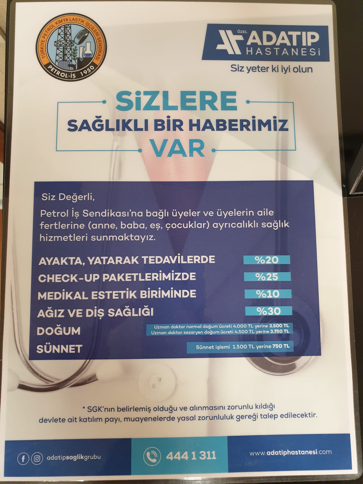 Sendikamızda örgütlü üyelerimizin ve birinci derece yakınlarının, uygun koşullarda nitelikli sağlık hizmeti alabilmesi için ADATIP Hastanesi ile kurumsal anlaşma yapılmıştır. Anlaşma İstanbul 2 Nolu Şube Yönetimimiz ve ADATIP Hastanesi yetkilileri arasında imzalandı.