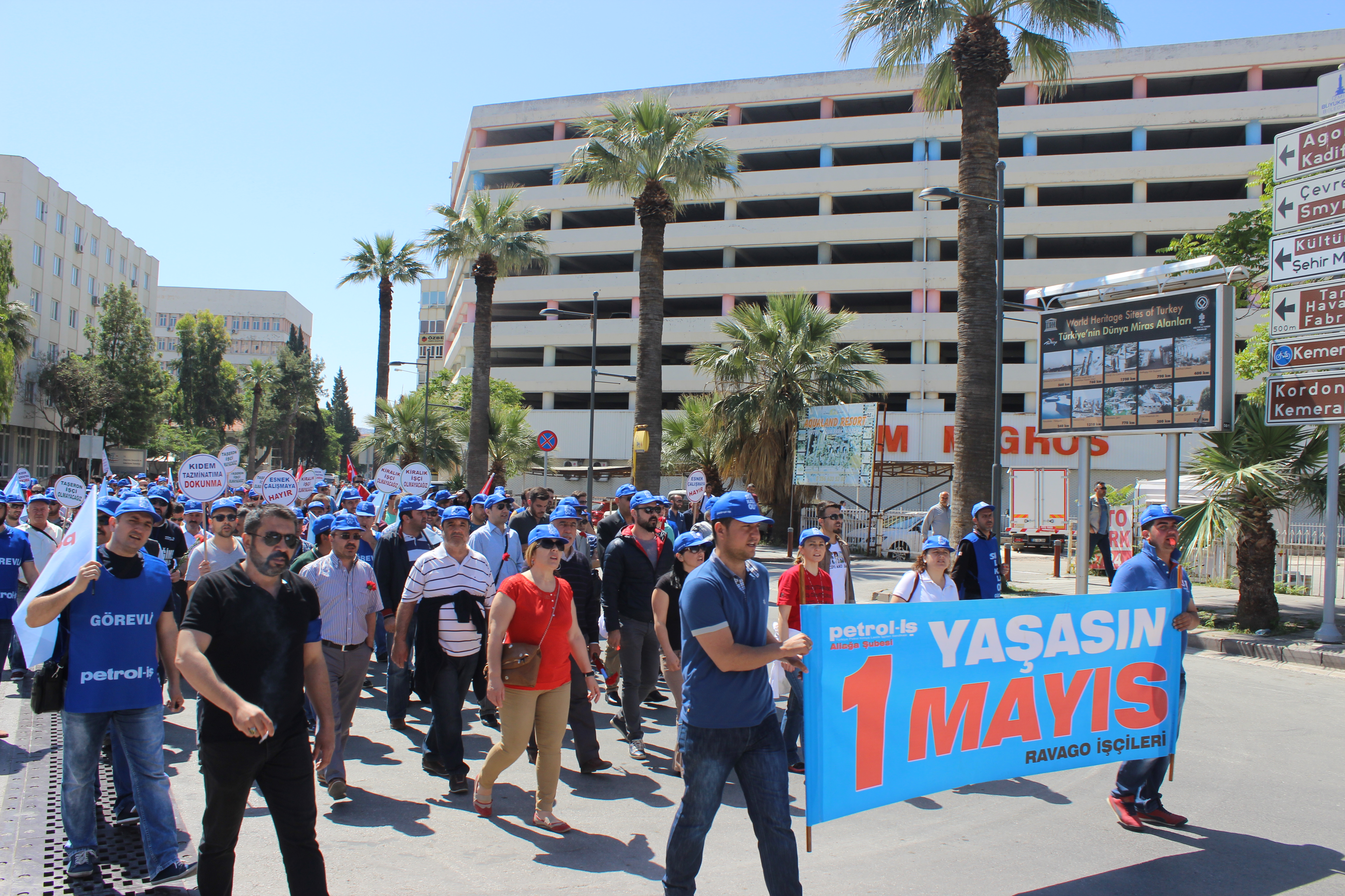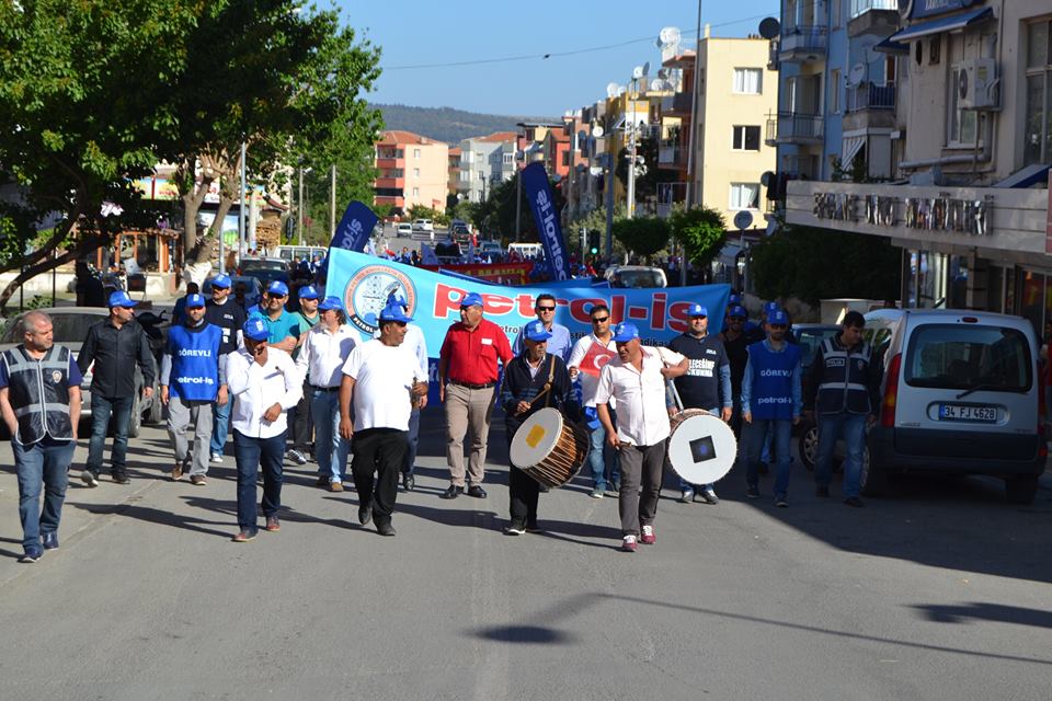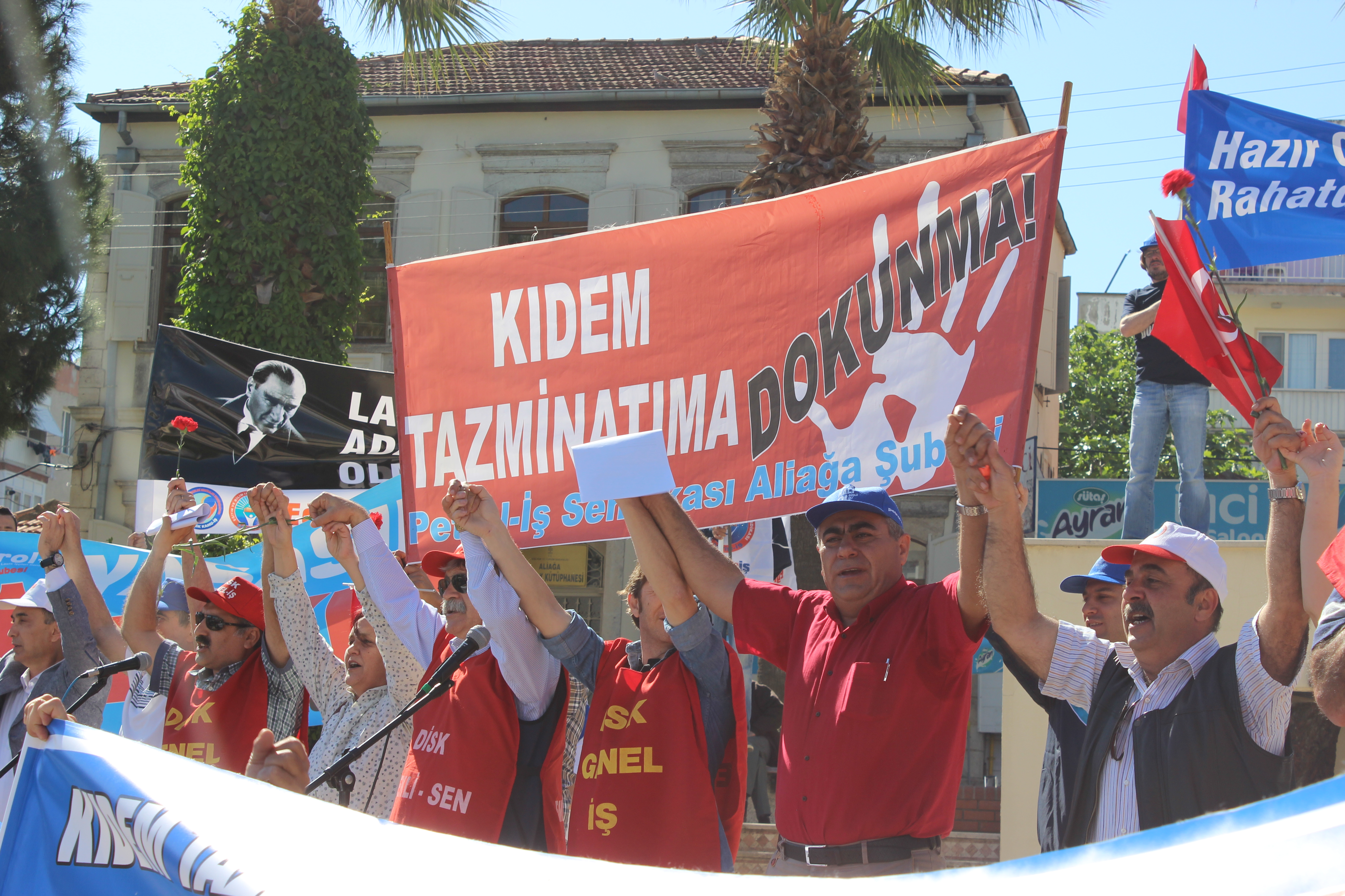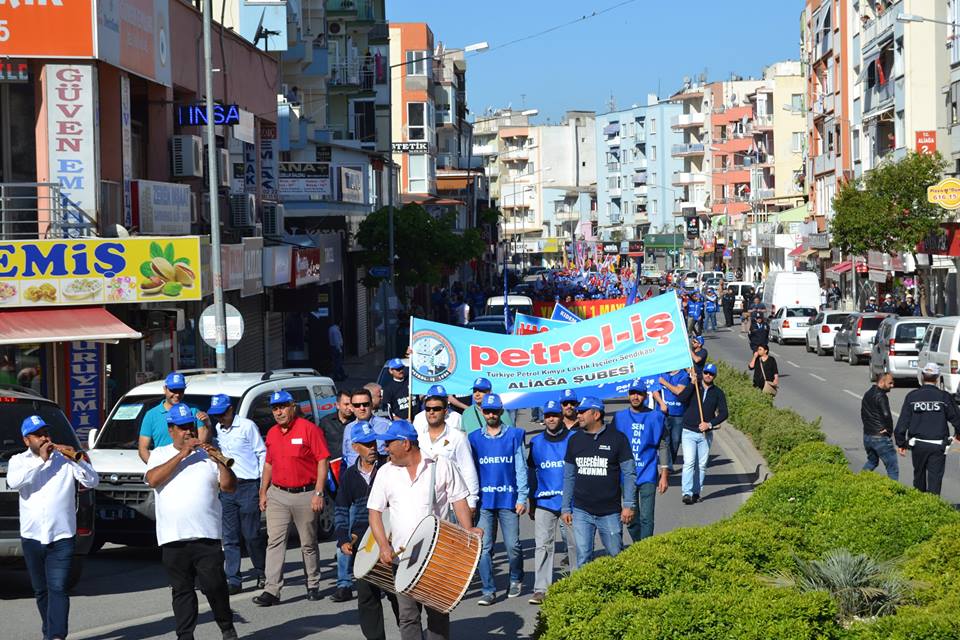 Aliağa Şubemiz işçi sınıfının Uluslararası Birlik, Mücadele ve Dayanışma Günü 1 Mayıs’ı, sabahın erken saatlerinden itibaren örgütlü olduğu işyerlerinden üyelerimizin katılımıyla halaylar eşliğinde kutlamaya başladı. Vardiyadan çıkan üyelerimiz ve Emek ve Demokrasi Platformu bileşenleriyle Şube önünde buluşarak, ‘Yaşasın 1 Mayıs”, “İşte 1 Mayıs Alanlardayız”, sloganlarıyla Aliağa Demokrasi Meydanı’na kortej eşliğinde yürüdü. Esnaf ve vatandaşın alkışlarıyla destek verdiği işçiler; “İş Ekmek Yoksa Barış da Yok”, “Direne Direne Kazanacağız”, “Kölelik Yasanı Al Başına Çal”, “Yaşasın 1 Mayıs Alanlardayız” sloganları attılar.