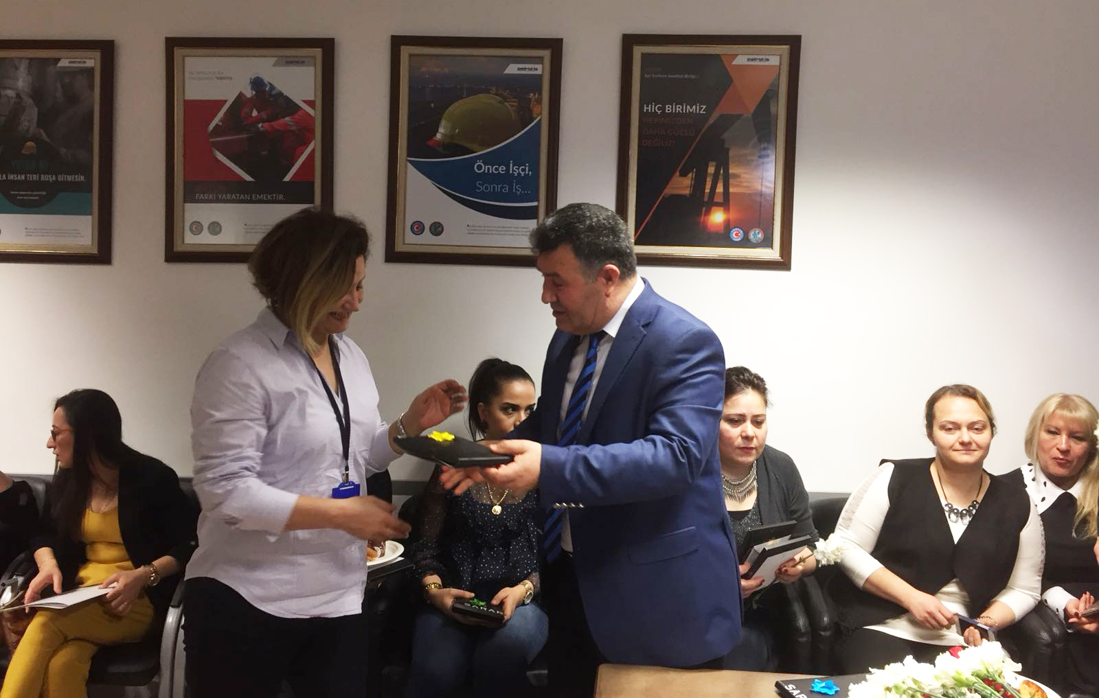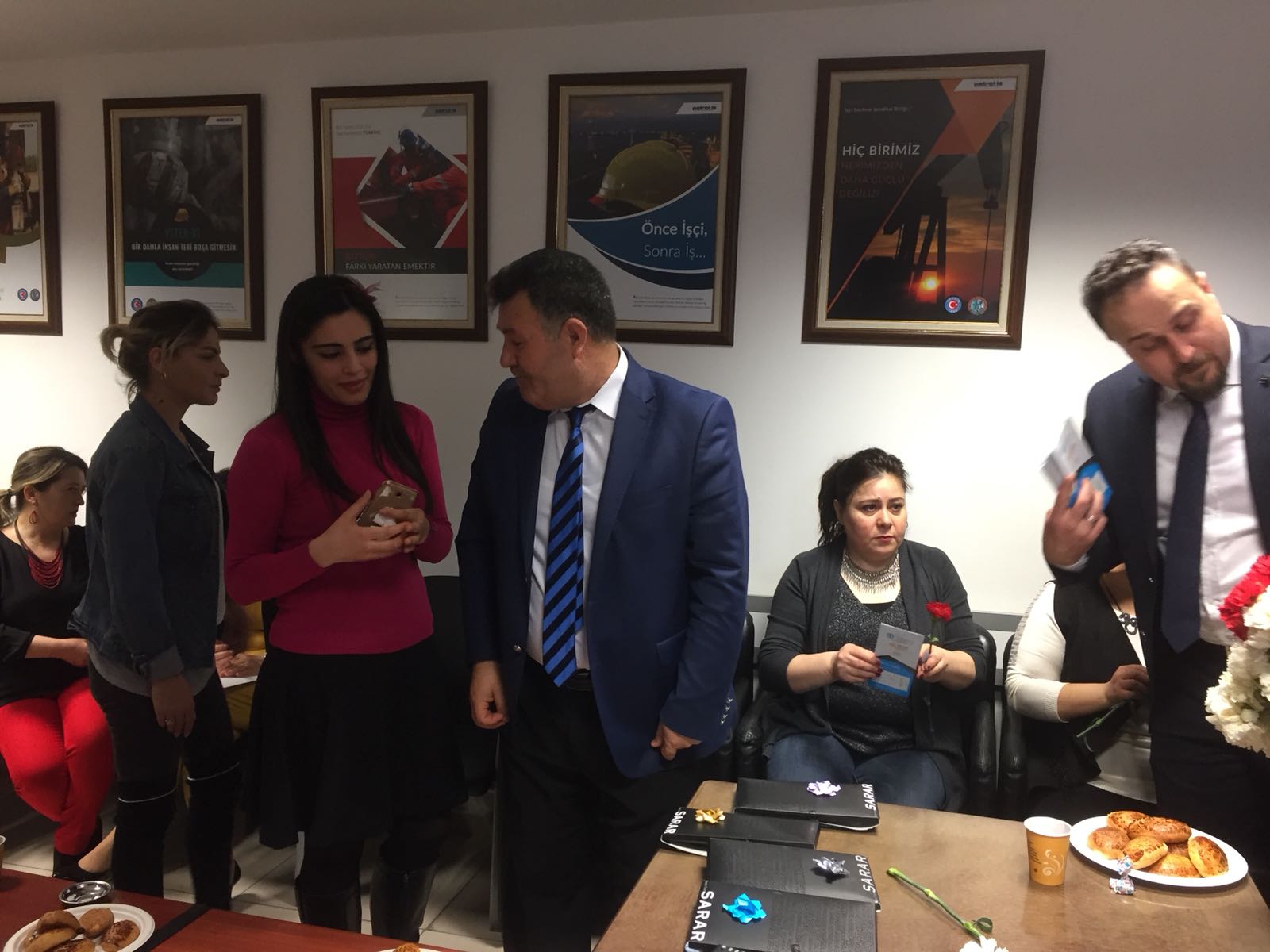 Ankara Şube Başkan Yardımcımız Sabri Polat Botaş Genel Müdürlüğü’nde Botaş Genel Müdürü Burhan Özcan, Baştemsilci Fahrettin Özkan, Temsilcilerimiz Yavuz Katırancı, Erdal Bağcı ve Mehmet Karaaslan’ın katılımıyla Doğalgaz İşletme ve Piyasa İşlemleri Bölge Müdürlüğü (Yapracık)işyerlerindeki kadın üyelerimizin yoğun katılımıyla kutladı.Şube Başkan Yardımcımız Sabri Polat kadın üyelerimize karanfil dağıttı.