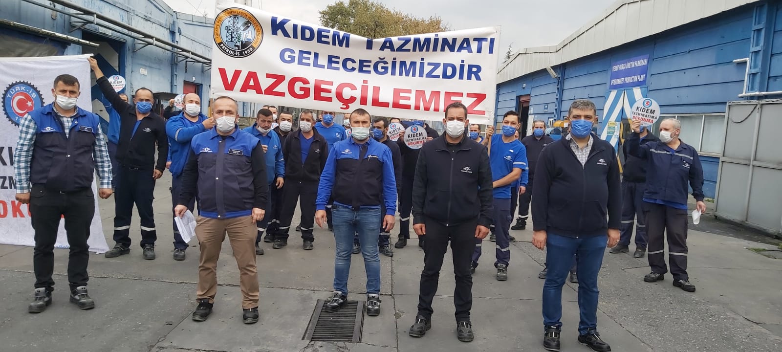 Sendikamız Düzce Şubesinde torba yasaya karşı eylem yapıldı.10 Kasım Salı günü şubemizin örgütlü olduğu Standard Profil 1 ve Standard Profil 2 Fabrikalarında çalışan üyelerimiz yaptıkları basın açıklaması kazanılmış haklarında herhangi bir geriye gidişe izin vermeyeceklerini belirttiler. Basın açıklamasında “Kıdem Tazminatımız Geleceğimizdir! Vazgeçilmez”, “Kıdem Tazminatıma Dokunma” pankartı kullanıldı.