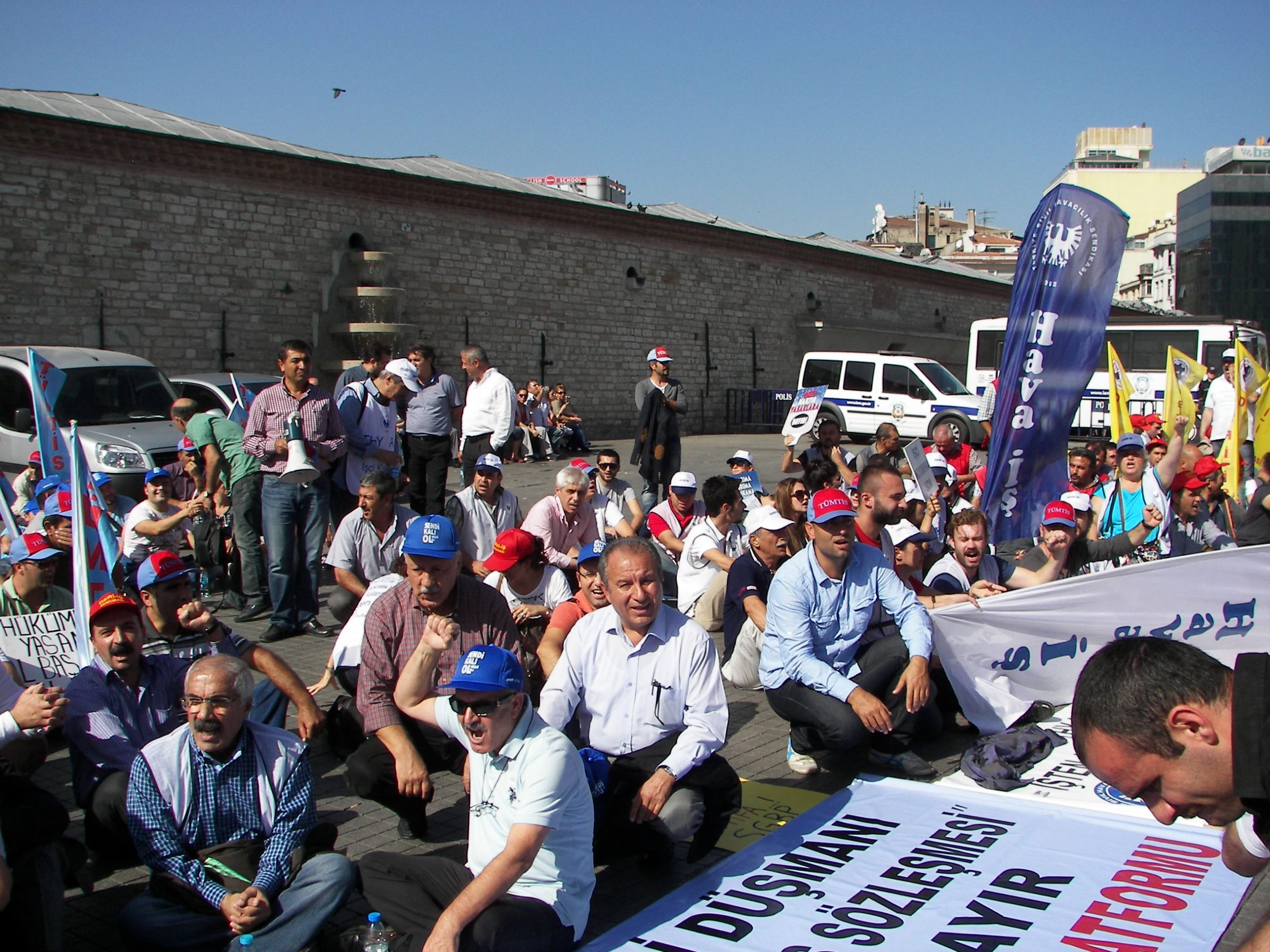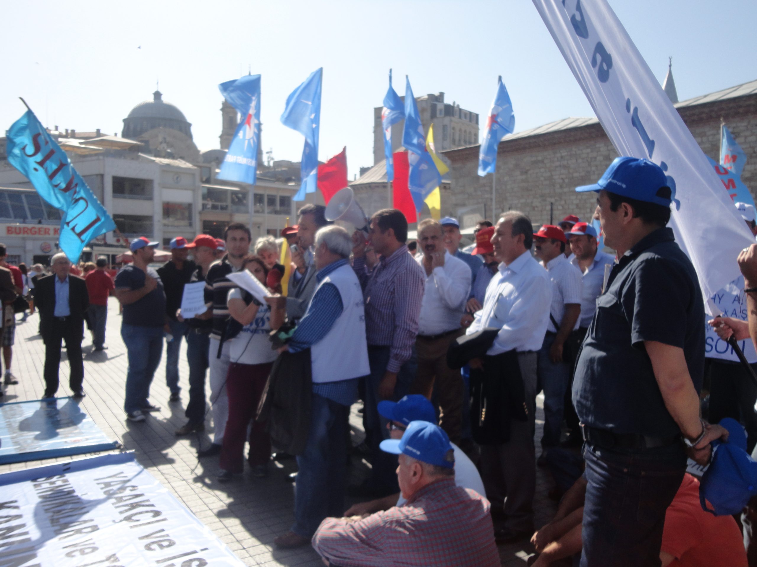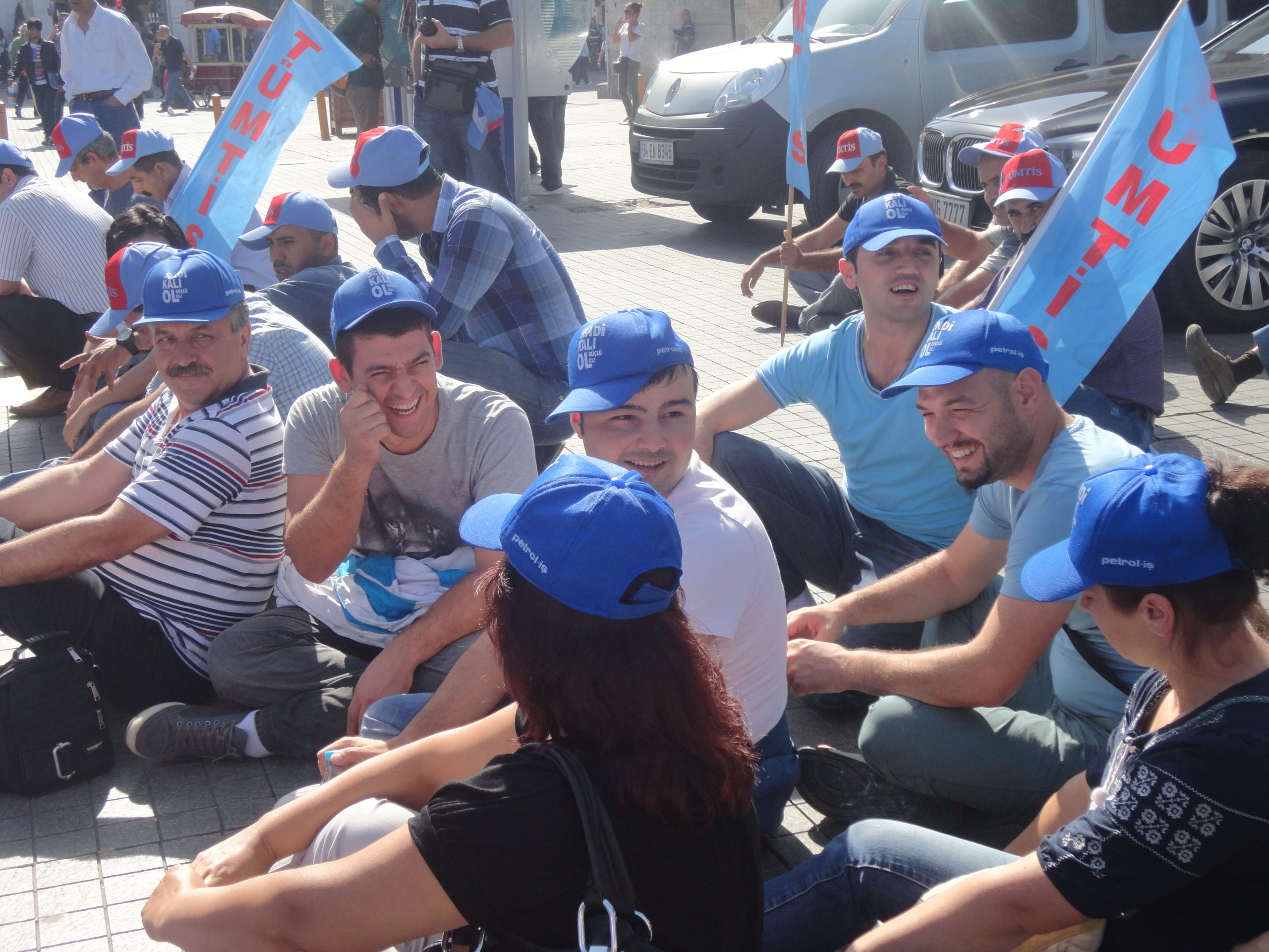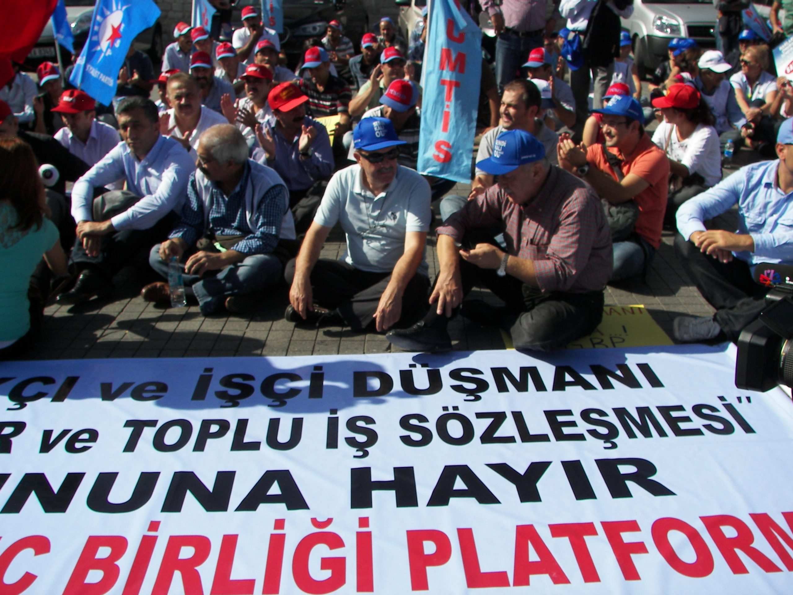 Sendikal Güç Birliği Platformu (SGBP), patron kuruluşlarının talepleri doğrultusunda hazırlanan, ancak Türk-İş ve Hak-İş yönetimlerinin de imzaladıkları protokolle destekledikleri “Sendikalar ve Toplu İş Sözleşmesi Yasa Tasarısı”nı 16 Ekim Salı günü Türkiye genelinde yapılan çeşitli eylemlerle bir kez daha protesto etti. Sabahleyin SGBP’nin bileşeni sendikaların örgütlü olduğu işyerlerinde 1 saat iş bırakıldı, tasarıyla ilgili bildiriler okundu. Aynı gün saat 13.00’den itibaren başta İstanbul – Taksim olmak üzere, Ankara, İzmir, Bursa, Adana, G.Antep gibi merkezlerde de oturma eylemleri yapıldı. Taksim’de yapılan eyleme Genel Mali Sekreterimiz İbrahim Doğangül, Genel Yönetim Sekreterimiz Ahmet Kabaca, şube başkan, yönetici ve işyeri temsilcilerimizle Petrol-İş üyesi işçiler de katıldı.