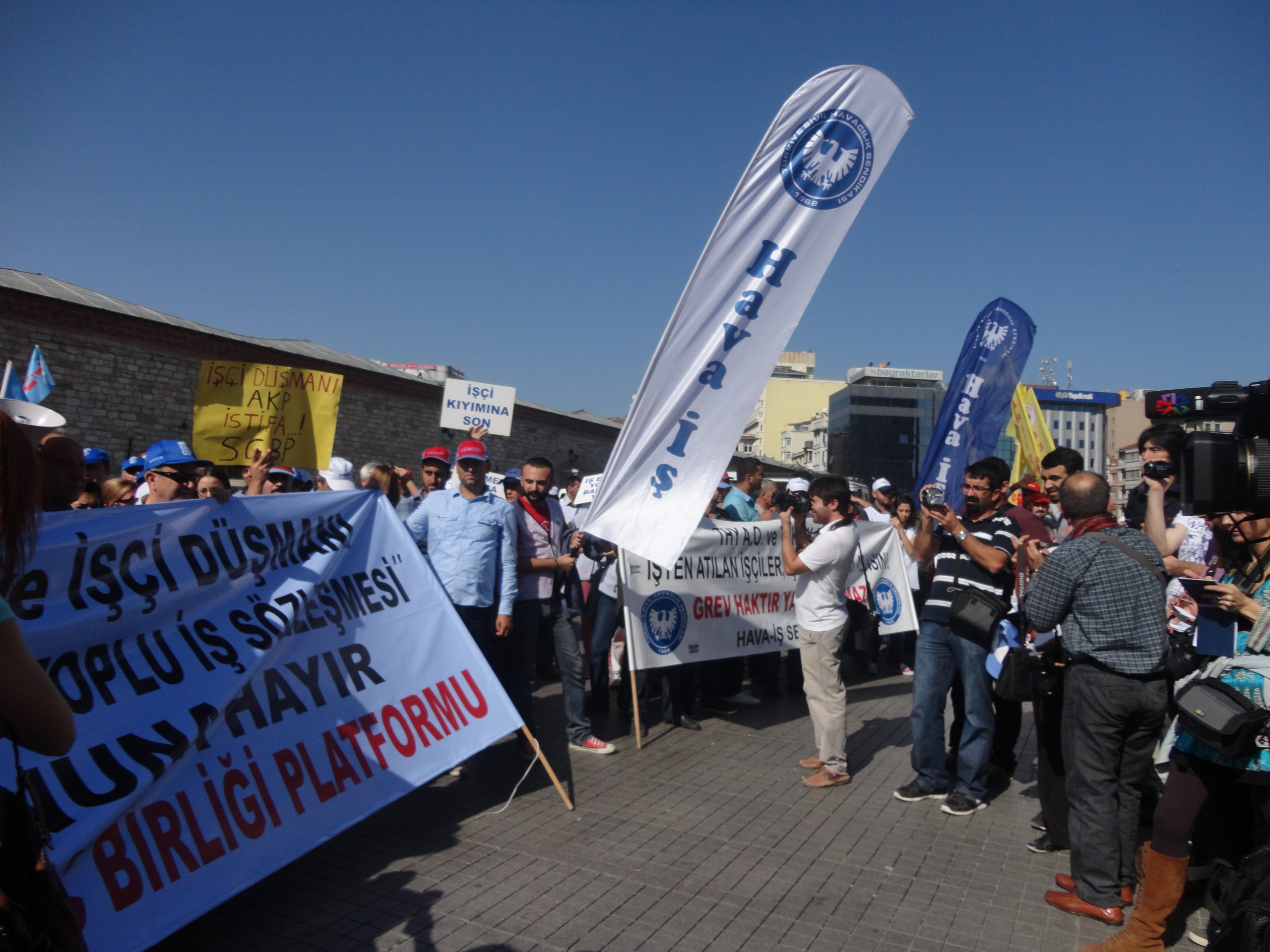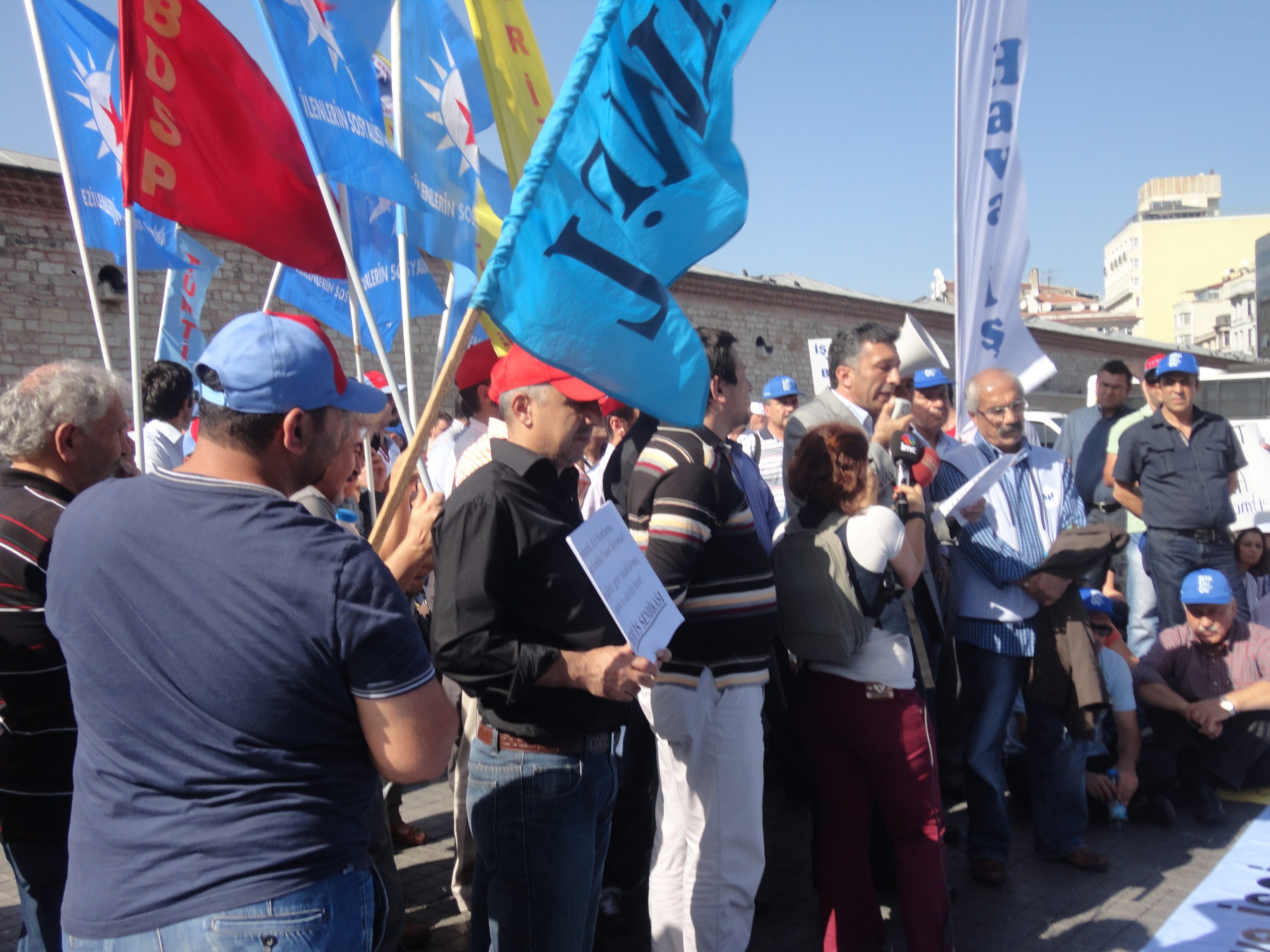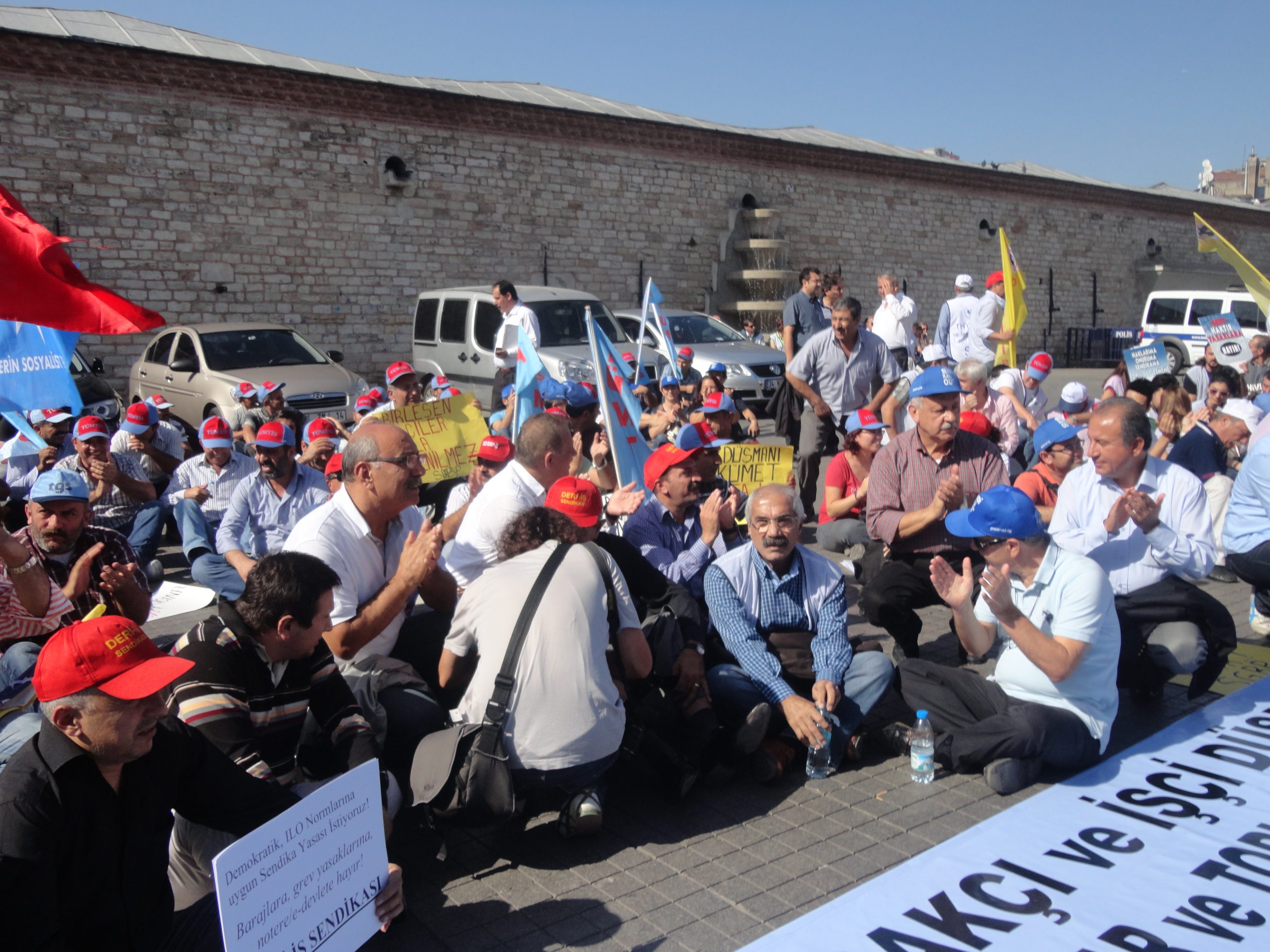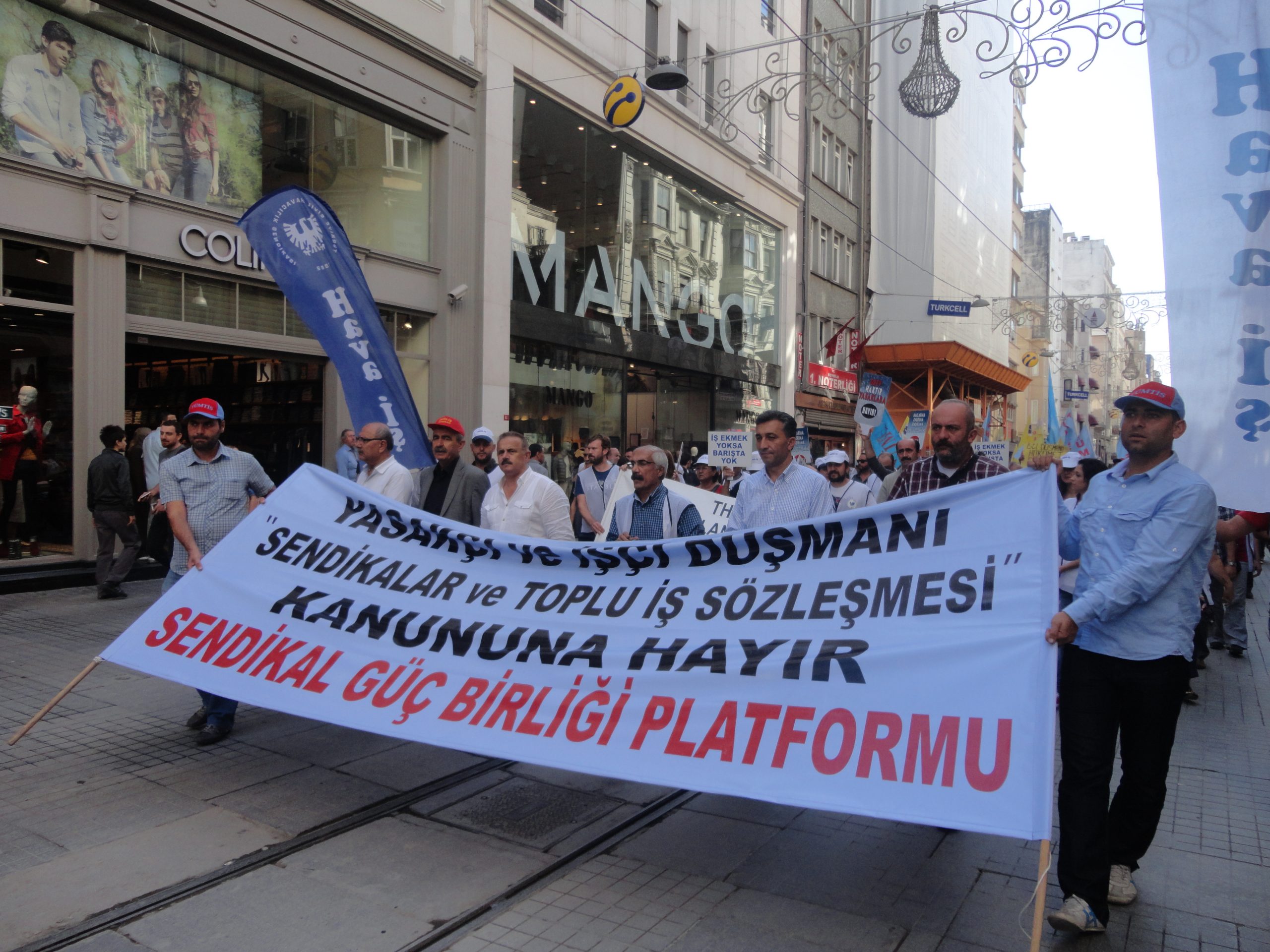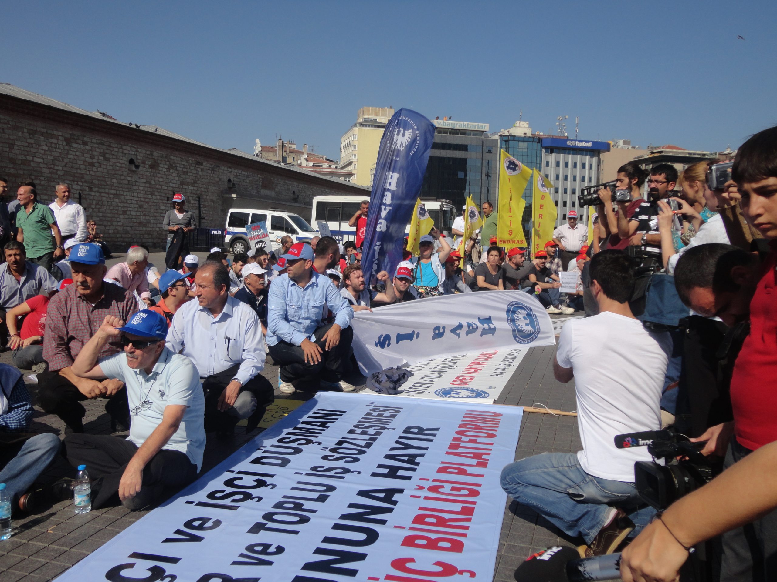 Sendikal Güç Birliği Platformu (SGBP) Dönem Sözcüsü ve TÜMTİS Genel Başkanı Kenan Öztürk, Taksim’de yapılan oturma eyleminde yaptığı basın açıklamasında, işçi düşmanı yasa tasarısını kabul etmediklerini belirterek, “Türkiye Büyük Millet Meclisi, çalışma yaşamını ve sendikal hayatı ciddi biçimde değiştirecek bir yasa tasarıyı görüşüyor. Aylardır toplu sözleşme hakkımızı bu yasayı bahane ederek gasp eden, yetki işlemlerini dondurup işçileri sözleşmesiz bırakan iktidar, şimdi büyük bir hızla, işveren örgütlerinin dikte ettiği maddeleri meclisten geçirmek için yoğun mesai yapıyor. Bu yasa ile bütün sendikal güvenceler elimizden alınıyor, barajlarla sendikalar bitiriliyor, grev yasakları devam ettiriliyor” dedi.