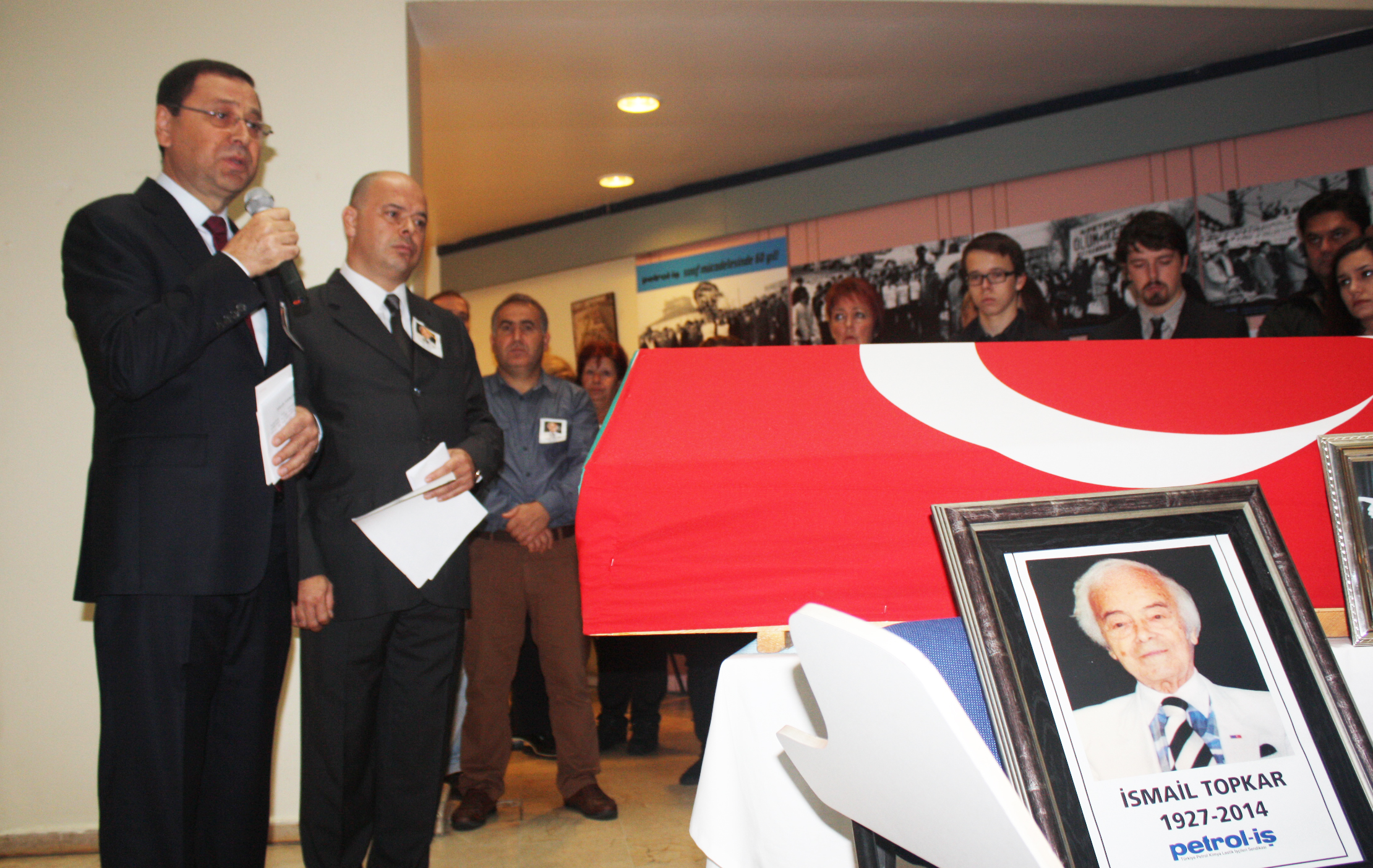 Duanın ardından söz alan Petrol-İş Sendikası Genel Başkanı Mustafa Öztaşkın, İsmail Topkar’ın ailesi yakınları ve Petrol-İş camiasına başsağlığı dileyerek başladığı konuşmasını, Topkar’ın sendikacılık geçmişini anlatarak sürdürdü. İsmail Topkar’ın Zonguldak Kömür İşletmeleri’nde makine ressamı olarak işe başladığını, 1952 yılında Petrol-Ofisi’nin Çubuklu deposunda çalışırken de sendikacılığa adım attığını, belirttikten sonra konuşmasını şöyle sürdürdü: “ Topkar sendikacı olarak kendini iyi yetiştirmişti. 1962’de sendikamızda yöneticilik yaparken aynı zamanda Türk-İş’in 1. Bölge temsilciliğini yürütüyordu. İtalya, Almanya, Hollanda ve Amerika’da yapılan sendikacılık seminerlerine katılarak bilgisini arttırdı. İCFTU’nun Genel Kuruluna Türk işçilerinin temsilcisi olarak katıldı. 1968- 1978 arasında sendikamızın genel başkanlığını yürütttü. Dönemi grevlerin sendikal değişimin yoğun olduğu bir dönemdi.” Topkar’ın sendikal dayanışmayı önemsediğinin de altını çizen Genel Başkanımız, 1966 yılında Paşabahçe Şişecam Fabrikası Grevi’nde o zaman Türk-İş 1. Bölge Temsilciliğini sürdüren Topkar’ın büyük emeği olduğuna da dikkat çekti.