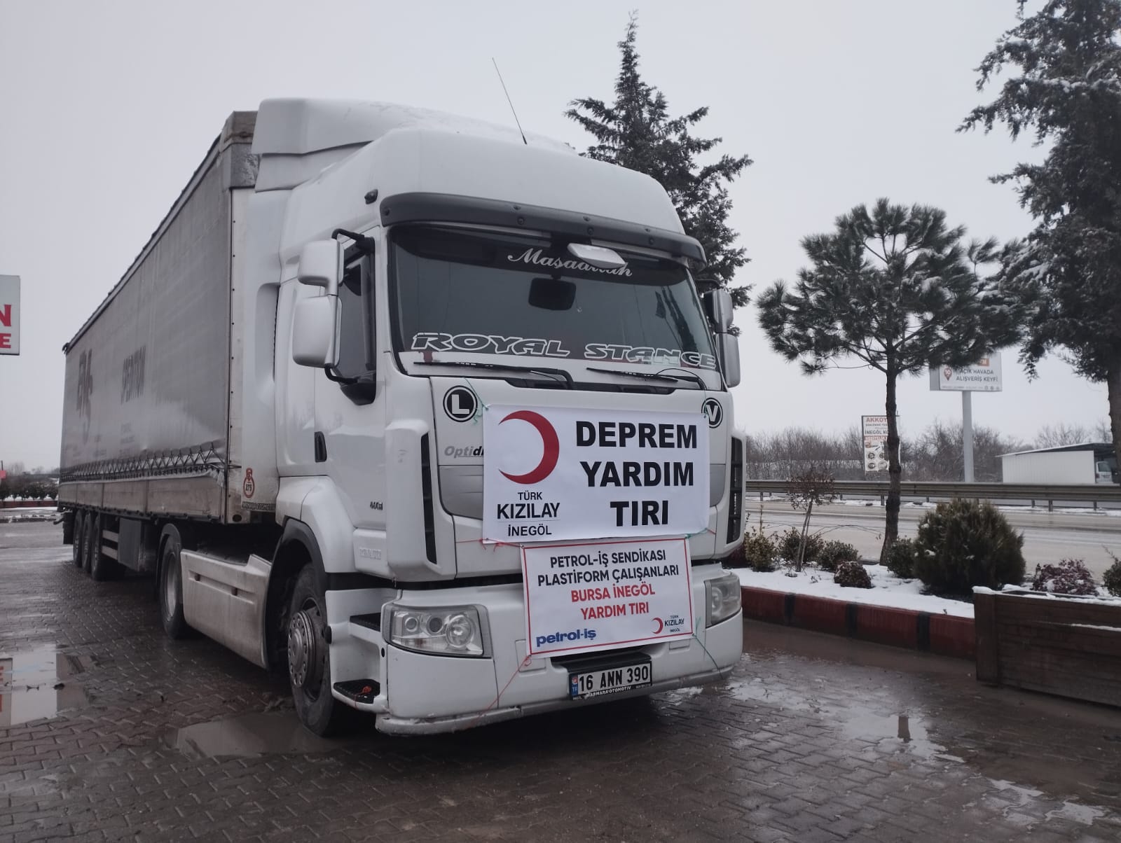 Merkez üssünün Kahramanmaraş’ın Pazarcık ilçesi olan ve 7.7 şiddetinde gerçekleşen ve başta Adıyaman, Adana, Hatay, Diyarbakır, Gaziantep, Kilis, Malatya, Osmaniye, Şanlıurfa olmak üzere bölgedeki birçok şehirde kayıplar verdiğimiz depremin ardından yaraları sarmak üzere genel merkezimiz başta olmak üzere şubelerimiz tarafından depremzede vatandaşlarımıza ulaştırılmak üzere yardımlar düzenlenmektedir. Bursa Şubemizin örgütlü olduğu Plastiform işyerinde çalışan üyelerimiz de ihtiyaçlar doğrultusunda hazırladıkları yardım malzemelerini deprem bölgesine gönderdiler.