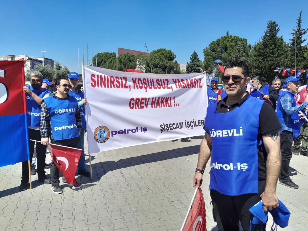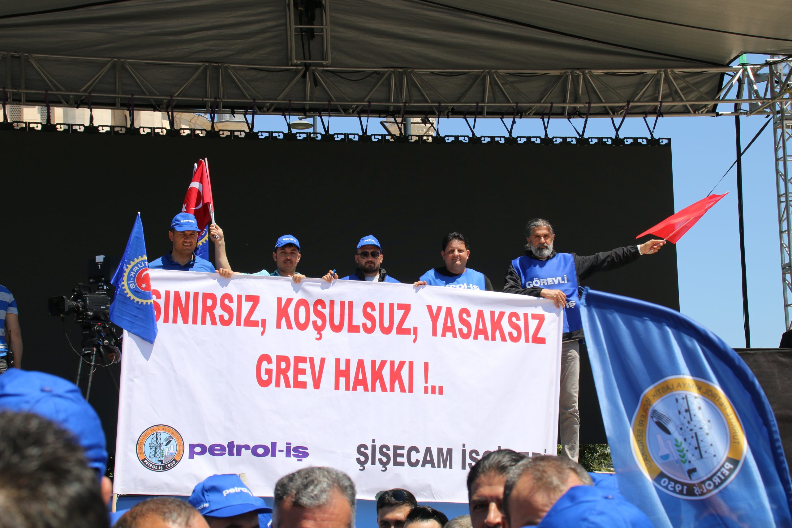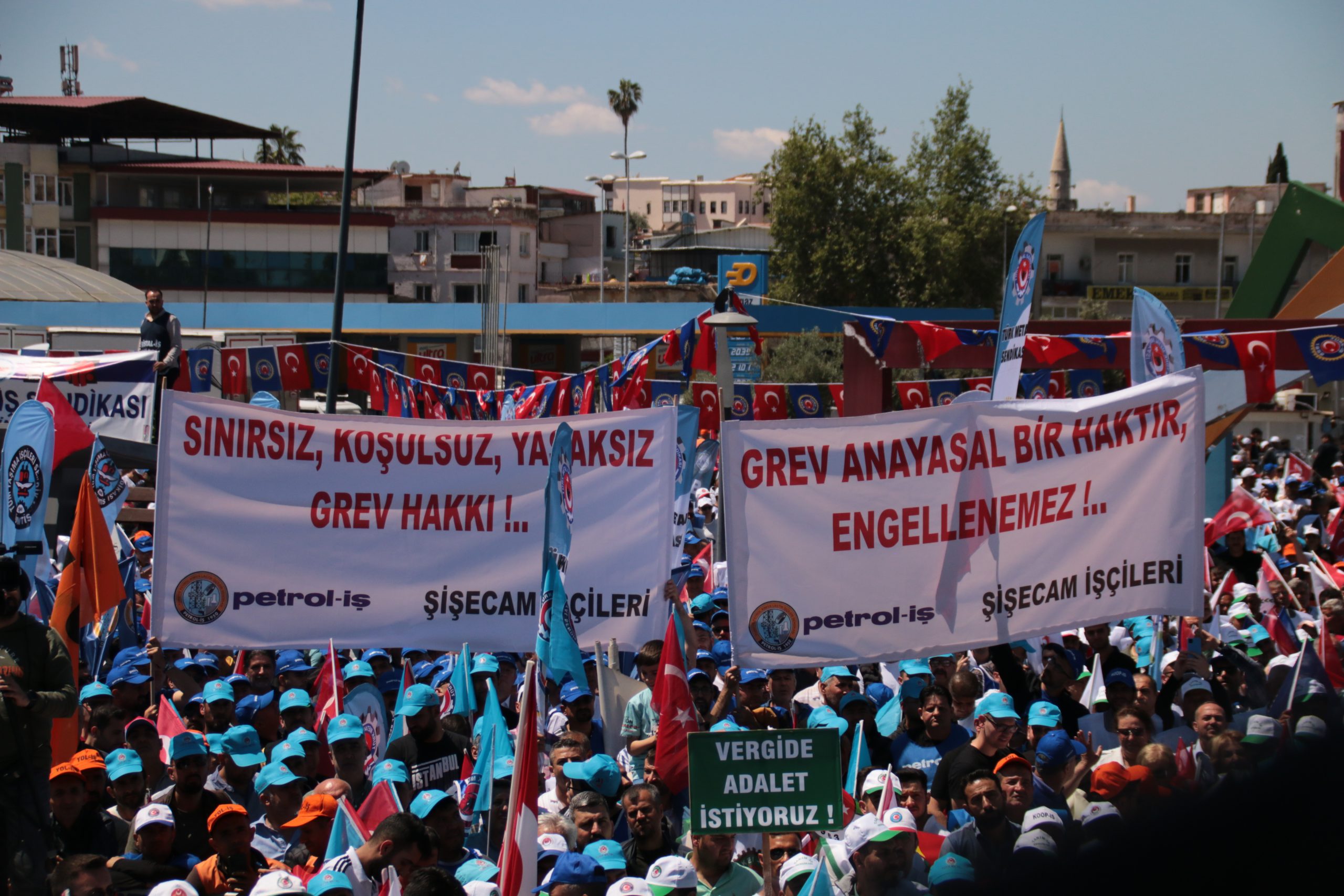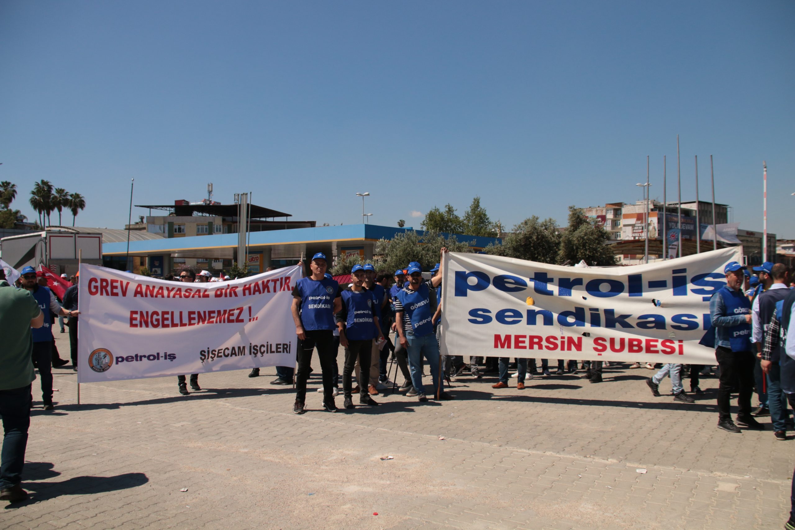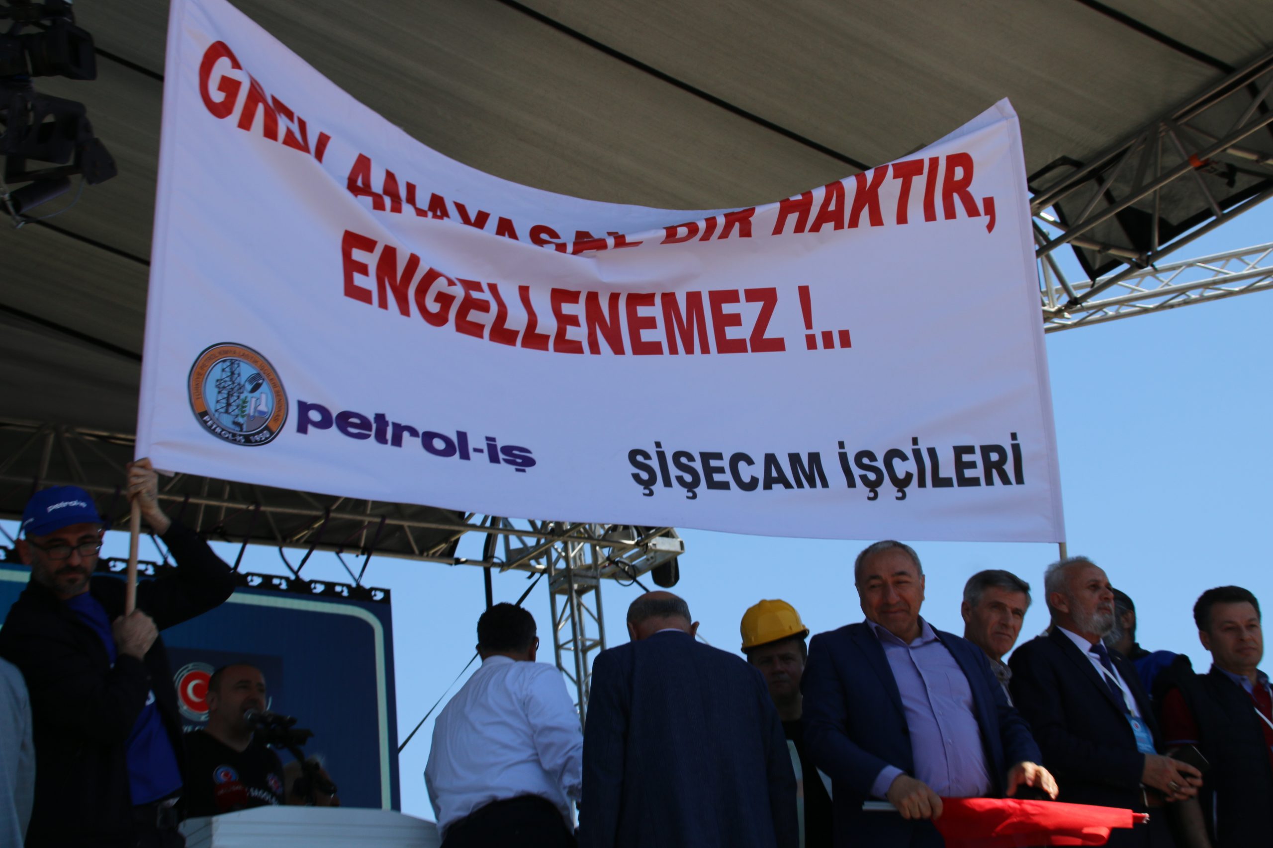 Atalay konuşmasının devamında sendikamız Mersin Şubesinin örgütlü olduğu Şişecam Gruba bağlı Soda Sanayii işçilerinin taleplerini de dile getirdi. Soda Sanayi işyerinde, 2018 ve 2020 yıllarında grevleri yasaklanan Soda Sanayii işçileri 1 Mayıs alanında açtıkları “Sınırsız, Koşulsuz, Yasaksız Grev Hakkı” ve “Grev Anayasal Bir Haktır, Engellenemez” pankartları ile grev yasakları için birlikte mücadele çağrısı yaptılar.