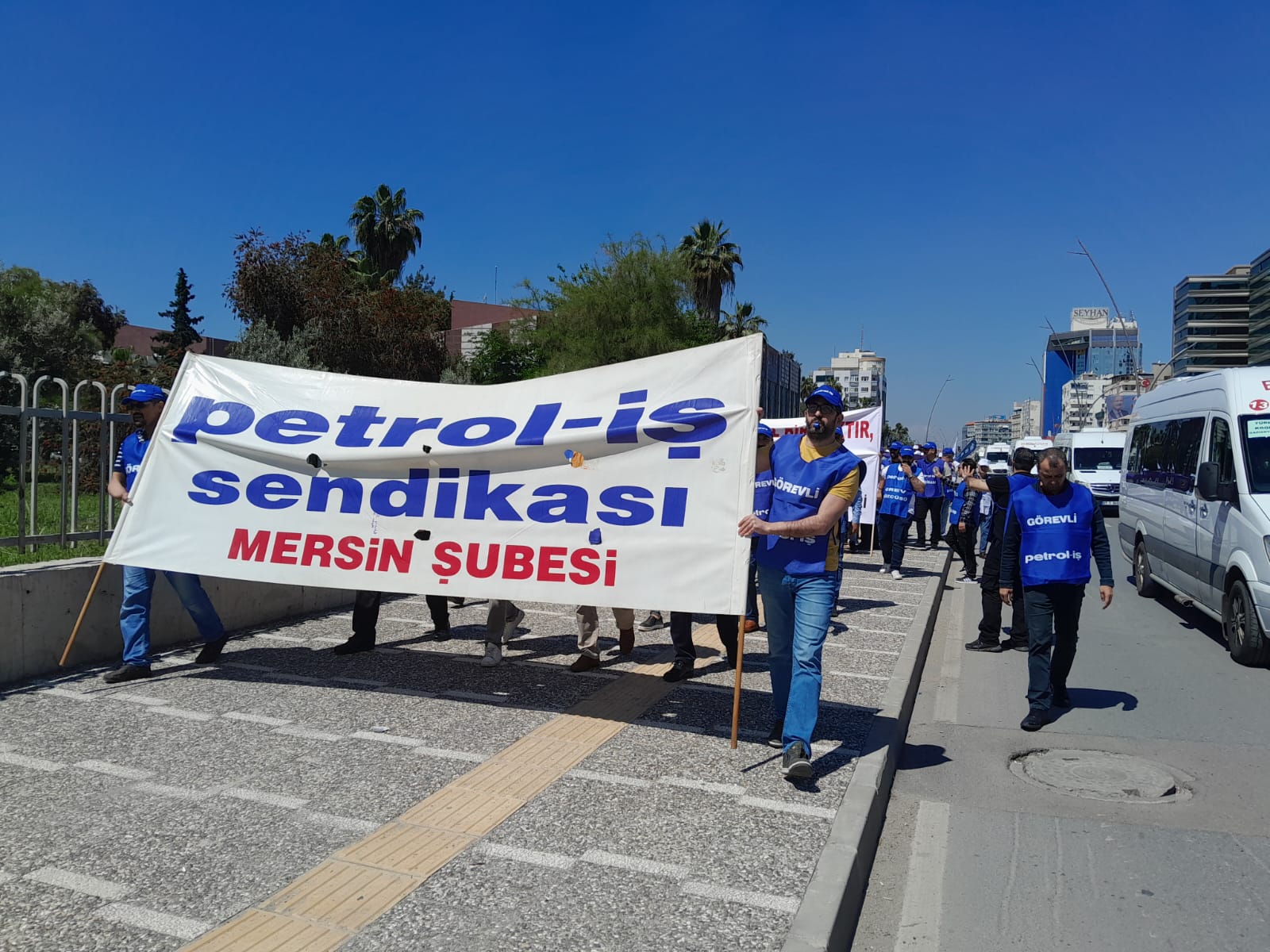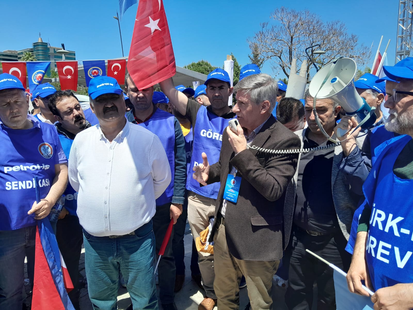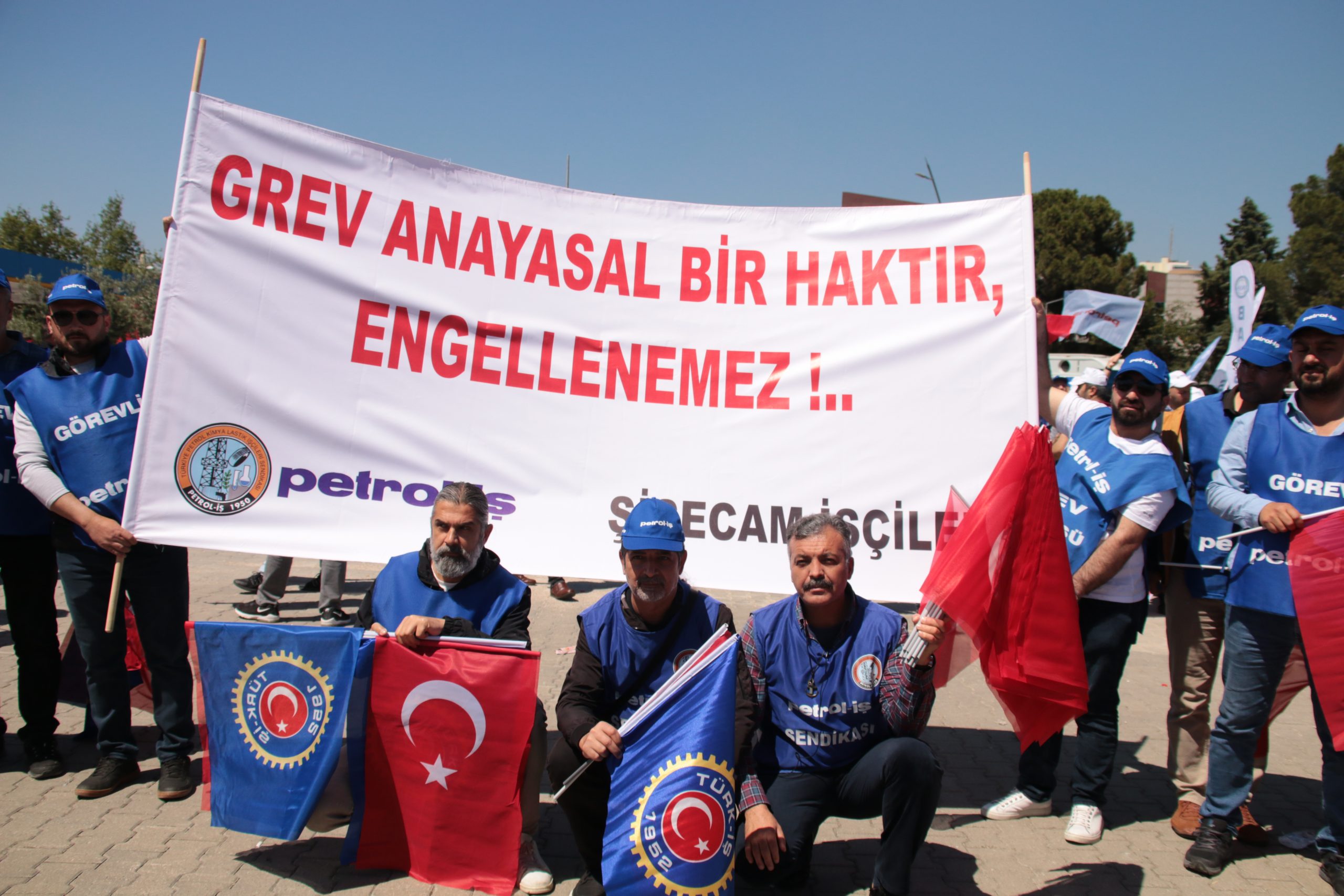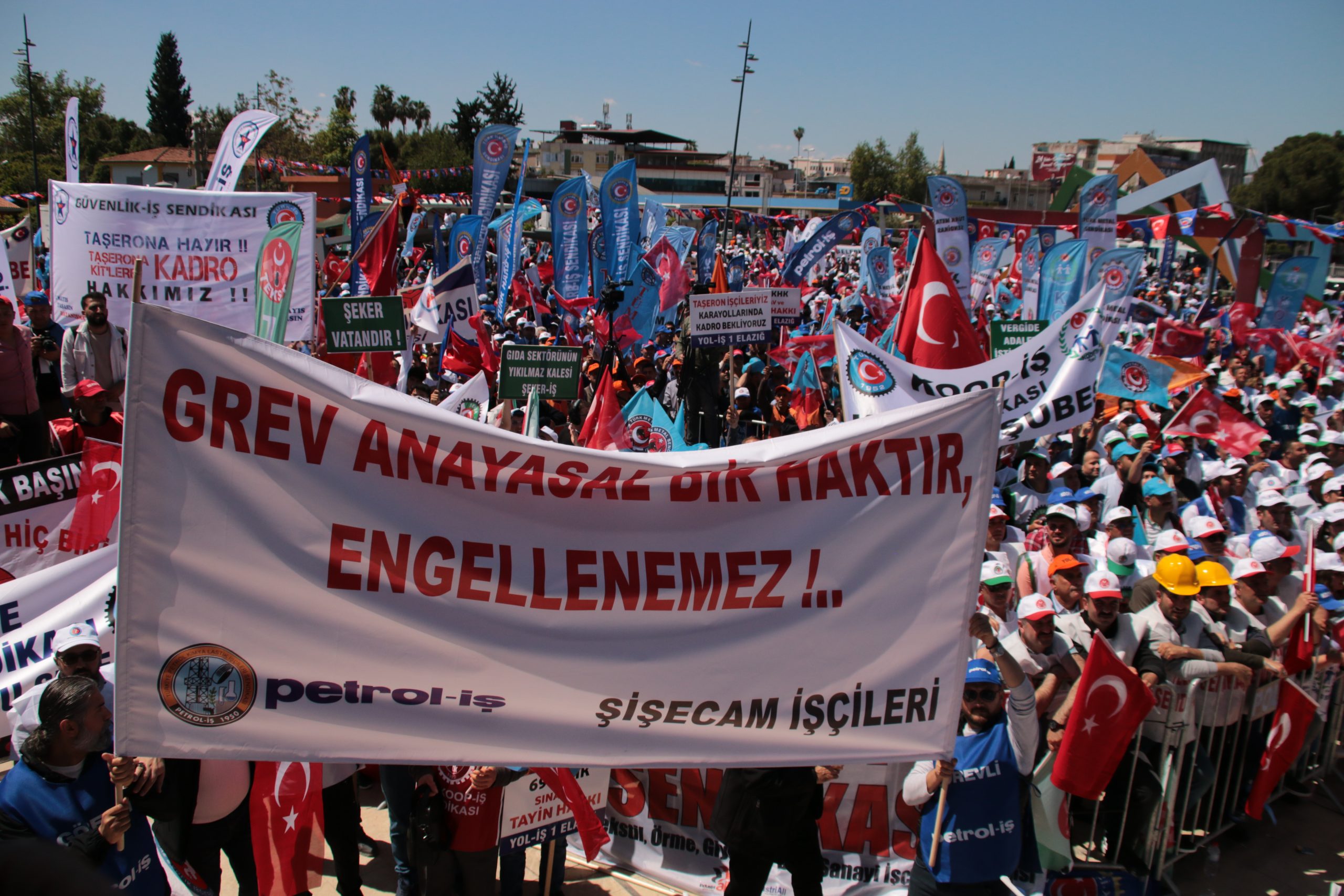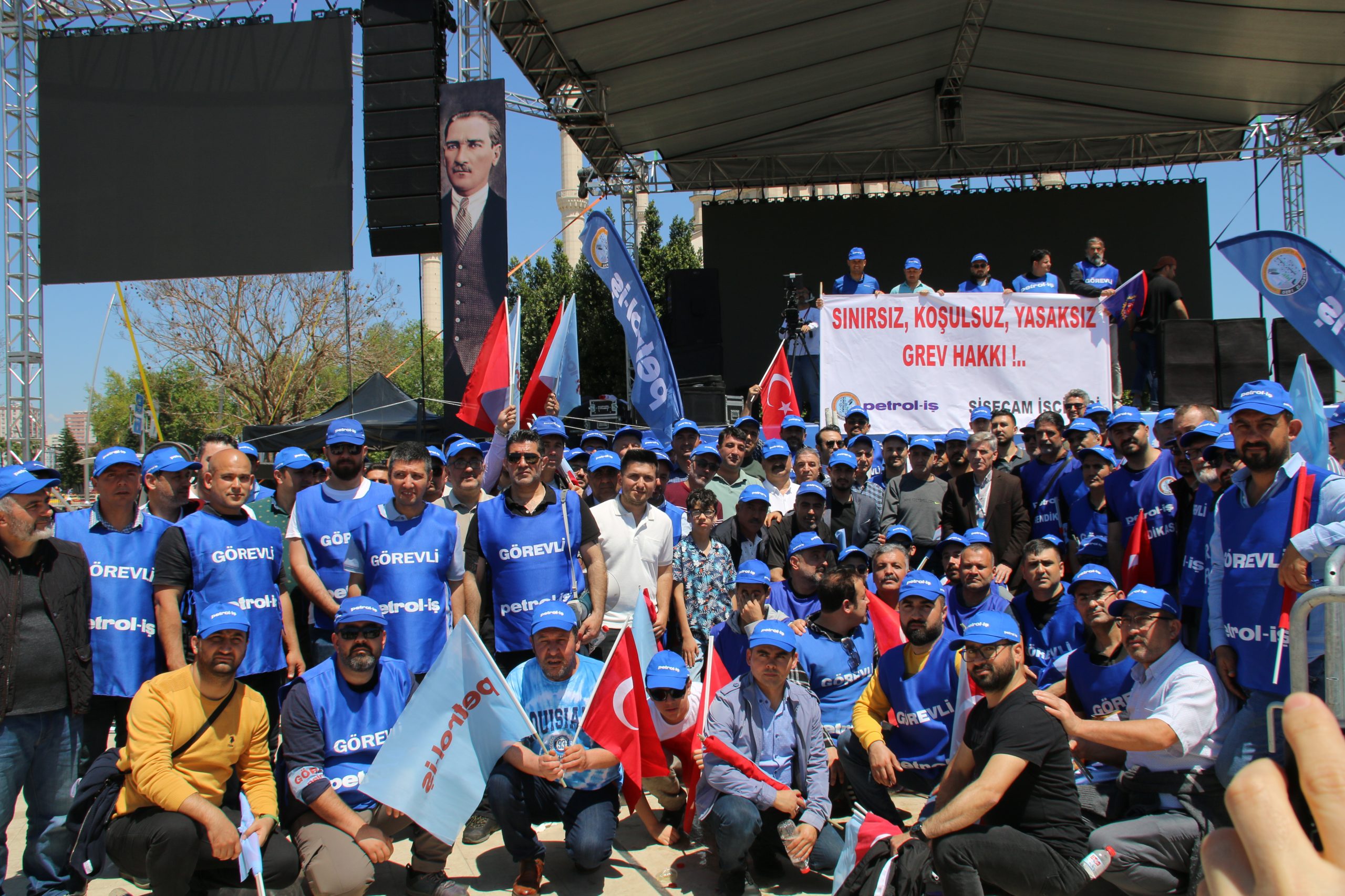 Atalay konuşmasının devamında sendikamız Mersin Şubesinin örgütlü olduğu Şişecam Gruba bağlı Soda Sanayii işçilerinin taleplerini de dile getirdi. Soda Sanayi işyerinde, 2018 ve 2020 yıllarında grevleri yasaklanan Soda Sanayii işçileri 1 Mayıs alanında açtıkları “Sınırsız, Koşulsuz, Yasaksız Grev Hakkı” ve “Grev Anayasal Bir Haktır, Engellenemez” pankartları ile grev yasakları için birlikte mücadele çağrısı yaptılar.