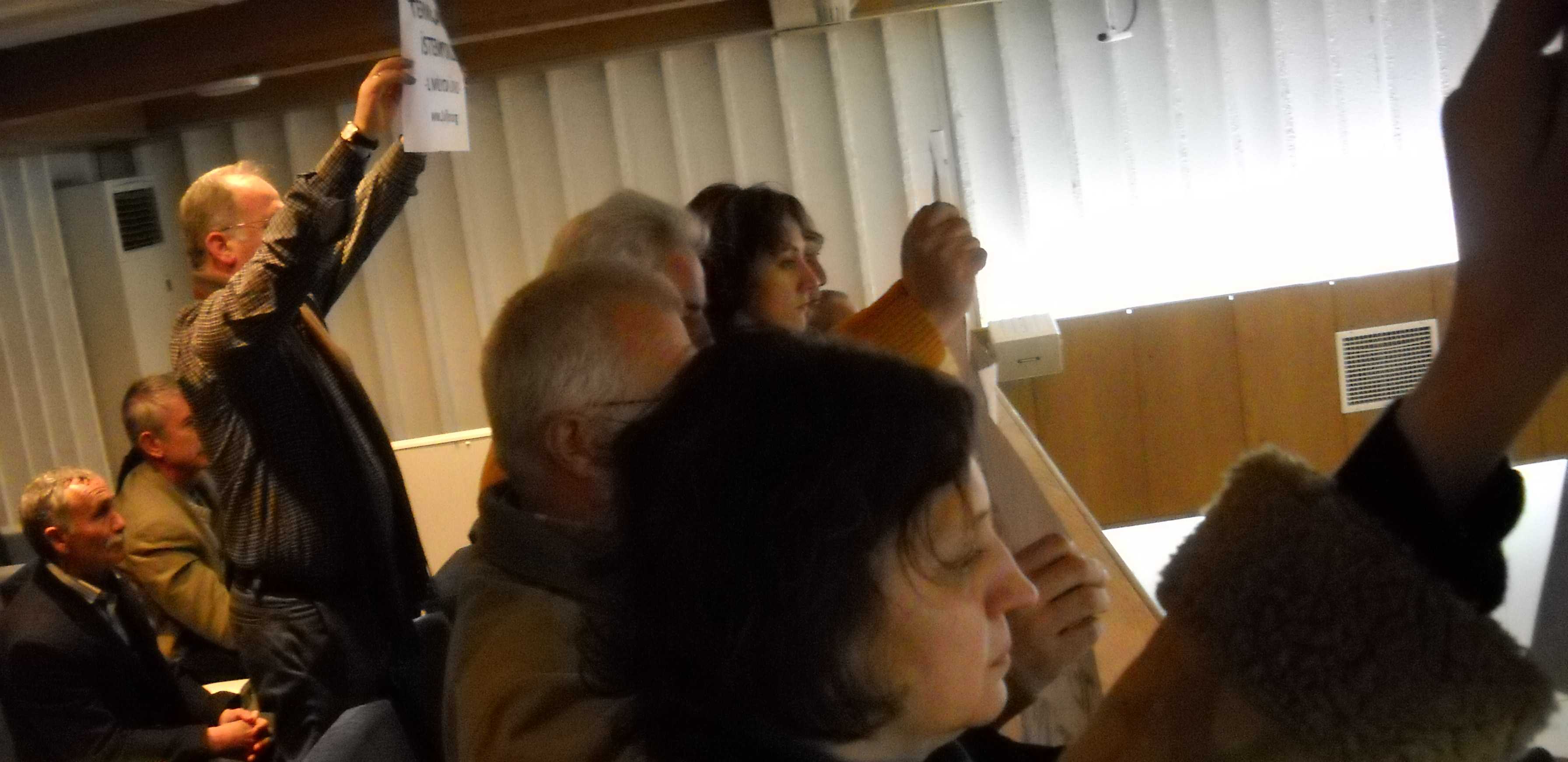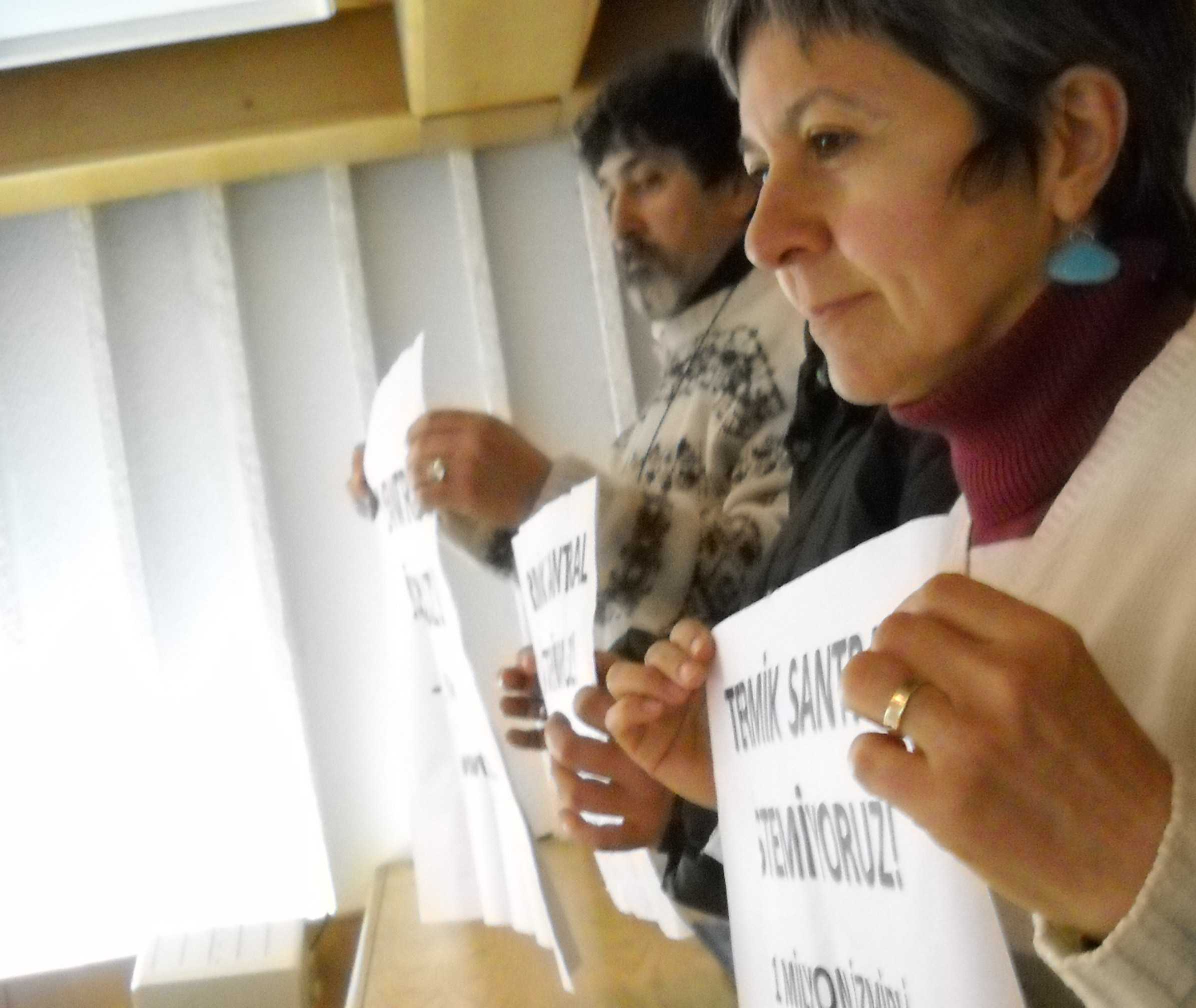 Toplantıda “Termik Santral İstemiyoruz” yazılı dövizleri açan platform üyeleri zorla dışarı çıkartıldılar.