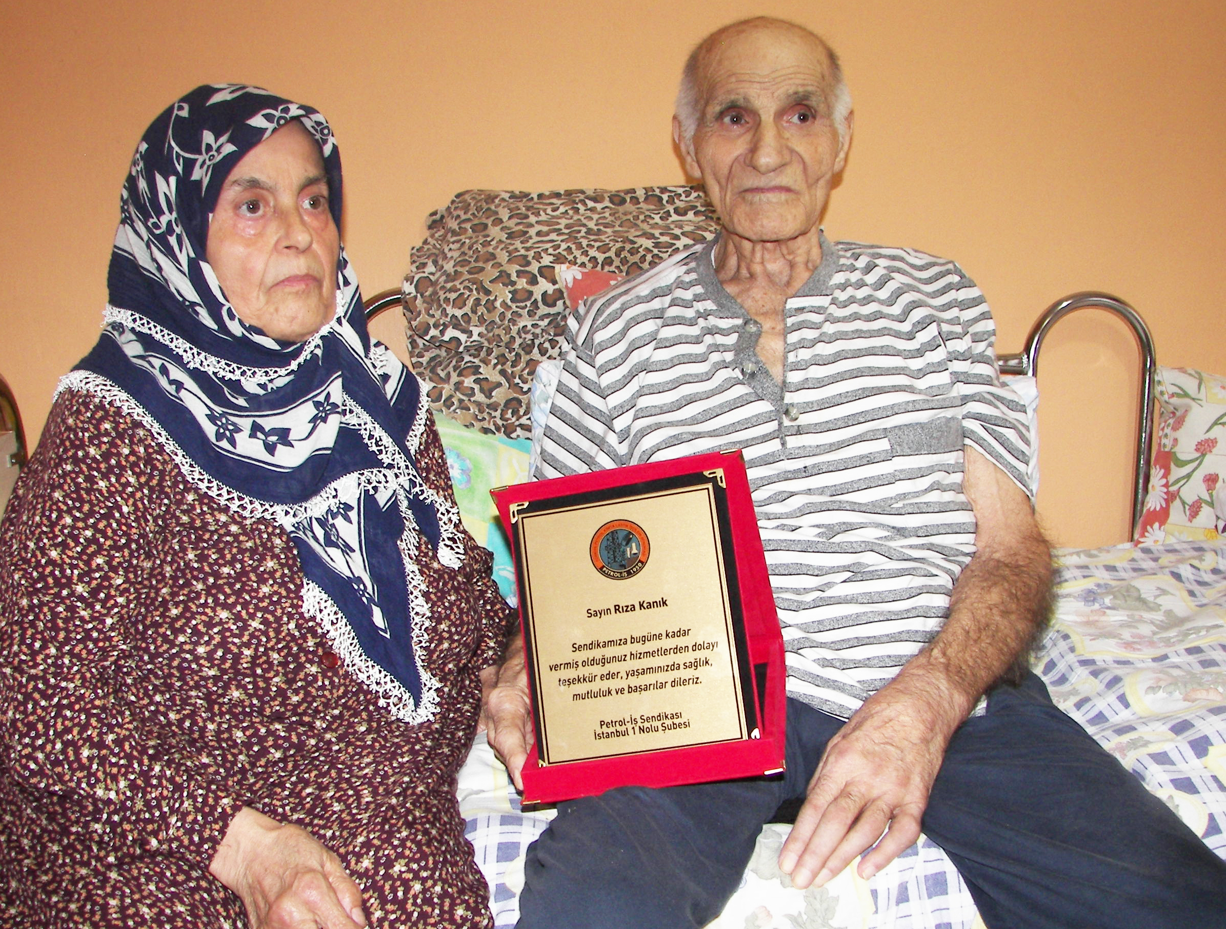 1953 yılında işbaşı yaptığı Gripin İlaç’ta tam 59 yıl çalışarak bu yılın Ocak ayında emekli olan Rıza Kanık’a İstanbul Şube Başkanımız Reşat Tüysüz, işyeri temsilcileri Şirin Akay, Necla Güneş, Arzu Engül ve üyemiz Ramazan Yüce ile birlikte sendikamızın hazırladığı özel emeklilik plaketini verdi. 59 yıl boyunca Gripin İlaç’ın ürettiği ürünleri nakliyat ambarlarına taşıyan Kanık, 1953 yılında işe başladığı fabrikada kendisinden iki ay önce işe başlayan Tülay Hanımla tanıştı.Tülay Hanım ve Rıza Kanık 1956 yılında evlendiler. Daha sonra Tülay Hanım eşinin isteği ile fabrikadan ayrıldı. Rıza Kanık ise 1959 yılından bu yılın başına kadar emekliye ayrılmadan Gripin İlaç’ta çalışmayı sürdürdü. 78 yaşında olan Kanık, bu yılın başında geçirdiği bir rahatsızlık sonucu felç oldu ve emekliye ayrılmak zorunda kaldı. Sendikamızın da en eski üyelerinden biri olan Kanık’ın hayatı, bir emekçinin işyerinde tükenen yaşamına bariz bir örnek oluşturuyor.