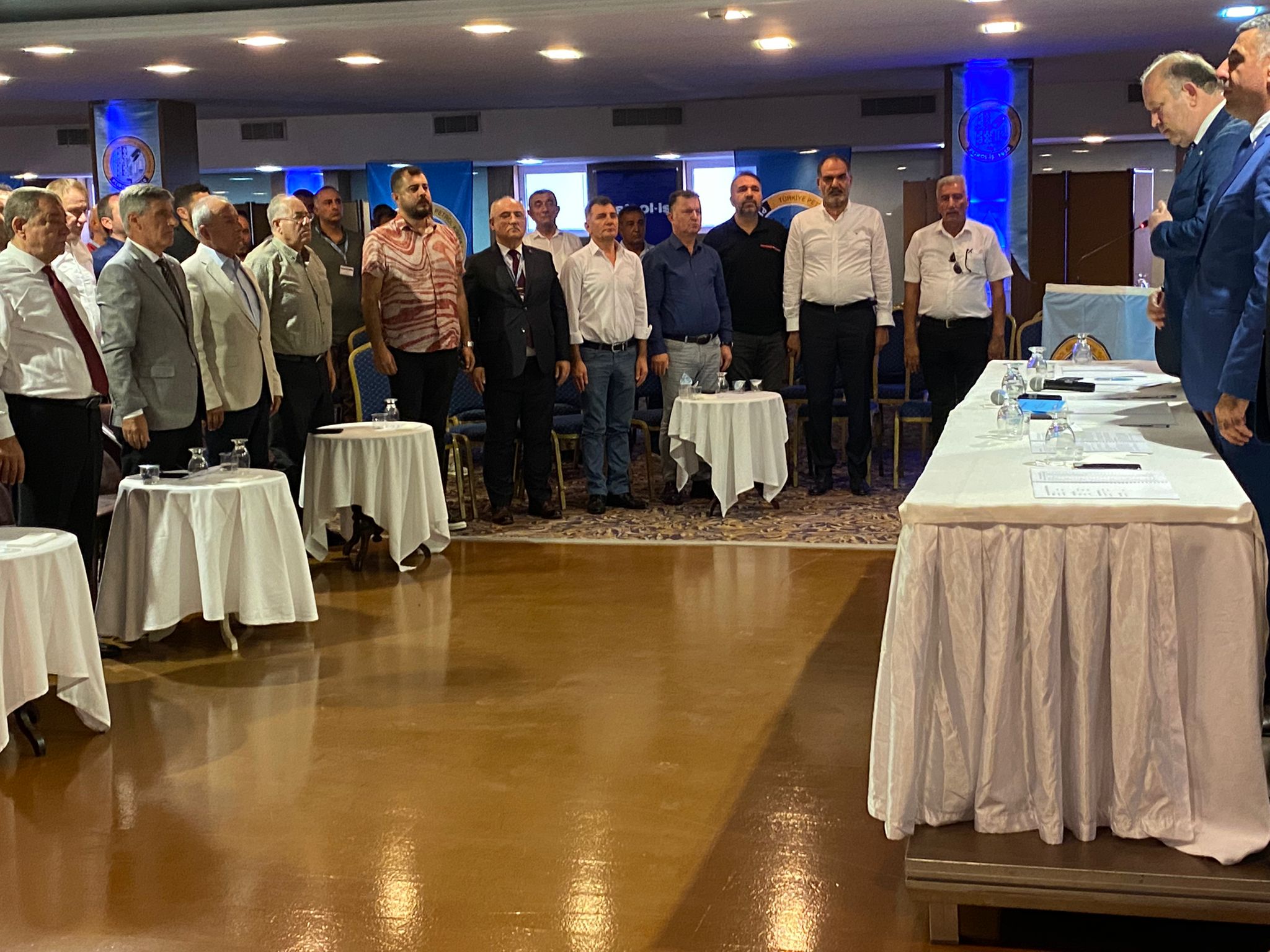 Genel Kurul Saygı Duruşu ve İstiklal Marşı’nın okunmasıyla başladı. Genel Kurulu yönetmek üzere Divan Başkanlığına sendikamız Genel Sekreteri Salih Akduman, Divan Üyeliklerine ise Ankara Şube Başkanı Ali Haluk Koşar, İstanbul 1 Nolu Şube Başkanı Ahmet Baranlı, İzmir Şube Başkanı Cem Turan ve Mersin Şube Başkanı Erdem İyim seçildi.