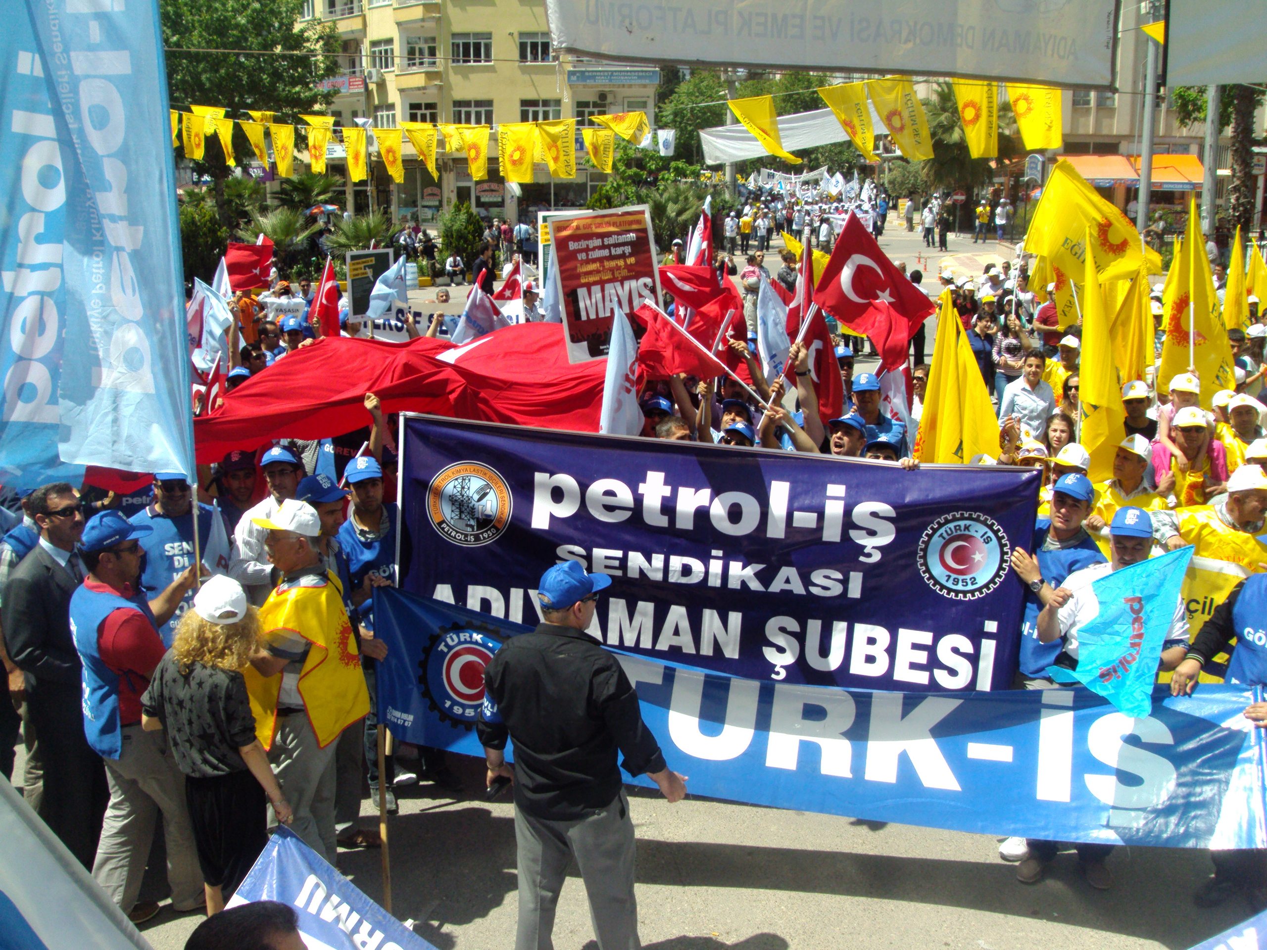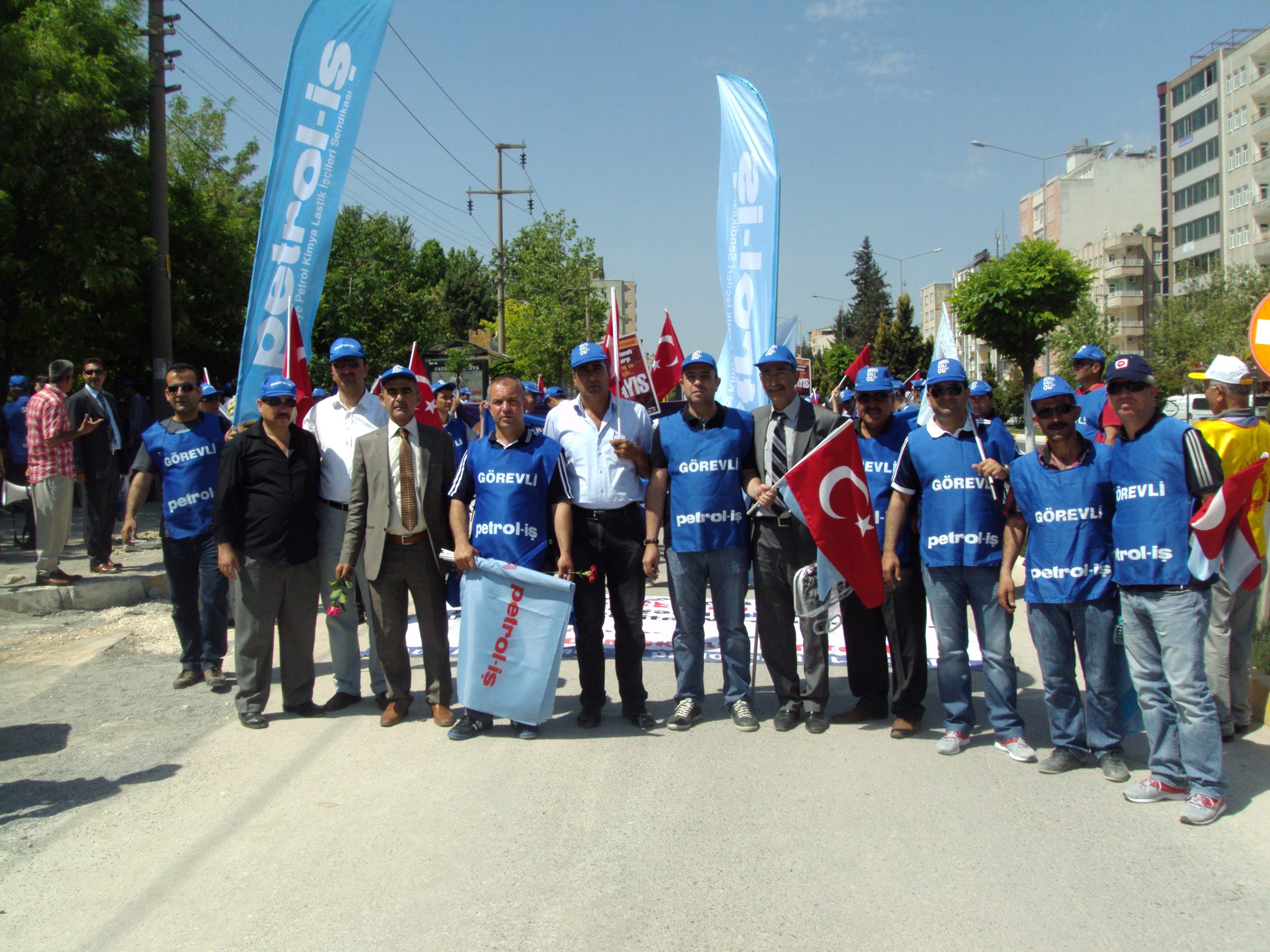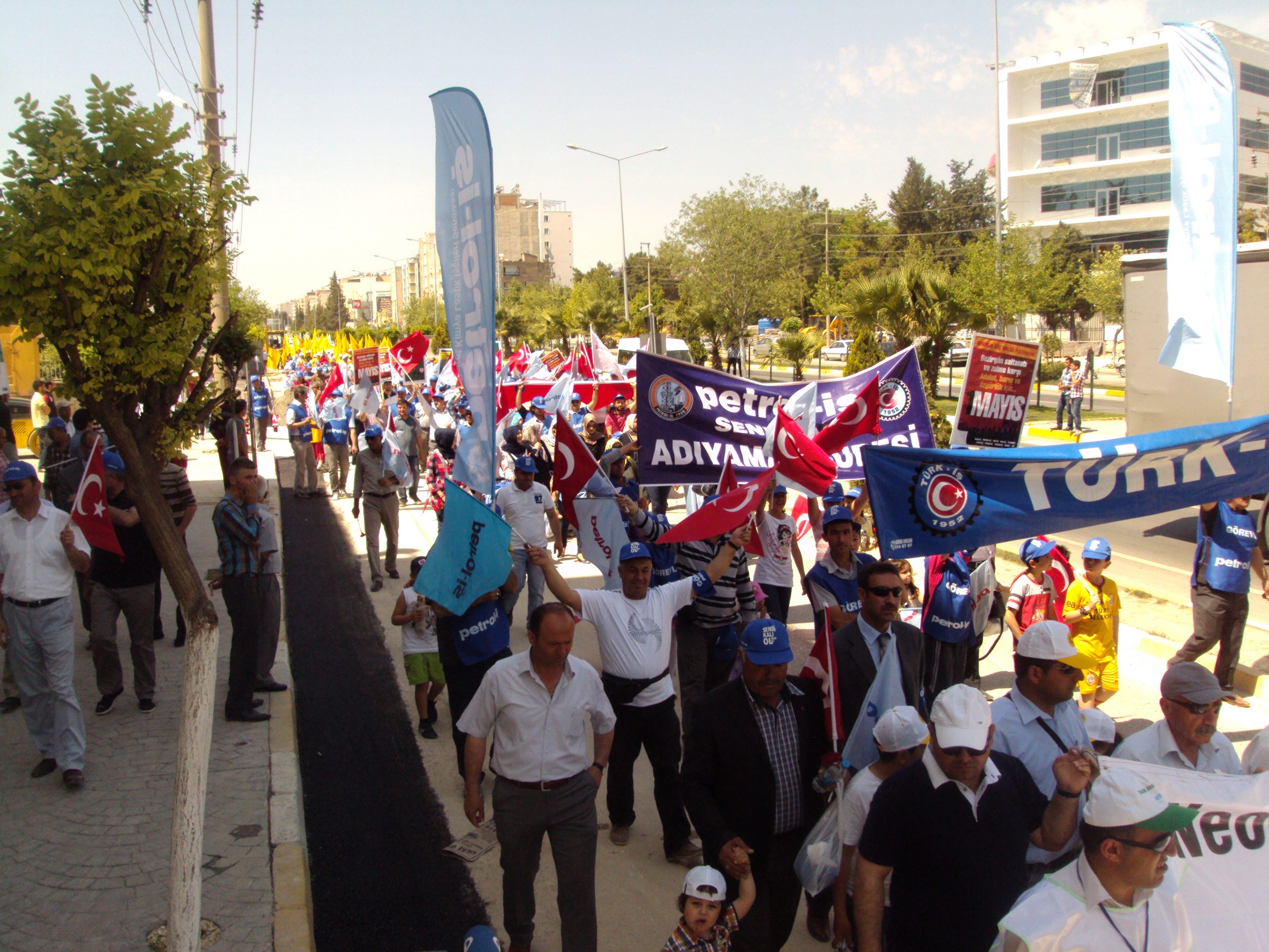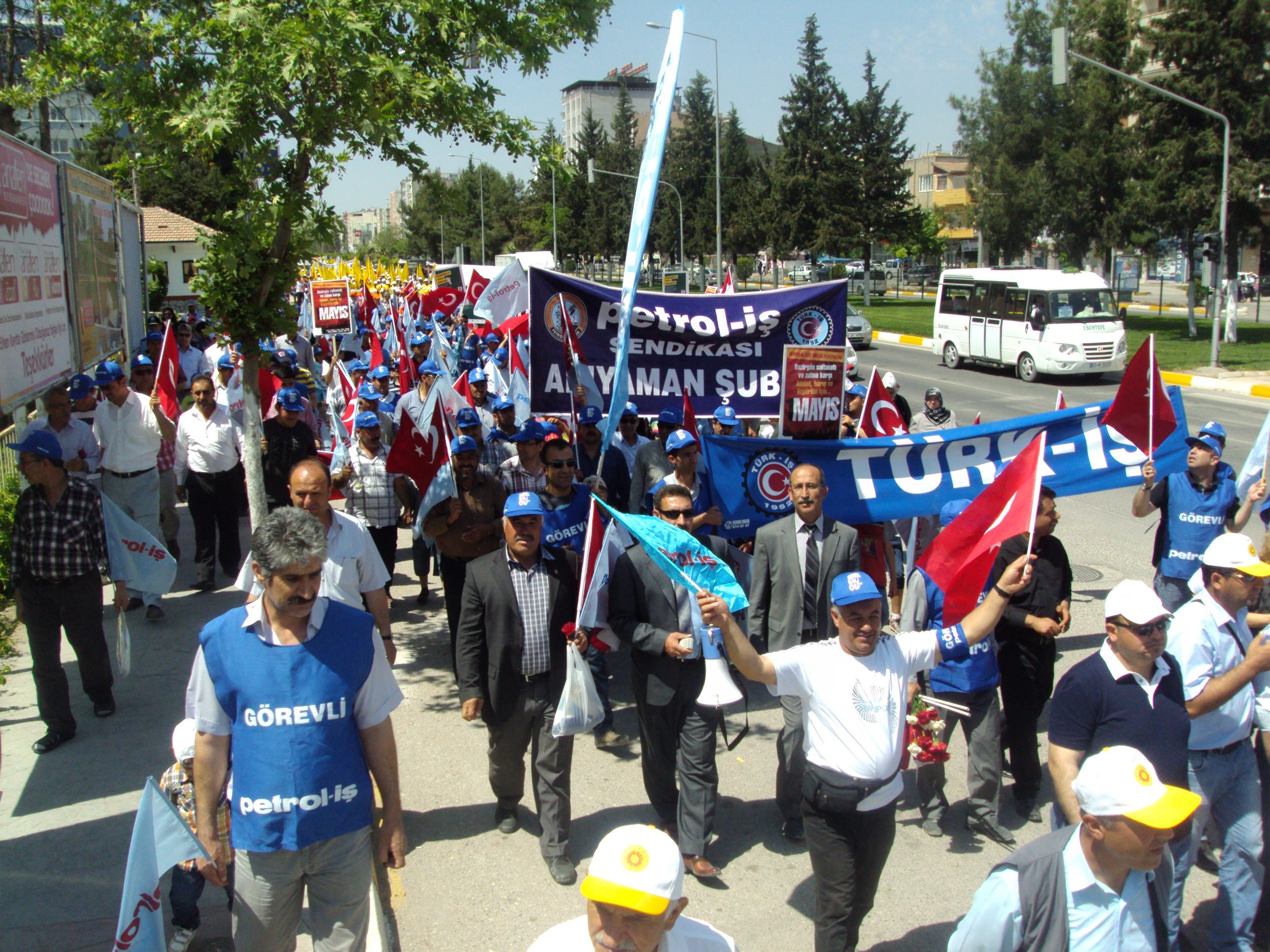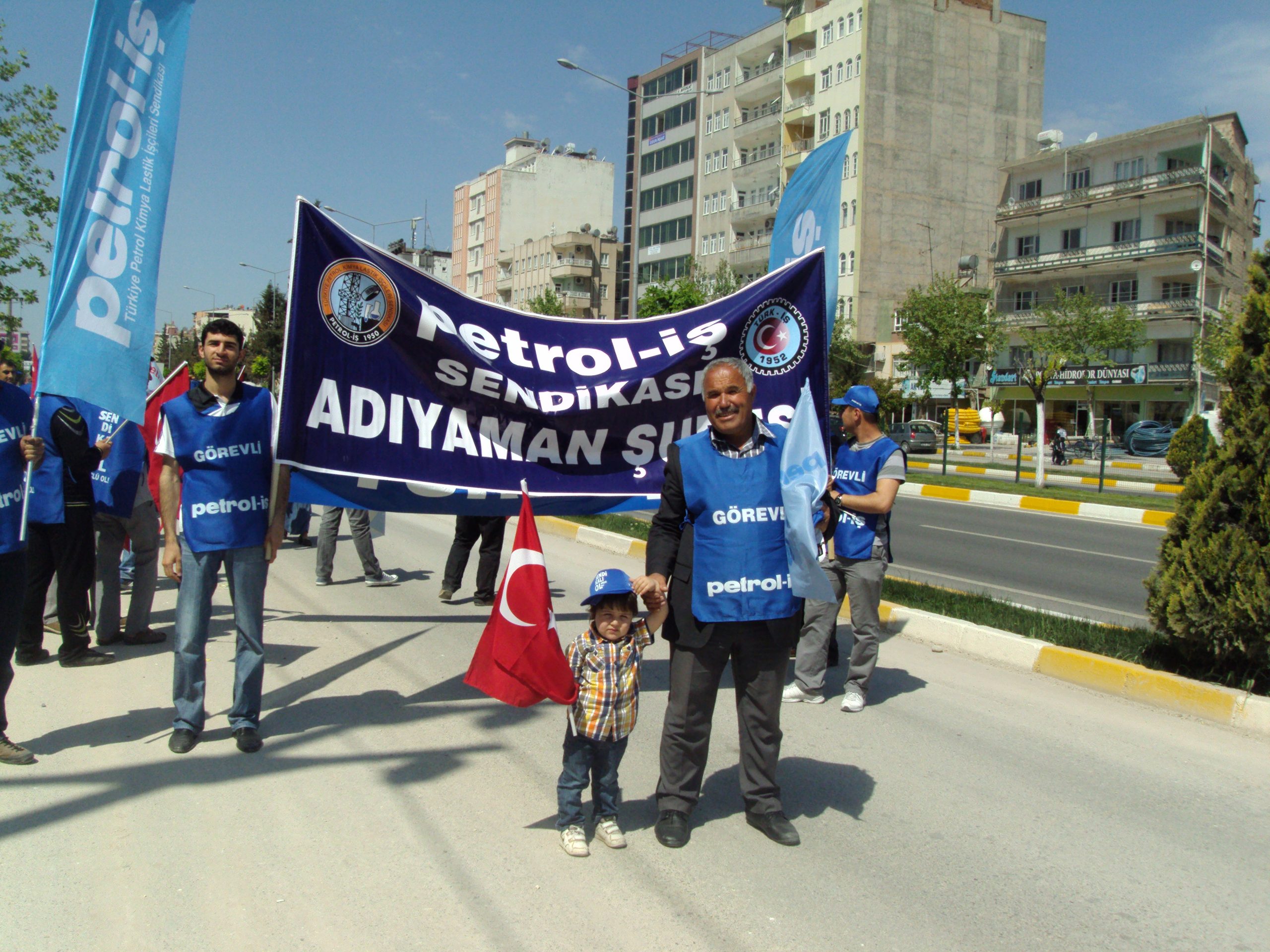 Bu meydanlara hakkı müdaafa günü olan 1 Mayıs’da AVM şantiyelerinde yanan işçileri anmak için, barajlarda boğulan işçileri anmak için, sigortasız işçinin yetim çocuğunun gözyaşını silmek için, işçinin alınteri kurumadan ücretini verin buyuran yüce önderin mesajını iletmek için. Emeğin hesabını sormak için, alınterinin hesabını sormak için ekmeğini yediğimiz vatanın bayrağı ile 1 Mayıs işçi bayramına Adıyaman Petrol-İş Sendikası olarak katıldık.