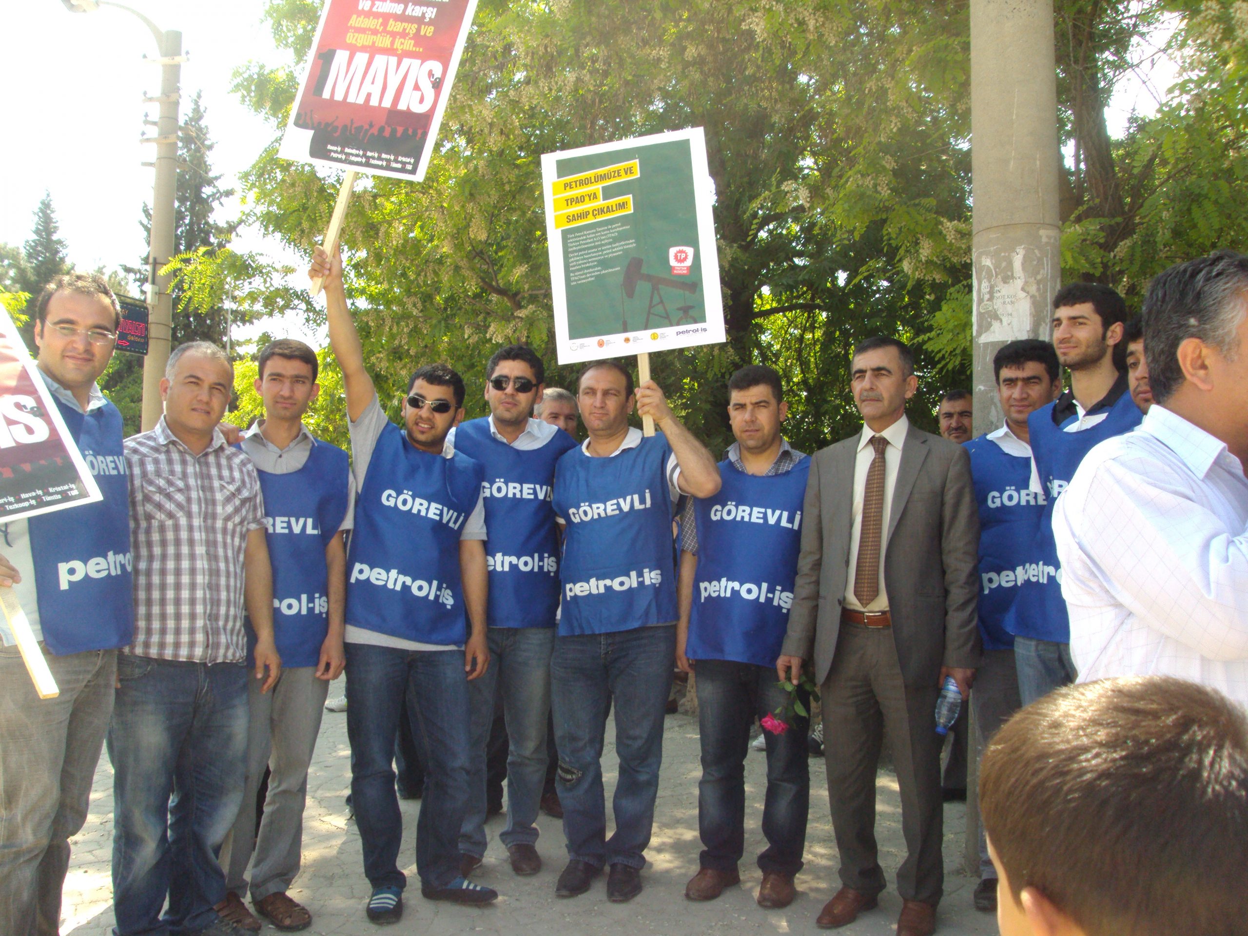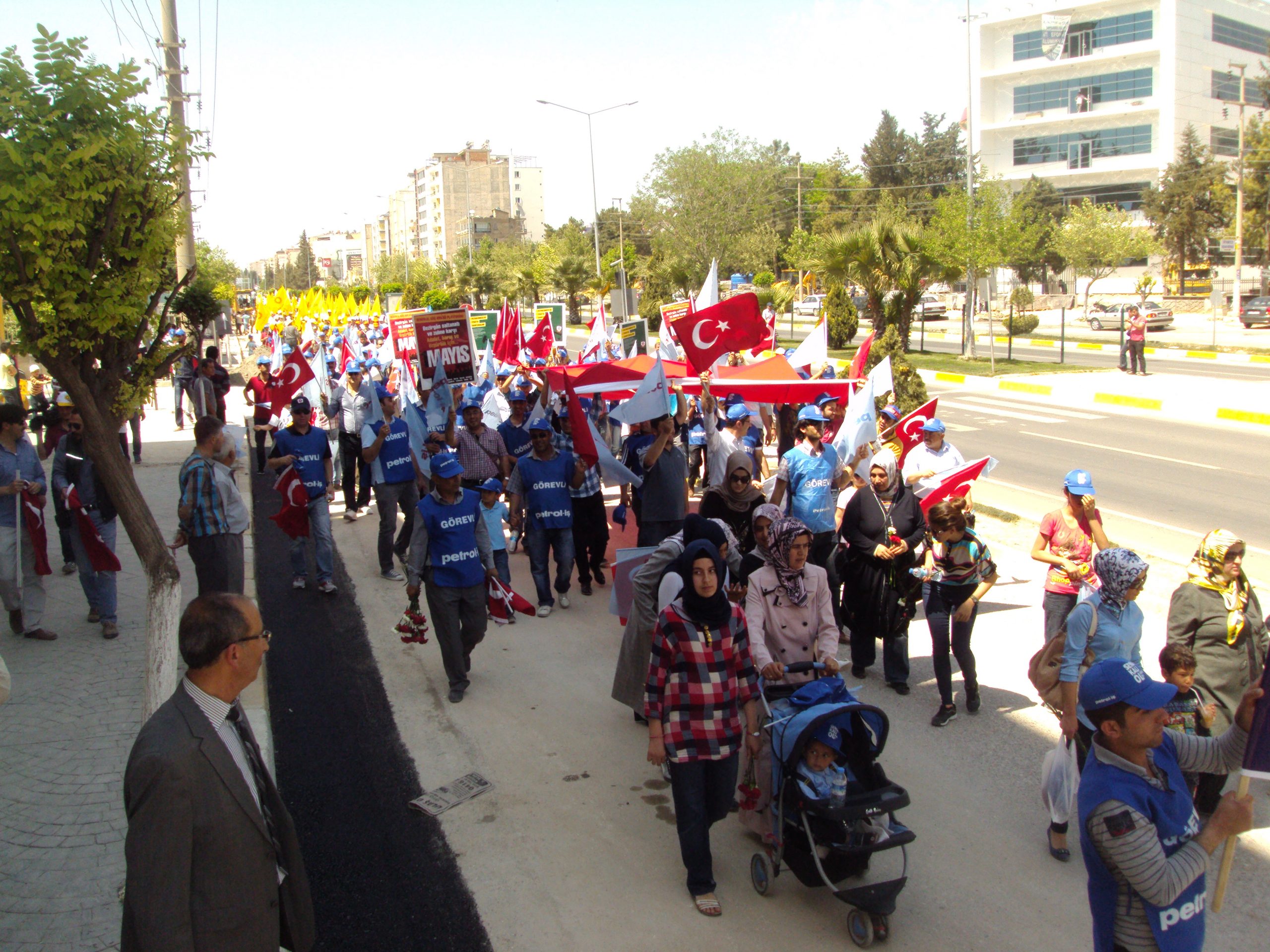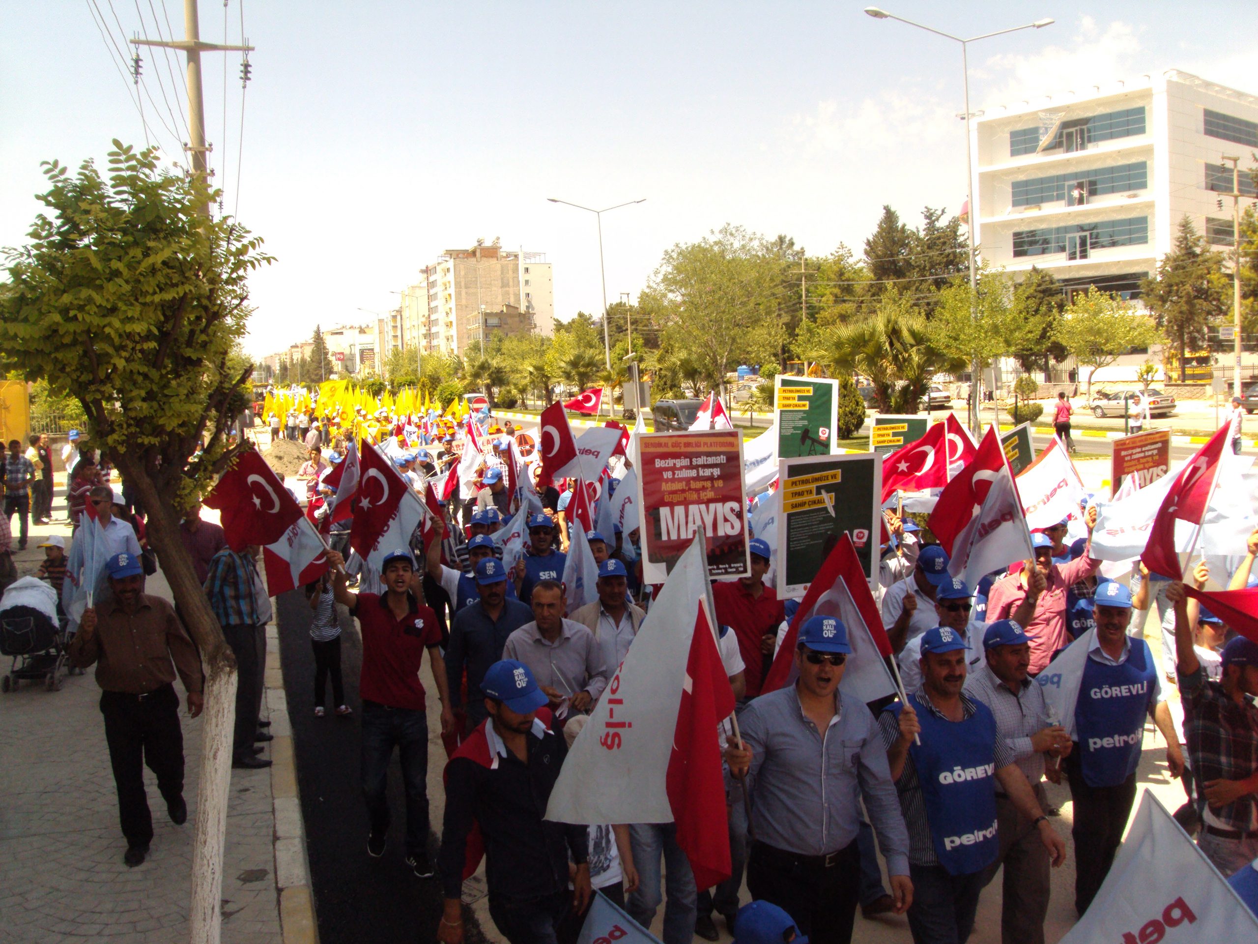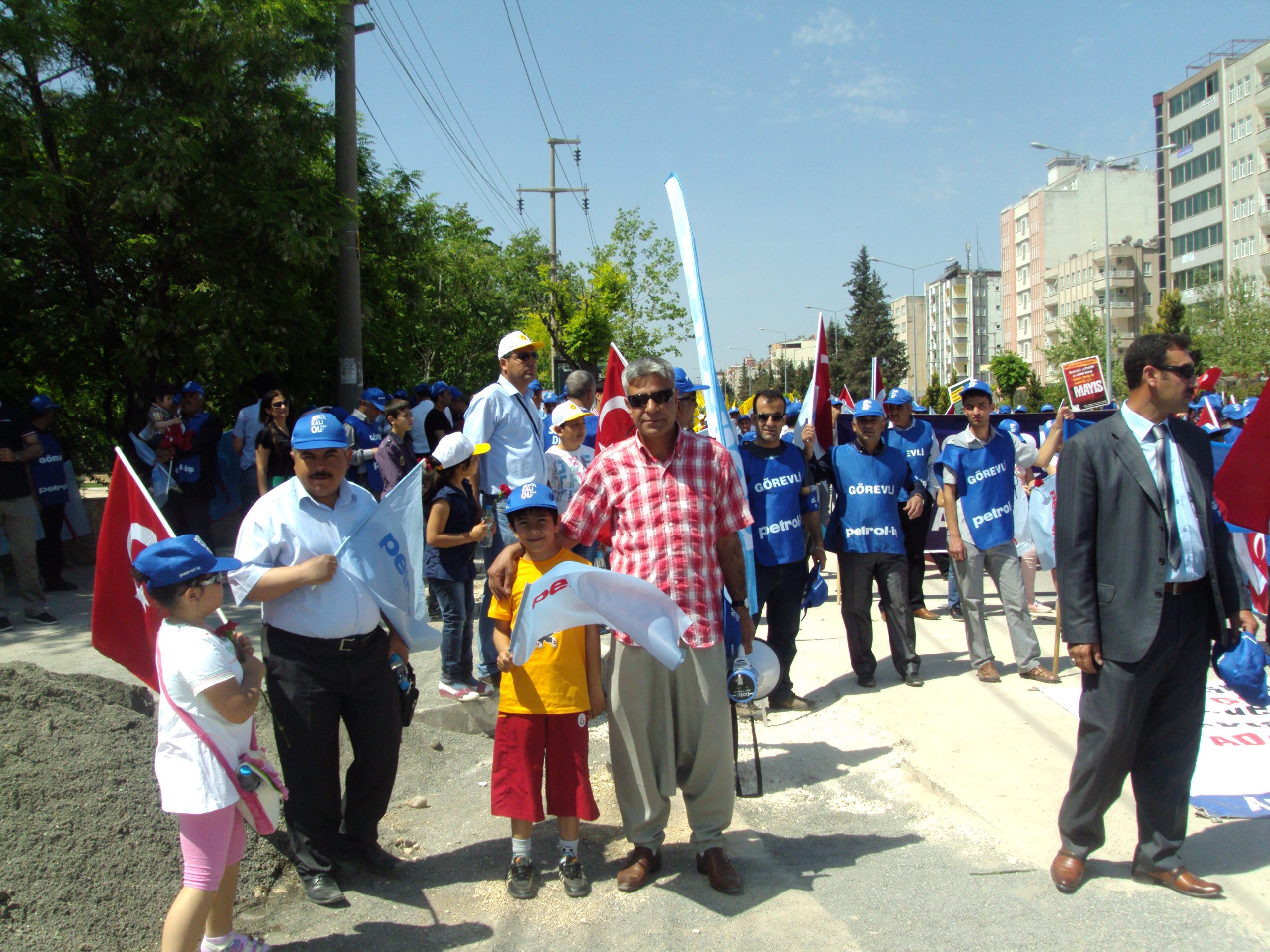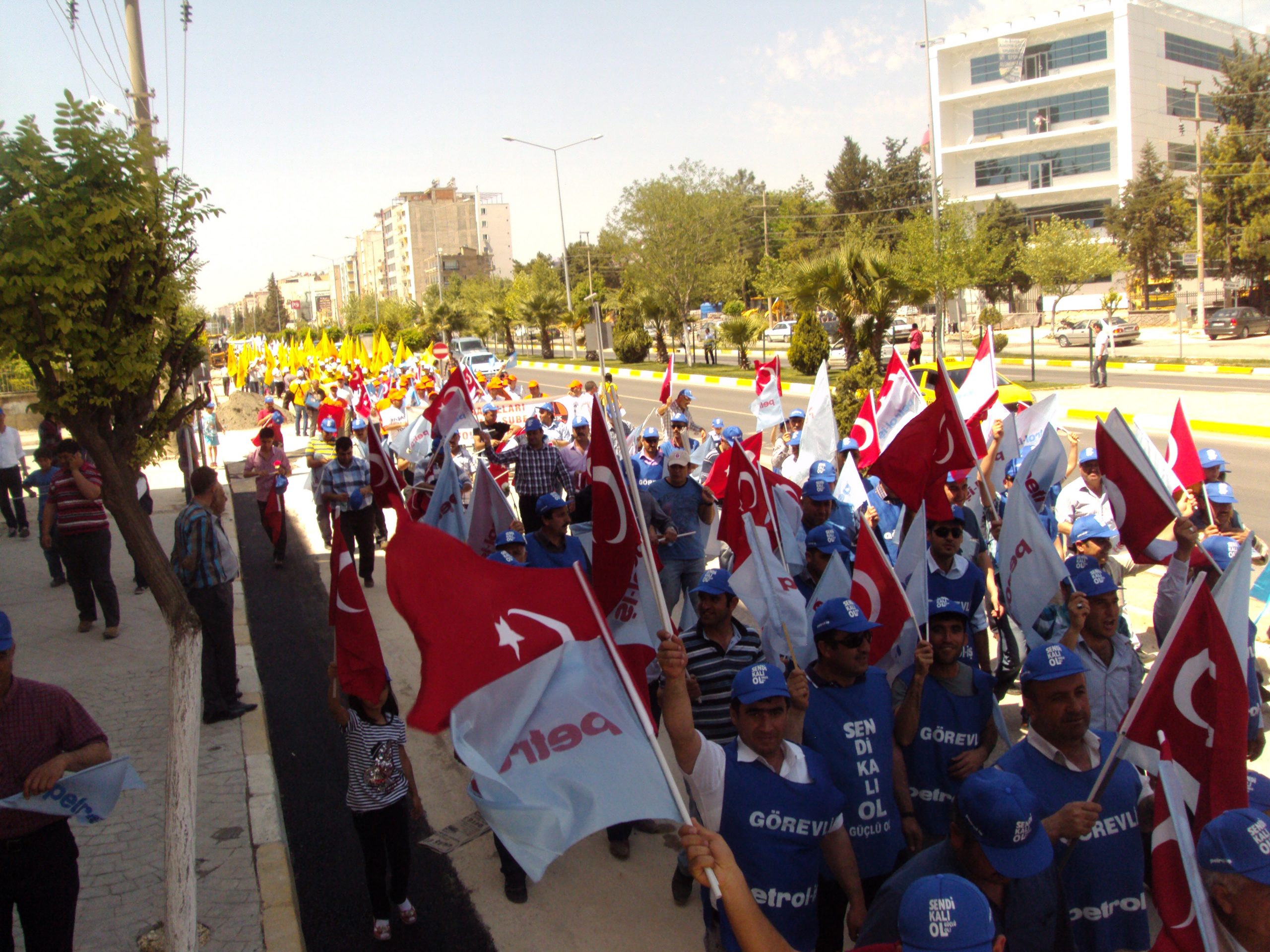 Bu meydanlara hakkı müdaafa günü olan 1 Mayıs’da AVM şantiyelerinde yanan işçileri anmak için, barajlarda boğulan işçileri anmak için, sigortasız işçinin yetim çocuğunun gözyaşını silmek için, işçinin alınteri kurumadan ücretini verin buyuran yüce önderin mesajını iletmek için. Emeğin hesabını sormak için, alınterinin hesabını sormak için ekmeğini yediğimiz vatanın bayrağı ile 1 Mayıs işçi bayramına Adıyaman Petrol-İş Sendikası olarak katıldık.