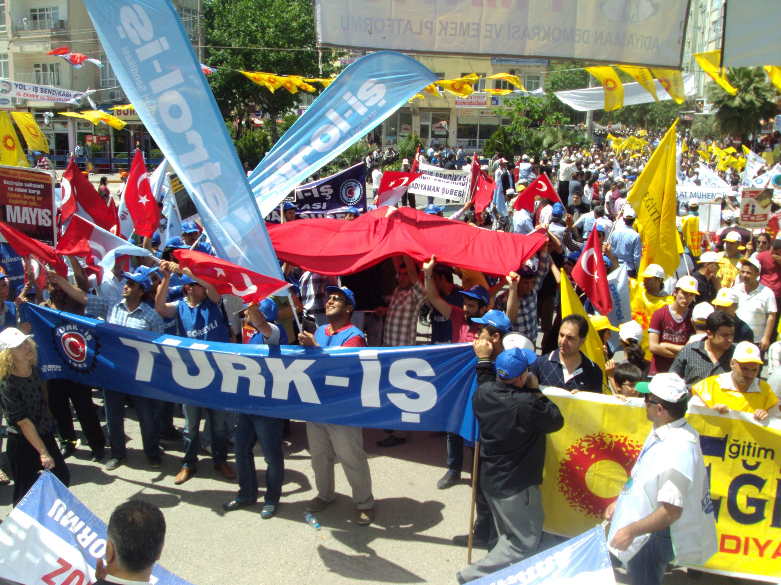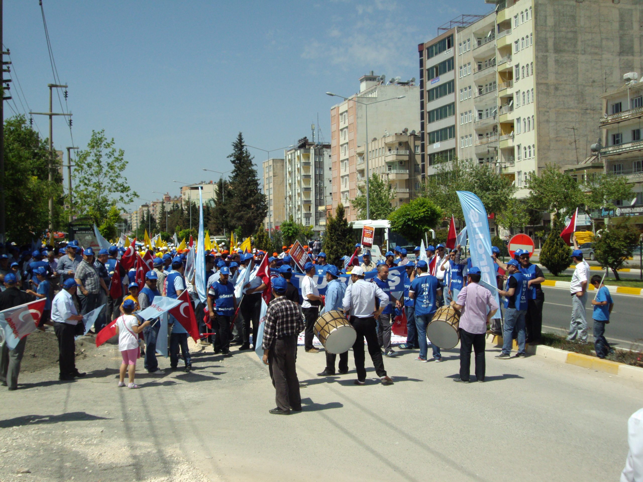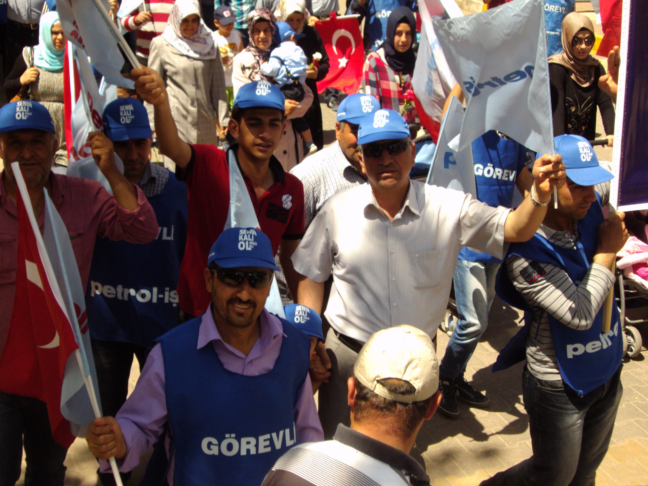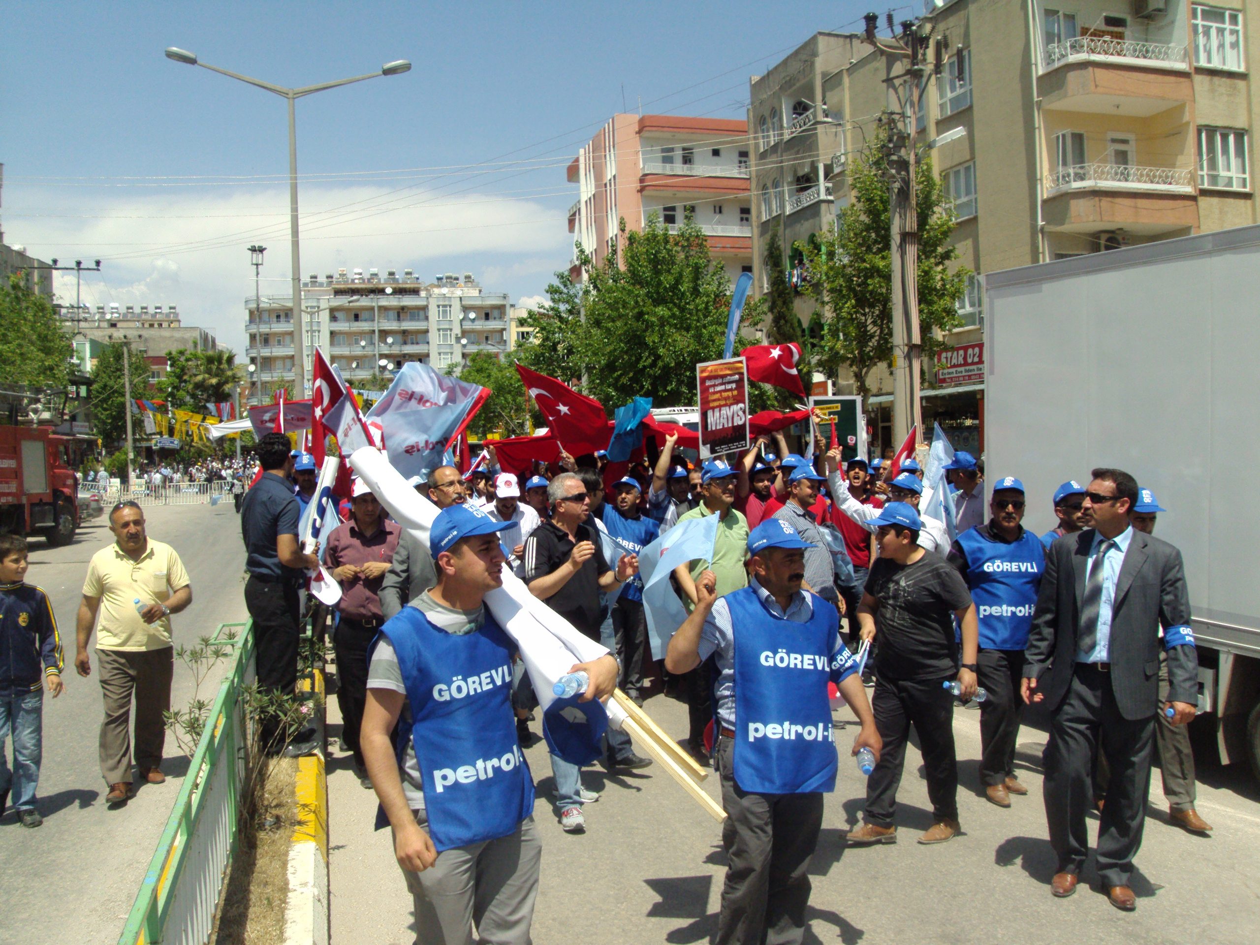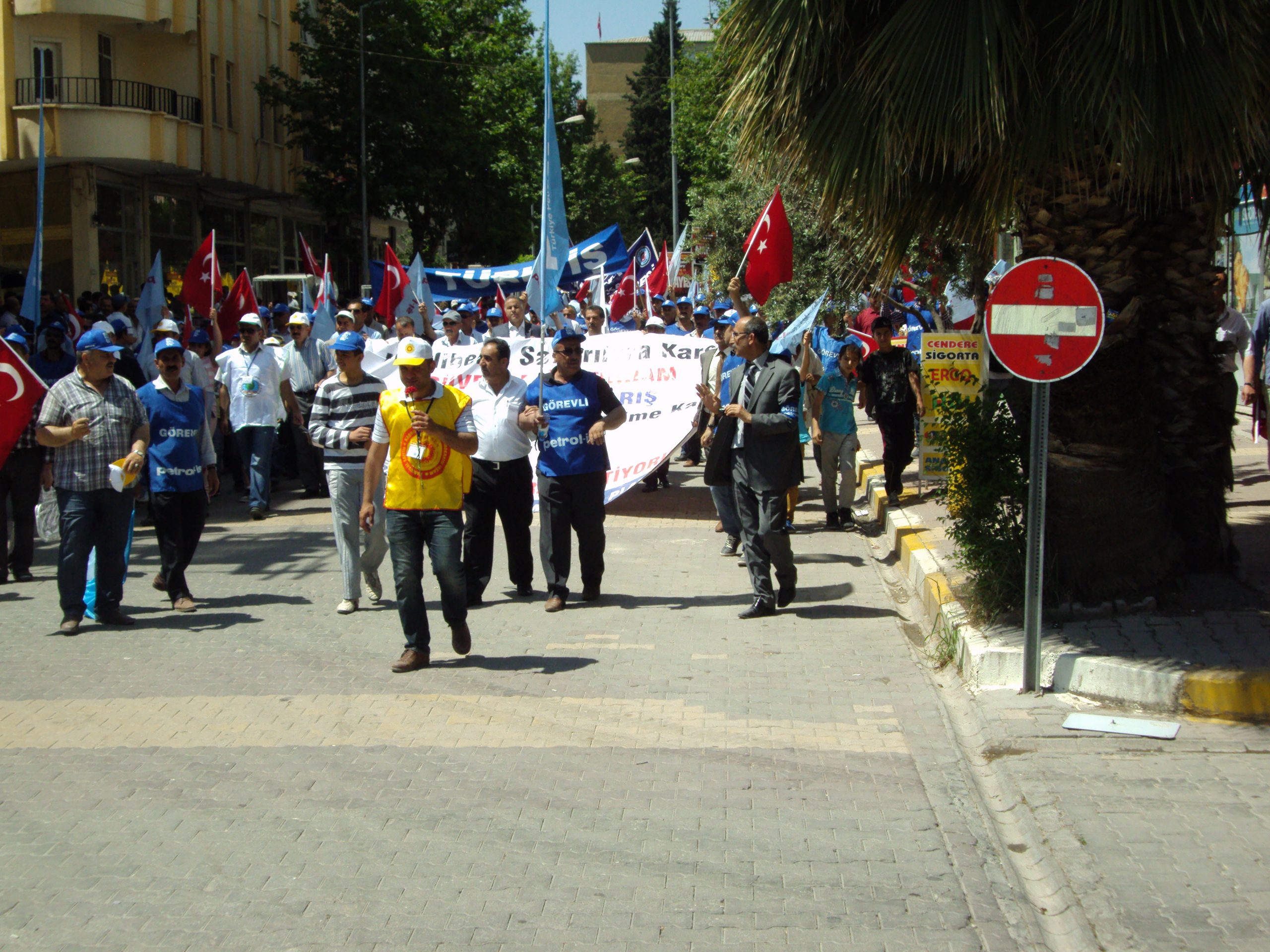 Bu meydanlara hakkı müdaafa günü olan 1 Mayıs’da AVM şantiyelerinde yanan işçileri anmak için, barajlarda boğulan işçileri anmak için, sigortasız işçinin yetim çocuğunun gözyaşını silmek için, işçinin alınteri kurumadan ücretini verin buyuran yüce önderin mesajını iletmek için. Emeğin hesabını sormak için, alınterinin hesabını sormak için ekmeğini yediğimiz vatanın bayrağı ile 1 Mayıs işçi bayramına Adıyaman Petrol-İş Sendikası olarak katıldık.