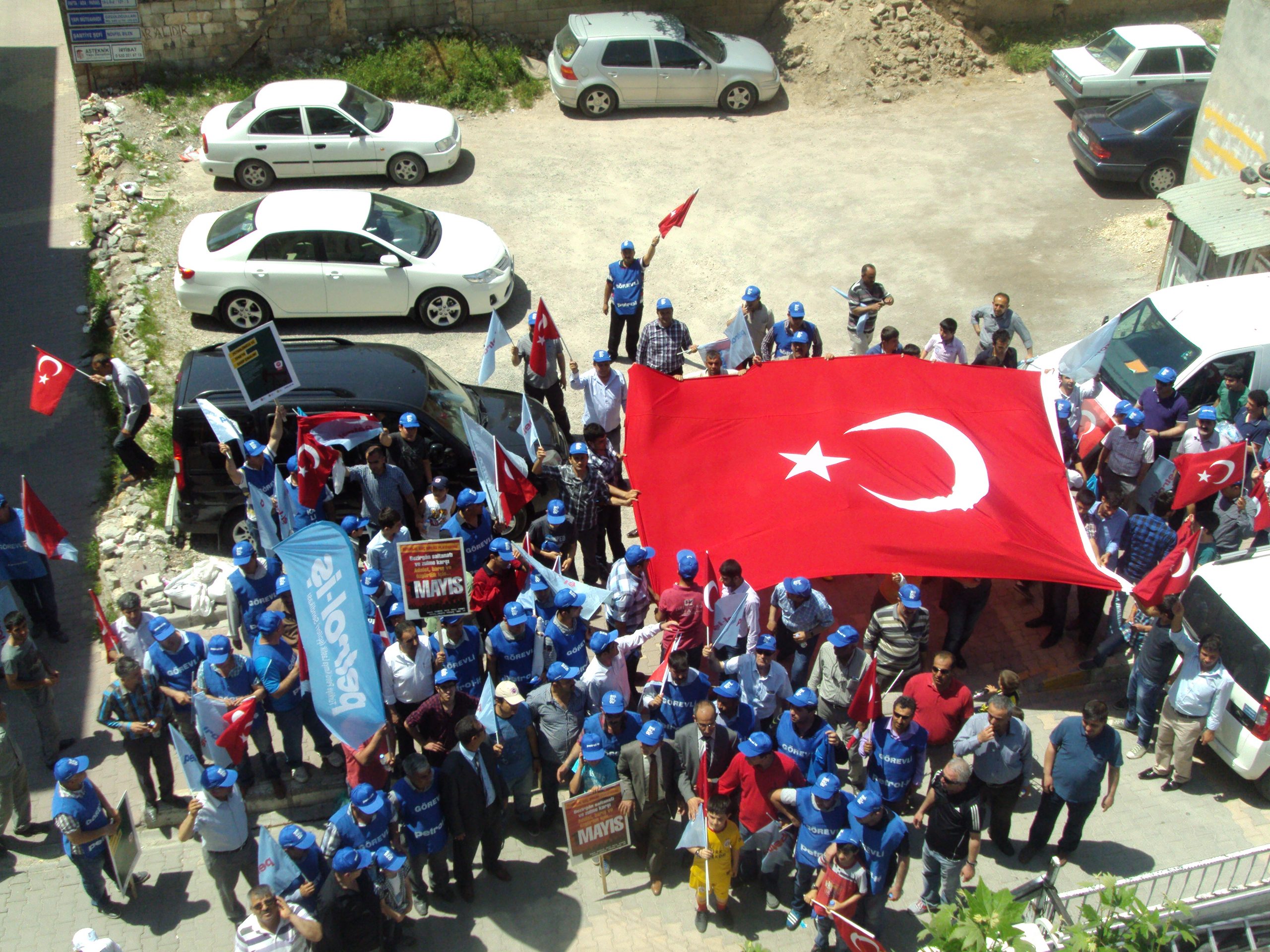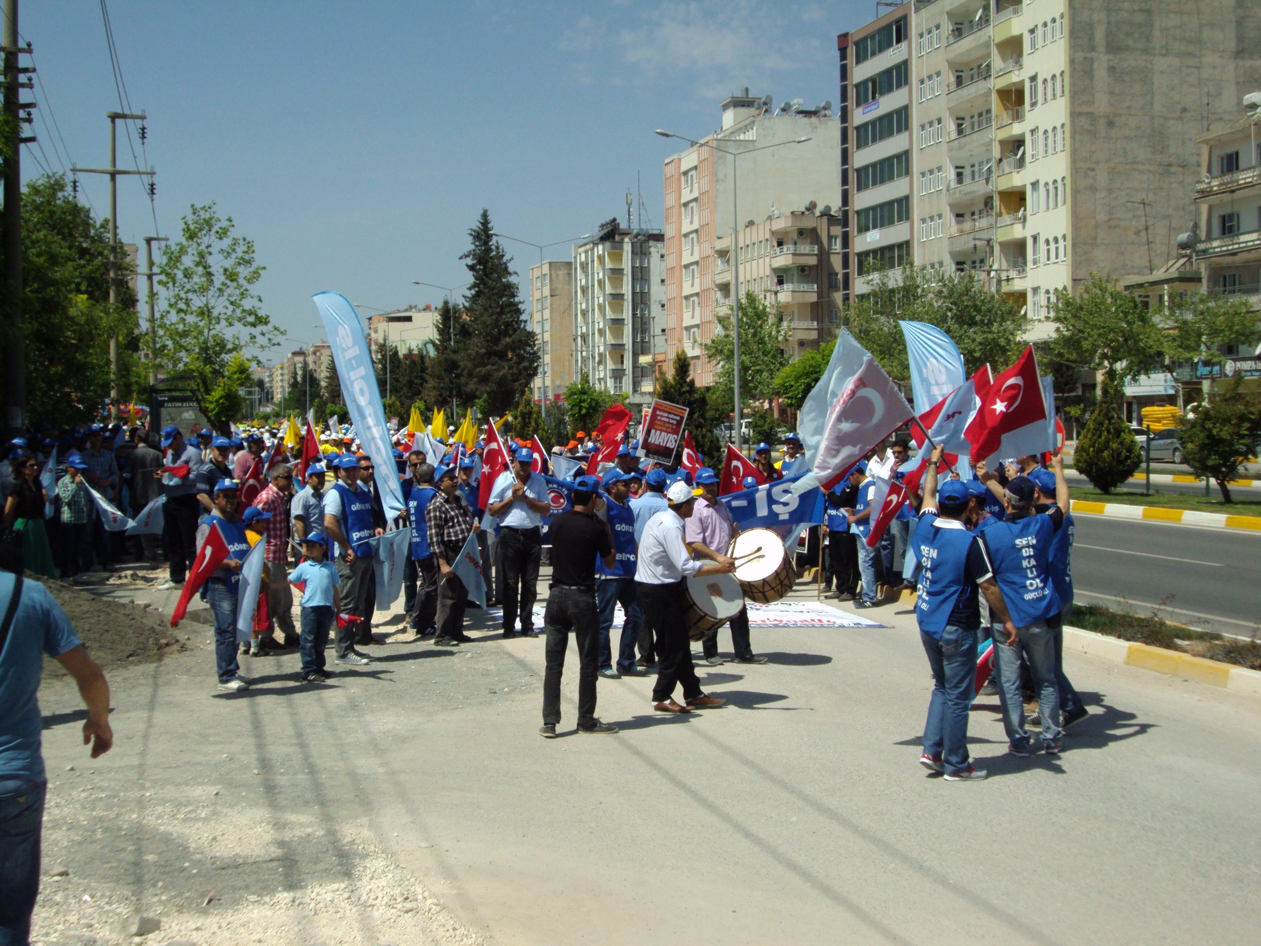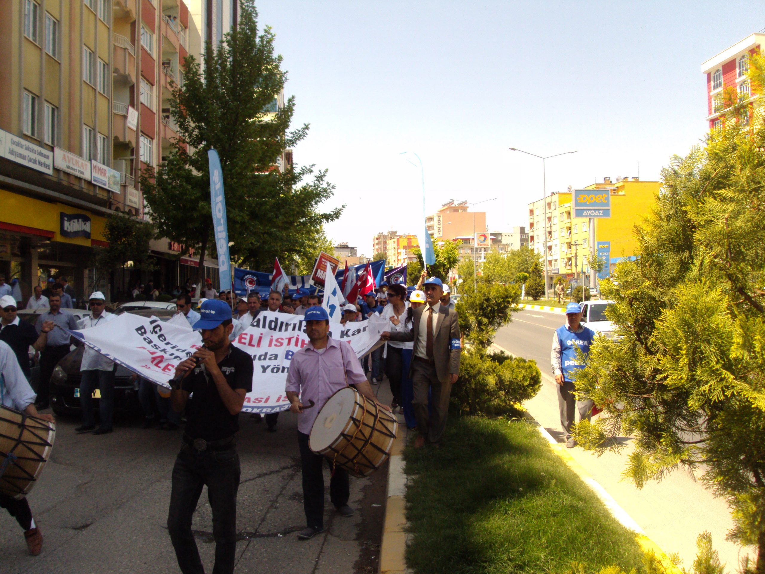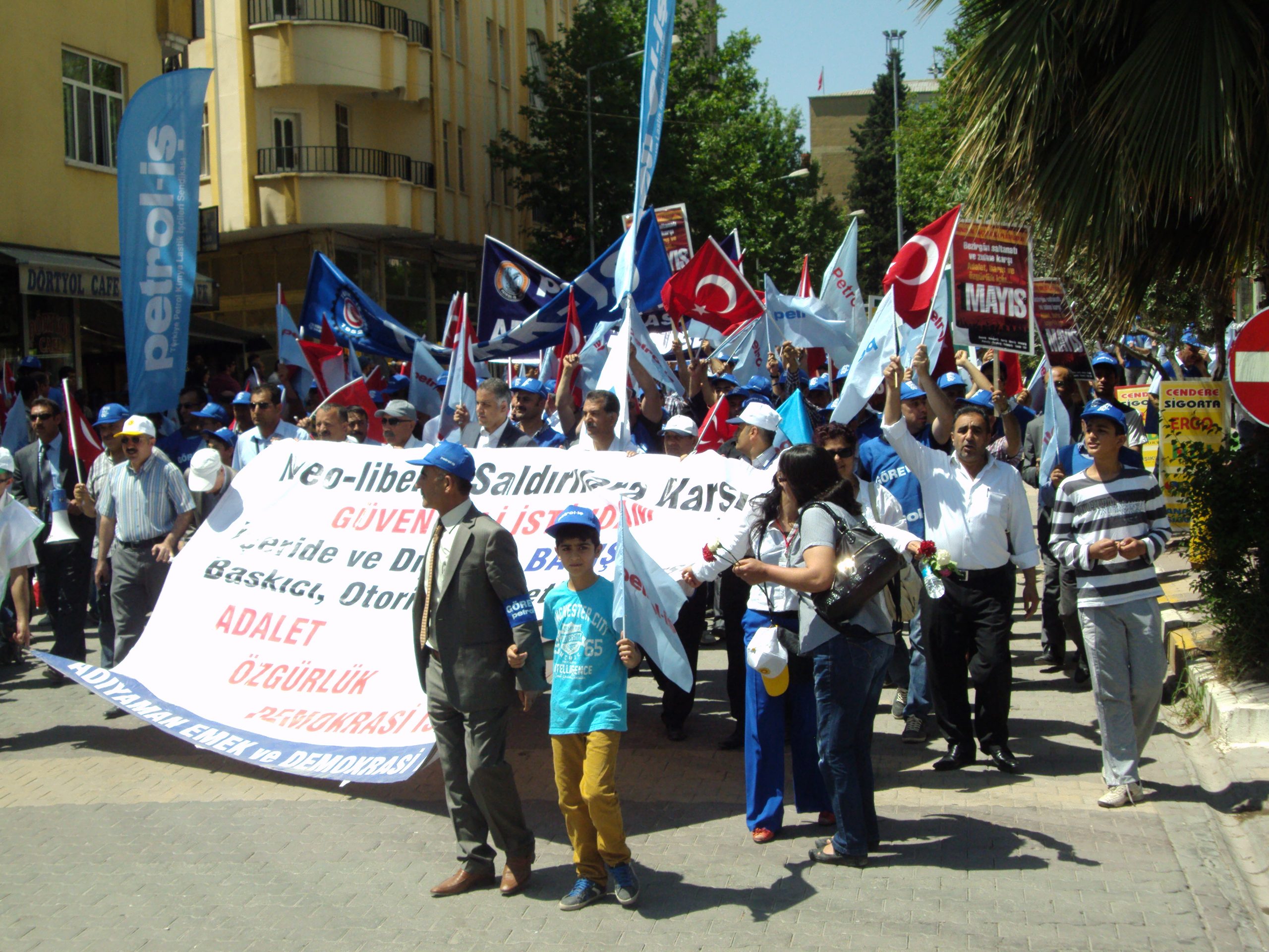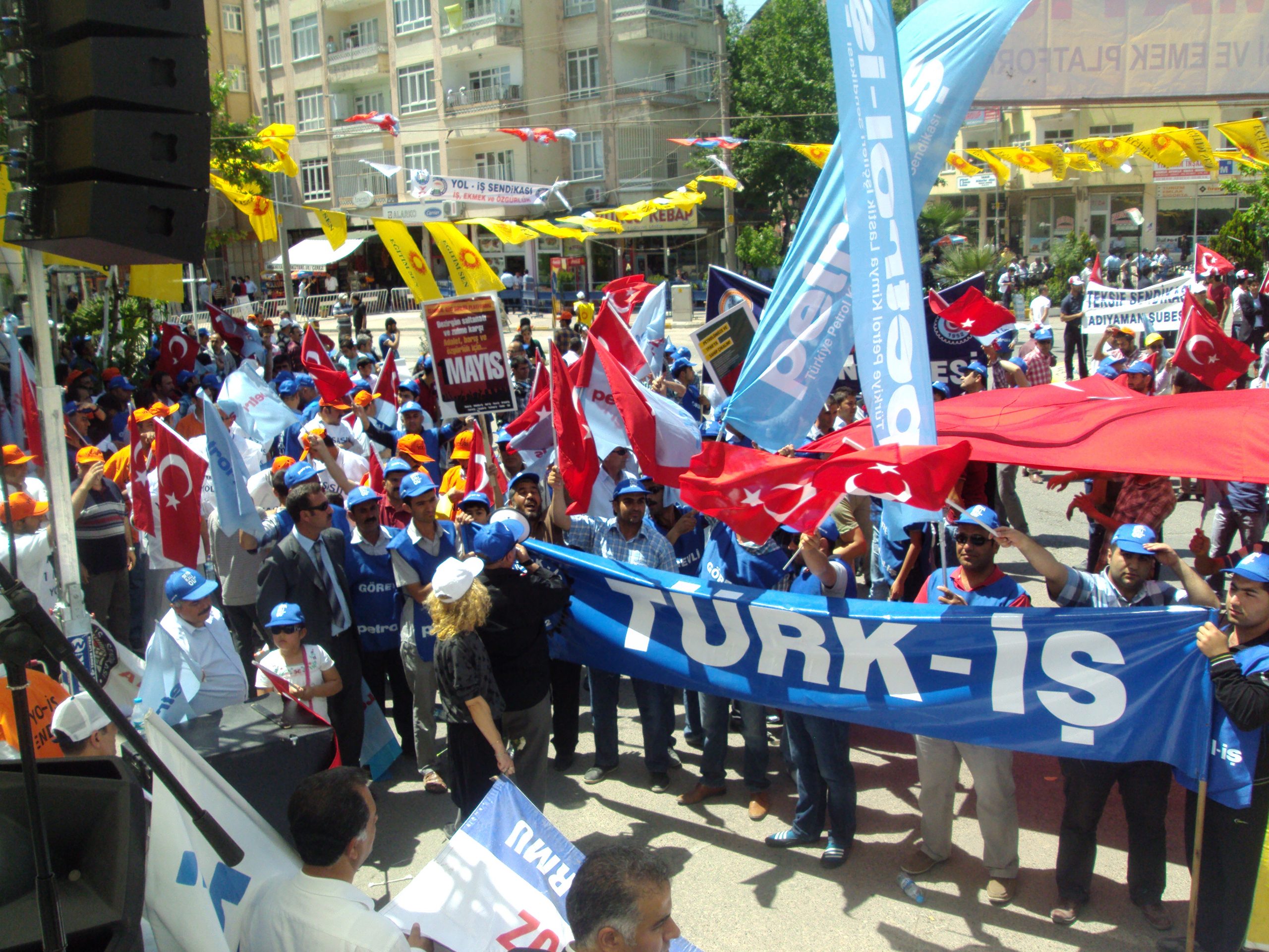 Bu meydanlara hakkı müdaafa günü olan 1 Mayıs’da AVM şantiyelerinde yanan işçileri anmak için, barajlarda boğulan işçileri anmak için, sigortasız işçinin yetim çocuğunun gözyaşını silmek için, işçinin alınteri kurumadan ücretini verin buyuran yüce önderin mesajını iletmek için. Emeğin hesabını sormak için, alınterinin hesabını sormak için ekmeğini yediğimiz vatanın bayrağı ile 1 Mayıs işçi bayramına Adıyaman Petrol-İş Sendikası olarak katıldık.