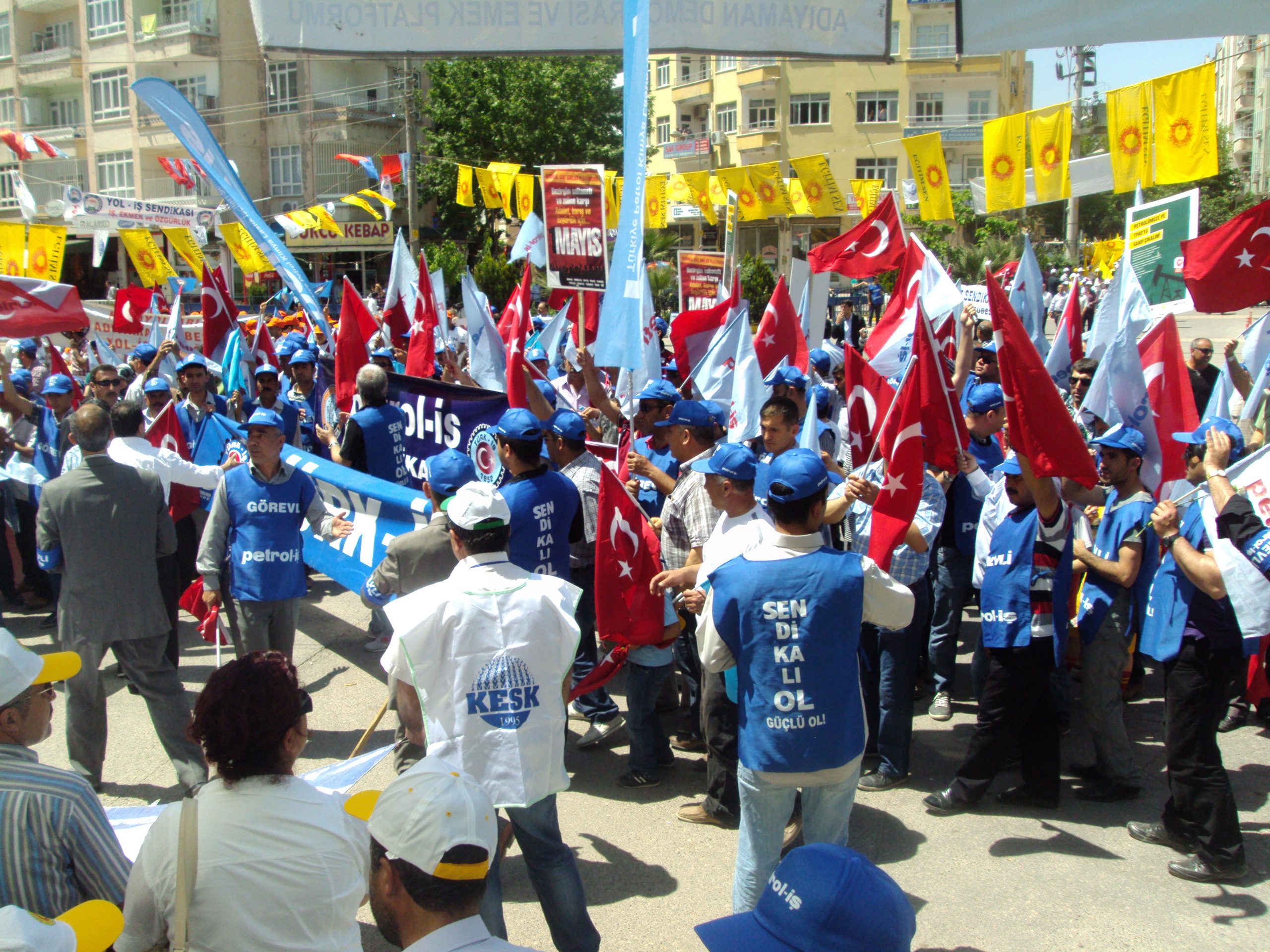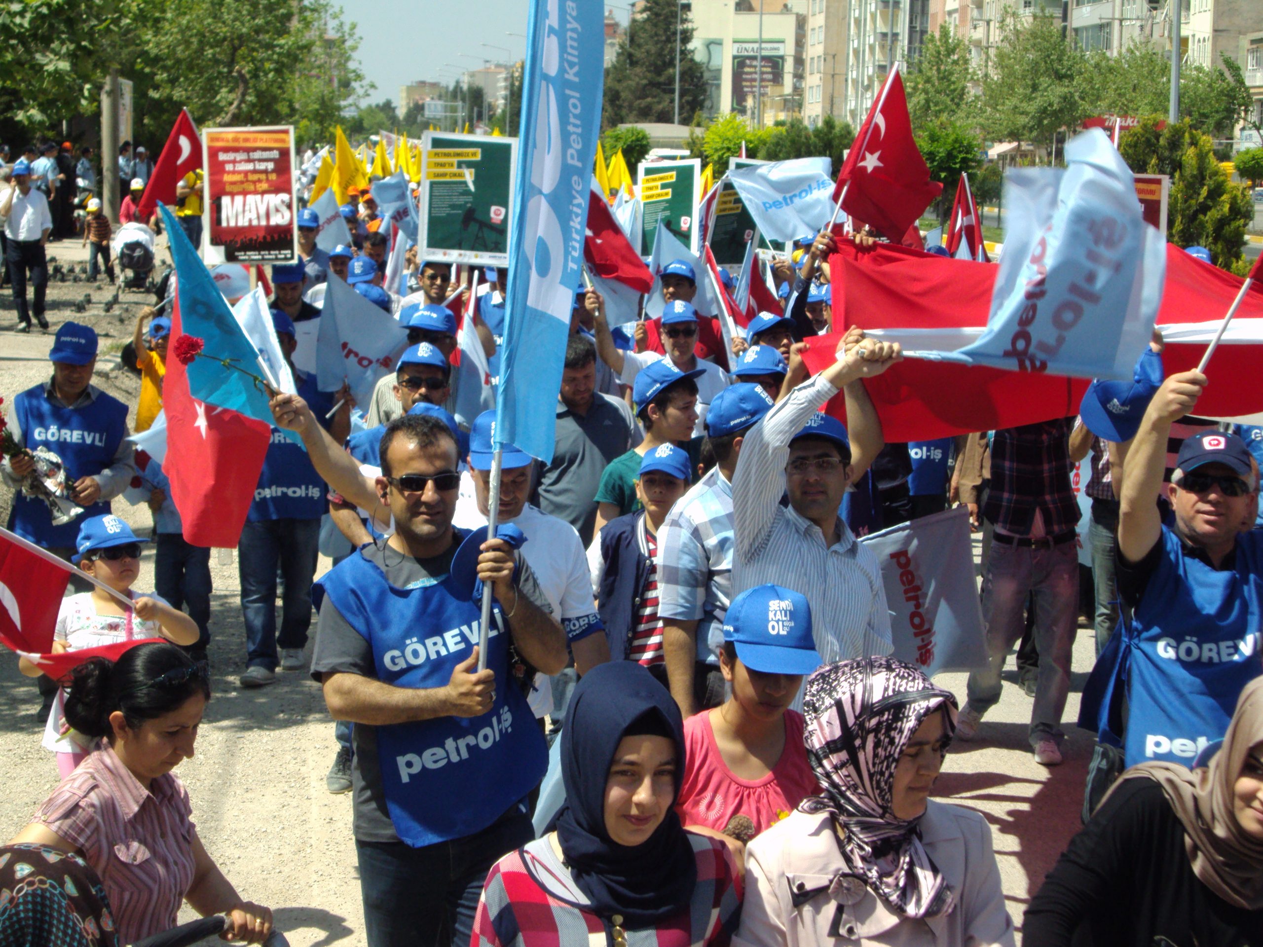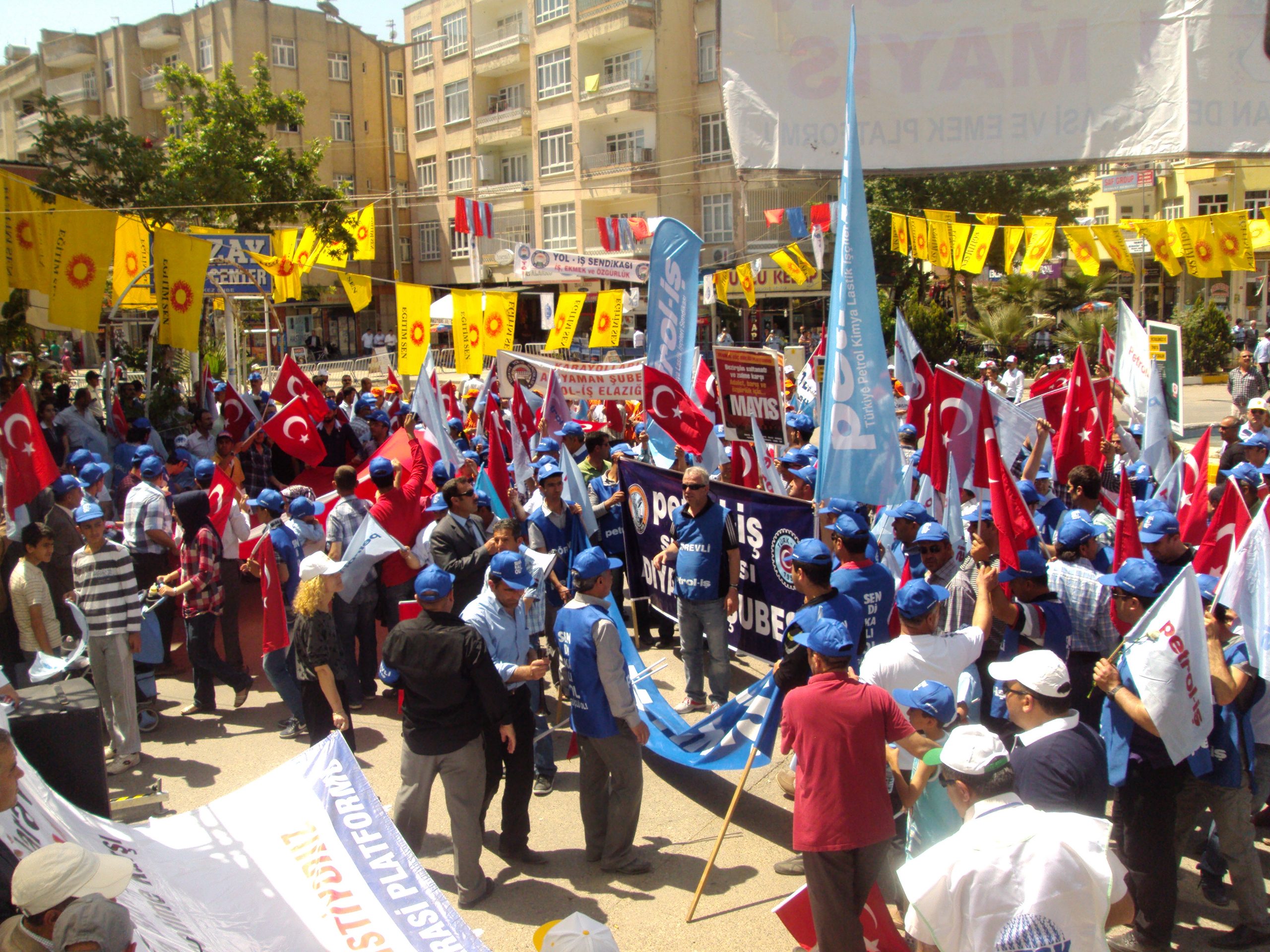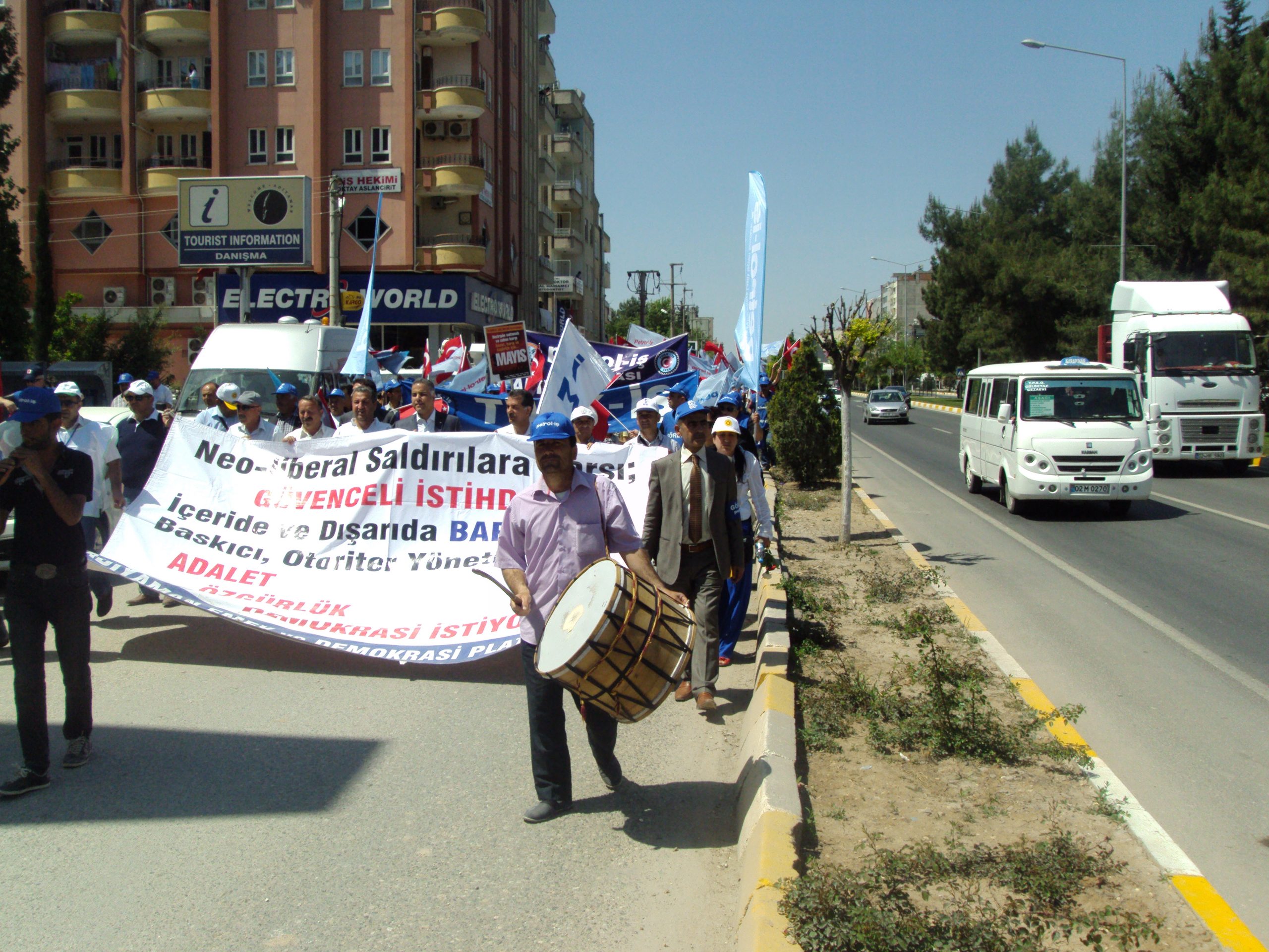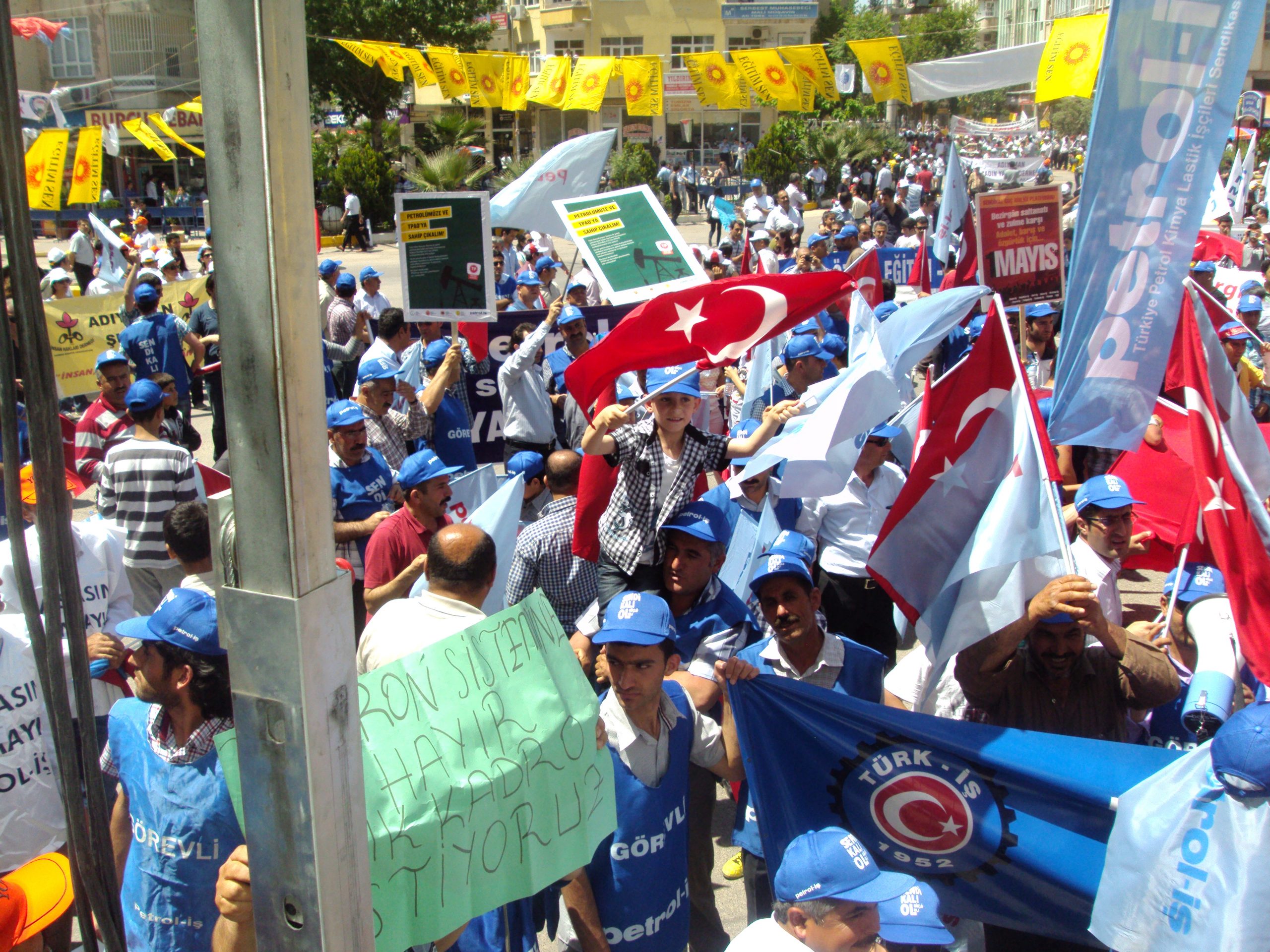 Bu meydanlara hakkı müdaafa günü olan 1 Mayıs’da AVM şantiyelerinde yanan işçileri anmak için, barajlarda boğulan işçileri anmak için, sigortasız işçinin yetim çocuğunun gözyaşını silmek için, işçinin alınteri kurumadan ücretini verin buyuran yüce önderin mesajını iletmek için. Emeğin hesabını sormak için, alınterinin hesabını sormak için ekmeğini yediğimiz vatanın bayrağı ile 1 Mayıs işçi bayramına Adıyaman Petrol-İş Sendikası olarak katıldık.