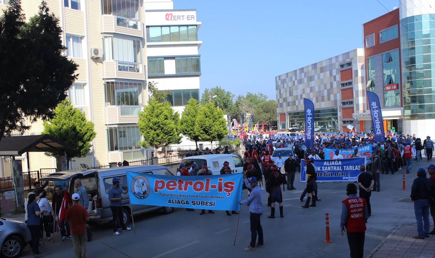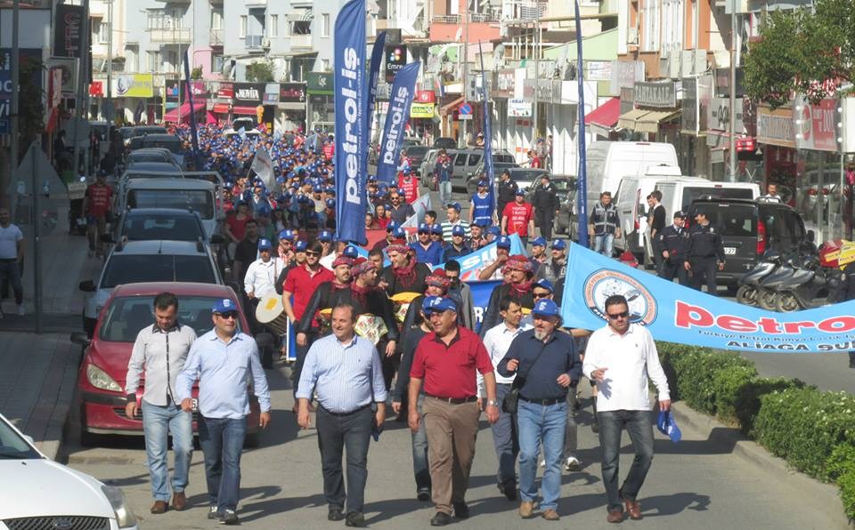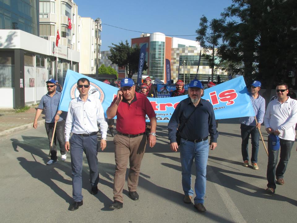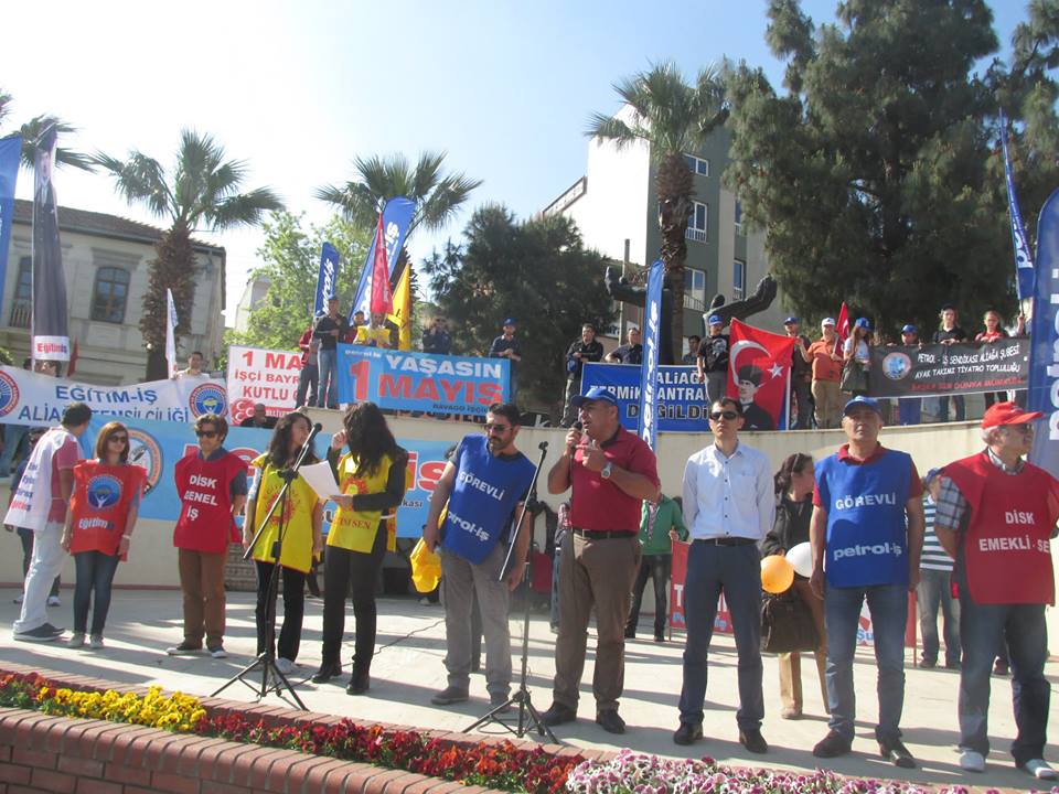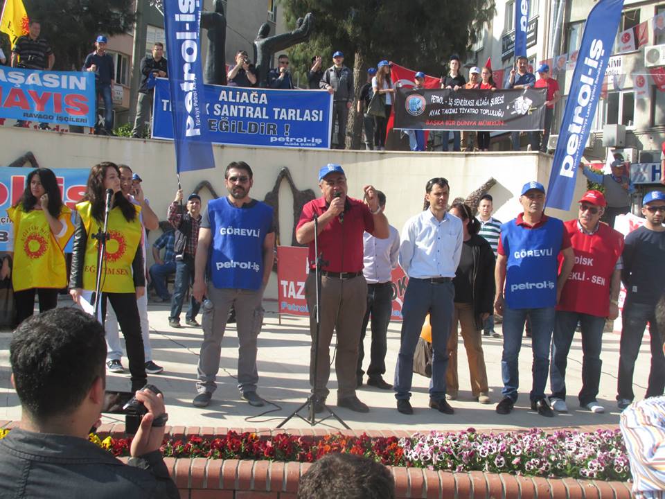 Petrol-iş Sendikası Aliağa Şube Başkanı Ahmet Oktay, “İstanbul kaynıyor. İstanbul’da feribot seferlerini iptal ettiler. Metrobüsleri, otobüsleri iptal ettiler. Çünkü korkuyorlar. Bizden korktukları için Taksim’i bize kapattılar. Taksim’i emekçilere kapatan zihniyeti bir kez daha bu meydanlardan kınıyoruz. 1 Mayıs’ta Taksim’de ödediğimiz bedelleri hepimiz biliyoruz. Taksim Meydanı’nın anlamı bizim için çok büyüktür. Taksim Meydanı’nın bizim için simgesel bir anlamı vardır. Ama bizlere orayı yasaklıyorlar. Bir kez daha bize Taksim Meydanı’nı yasaklayanları buradan şiddetle kınıyoruz” dedi.