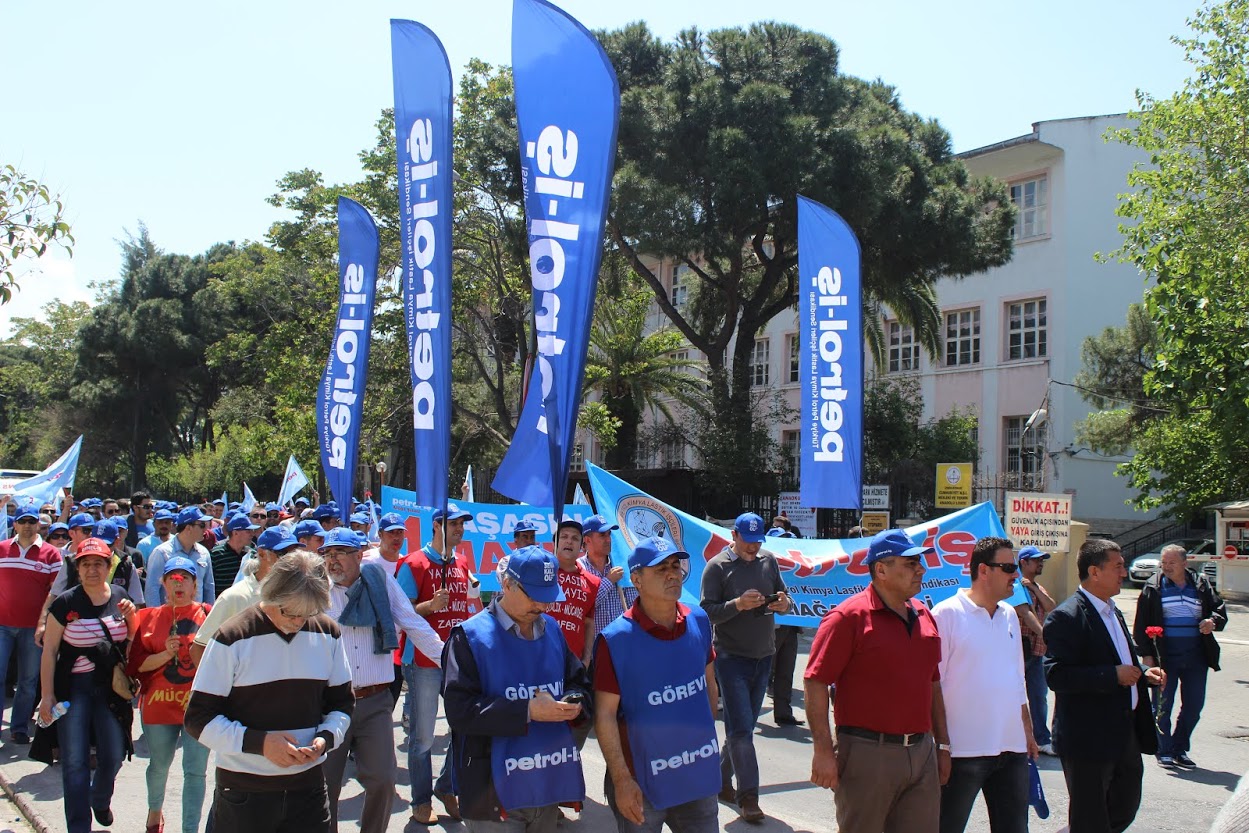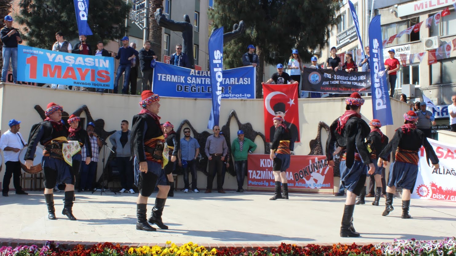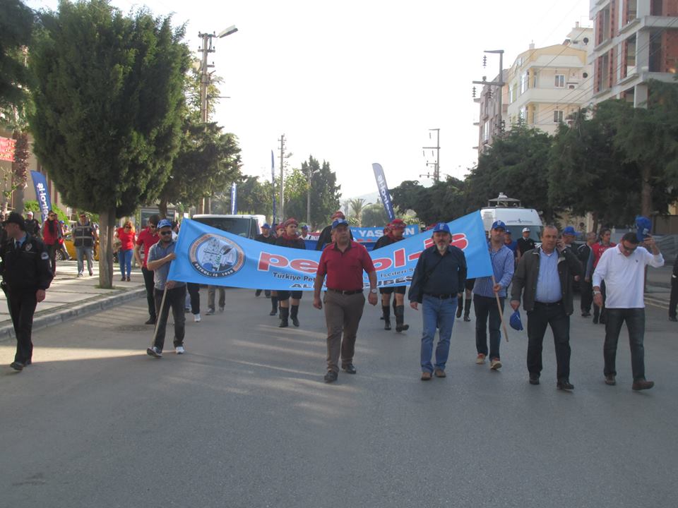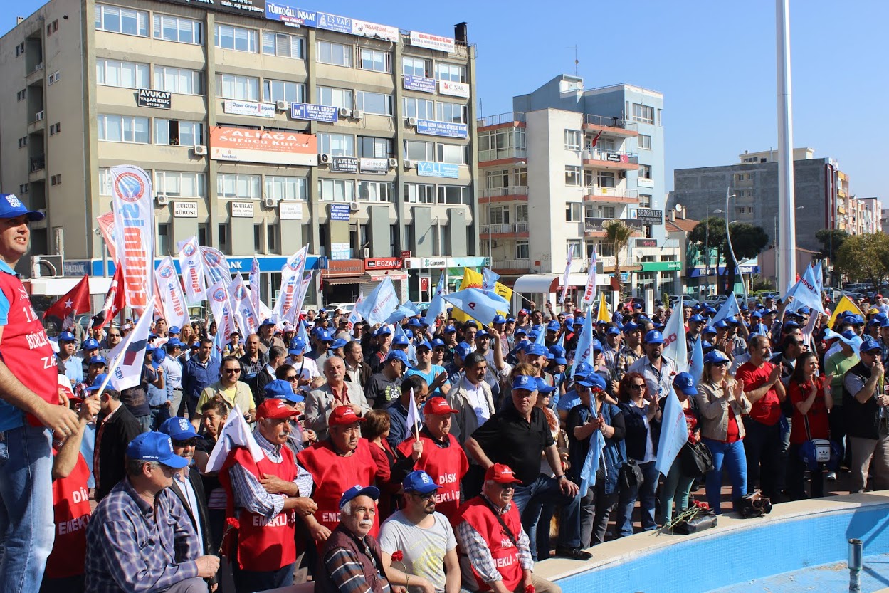 Petrol-iş Sendikası Aliağa Şube Başkanı Ahmet Oktay, “İstanbul kaynıyor. İstanbul’da feribot seferlerini iptal ettiler. Metrobüsleri, otobüsleri iptal ettiler. Çünkü korkuyorlar. Bizden korktukları için Taksim’i bize kapattılar. Taksim’i emekçilere kapatan zihniyeti bir kez daha bu meydanlardan kınıyoruz. 1 Mayıs’ta Taksim’de ödediğimiz bedelleri hepimiz biliyoruz. Taksim Meydanı’nın anlamı bizim için çok büyüktür. Taksim Meydanı’nın bizim için simgesel bir anlamı vardır. Ama bizlere orayı yasaklıyorlar. Bir kez daha bize Taksim Meydanı’nı yasaklayanları buradan şiddetle kınıyoruz” dedi.