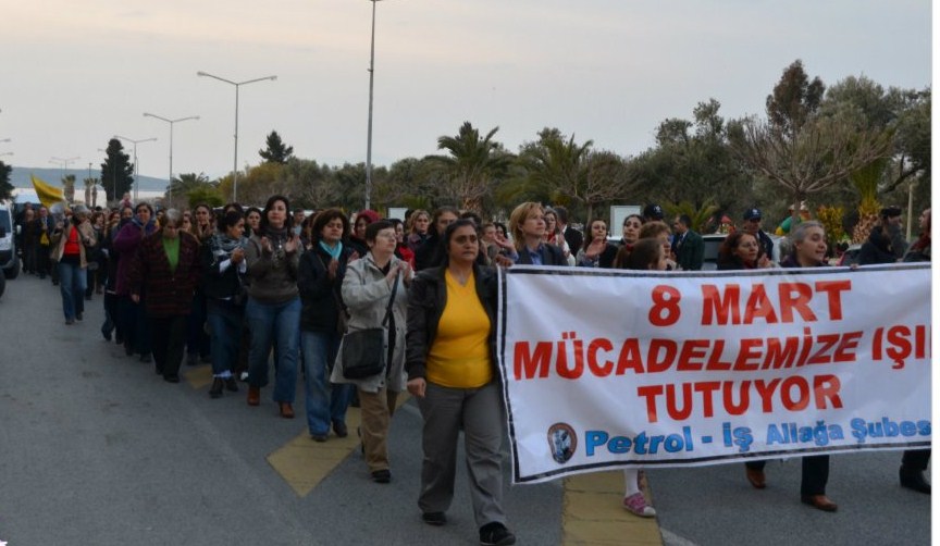 Yapılan konuşmaların ardından Türk-İş Ege Bölgesi Başkan Yardımcısı Tuncay KİREÇKAYA ve Petrol-İş Aliağa Şube Başkanımız İsmail DOĞAN Tüpraş ve Petkim işyerlerini ziyaret ederek çalışan kadın üyelerimizin “8 Mart Dünya Emekçi Kadınlar Günü” nü kutladılar. Akşam saat:17.30’da sendikamız önünde toplanarak Aliağa Demokrasi Meydanına yürüyüş düzenlendi. Petkim çalışanı üyemiz Ebru ER’in okuduğu şiirin ardından BES işyeri temsilcisi Ayşe HAMARAT bir basın açıklaması yaptı. Yapılan basın açıklamasının ardından Meydan’da bulunan kalabalık Menemen’e, Savranoğlu Deri’ye giderek Savranoğlu Deri çalışanlarının direnişine destek ziyaretinde bulundular.