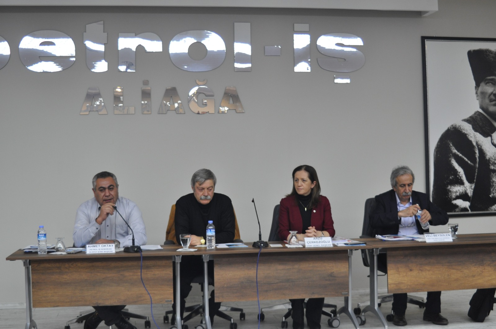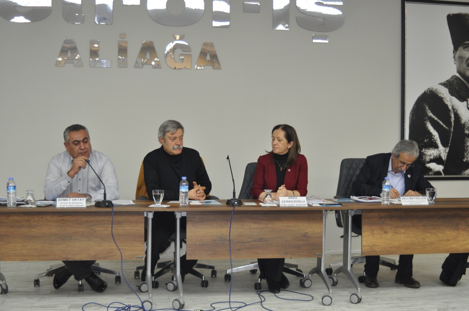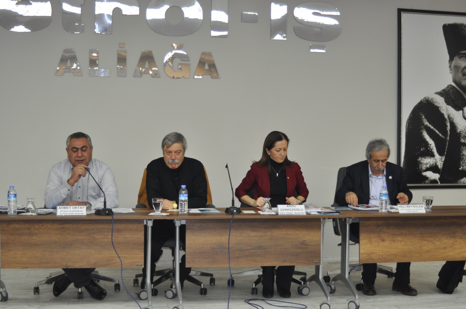 DİSK Tüm Emekliler Sendikası Aliağa Şubesi ‘Günümüzde Emekçinin ve Emeklinin Sorunu’ konulu bir söyleşi gerçekleştirdi. Petrol İş Aliağa Şubesi Necmettin Giritlioğlu Konferans Salonu’nda düzenlenen söyleşiye DİSK Genel Başkanı Arzu Çerkezoğlu, DİSK Tüm Emekliler Sendikası Genel Başkanı Veli Beysülen ve Petrol İş Sendikası Aliağa Şube Başkanı Ahmet Oktay konuşmacı olarak katıldı. Katılımcılar arasında Emek ve Demorasi Platformu bileşenlerinin yanı sıra Petrol-İş PETKİM ve TÜPRAŞ İşyeri temsilcileri, CHP Aliağa İlçe Başkanı Gülsen Cirit ve yönetimi, İYİ Parti Aliağa İlçe Başkanı Yavuz Adar, CHP Aliağa Belediye Başkan Adayı Özcan Durmaz da vardı. Söyleşinin moderatörlüğünü DİSK Tüm Emekliler Sendikası Aliağa Şube Başkanı Sabahattin Yeşiltepe yaptı.