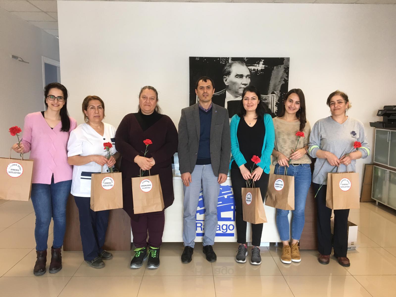 8 Mart Dünya Emekçi Kadınlar Gününde Aliağa Şube Başkanımız Ahmet Oktay, Şube Başkan Yardımcılarımız Veysel Gündüz ve Mevlüt Çınar, örgütlü olduğu işyerlerinde baştemsilciler ve temsilcilerin de katılımıyla kadın üyelerimizi çalıştıkları ünitelerde ziyaret etti. Flormar işyerinde çalışırken sendikaya üye oldukları için işten atılan Flormar çalışanı kadınların el emeği ürünlerini üyelerimize hediye ettiler.