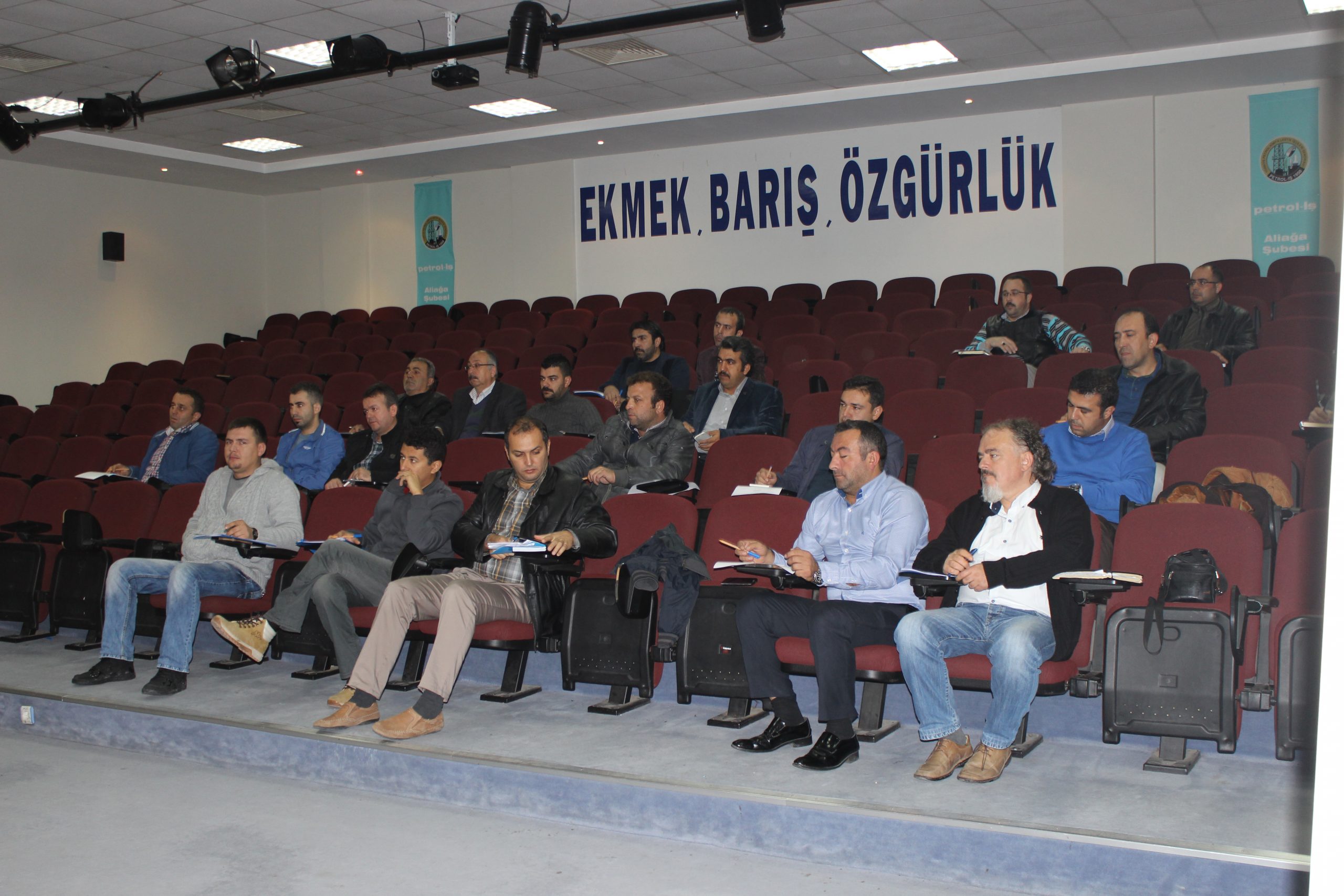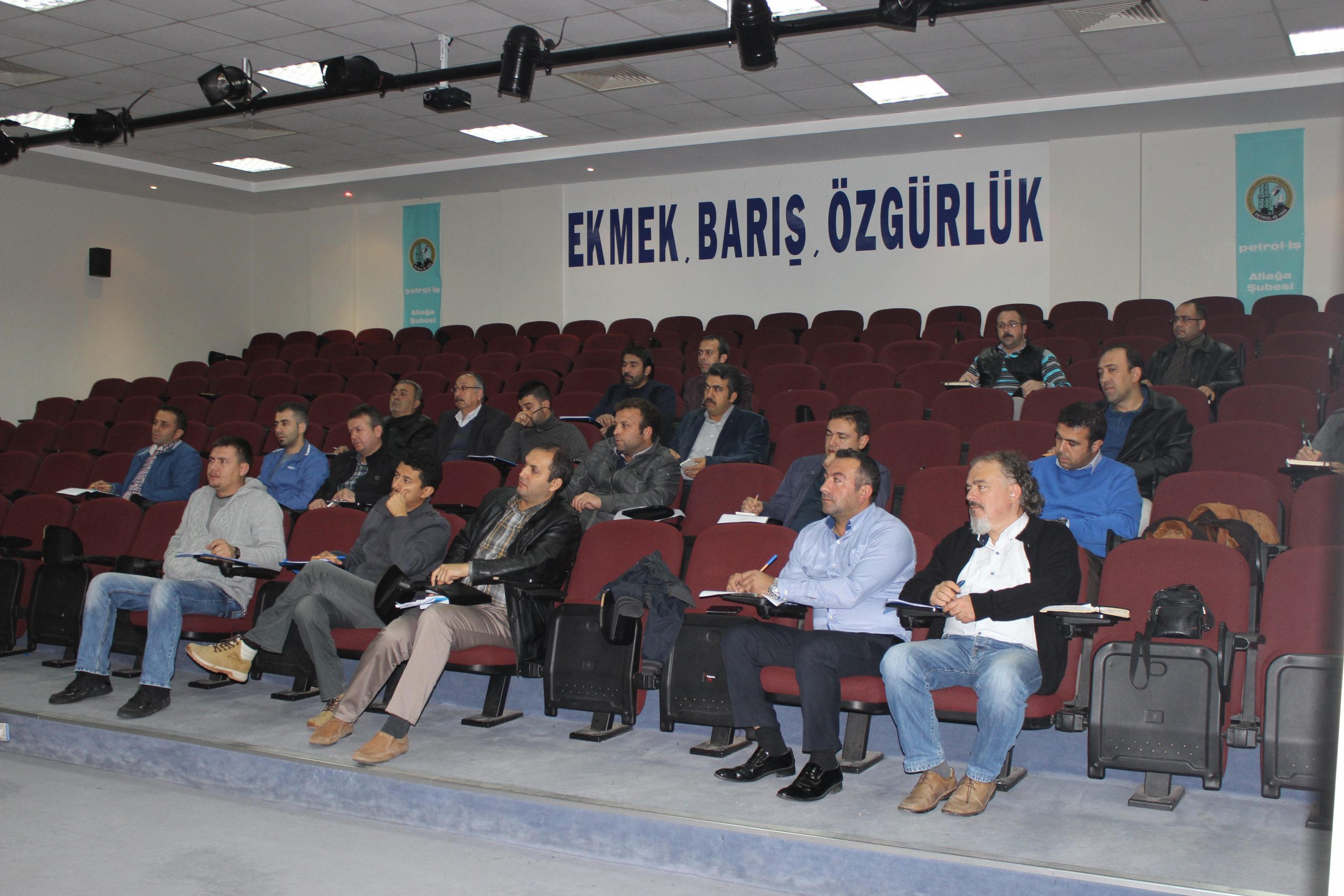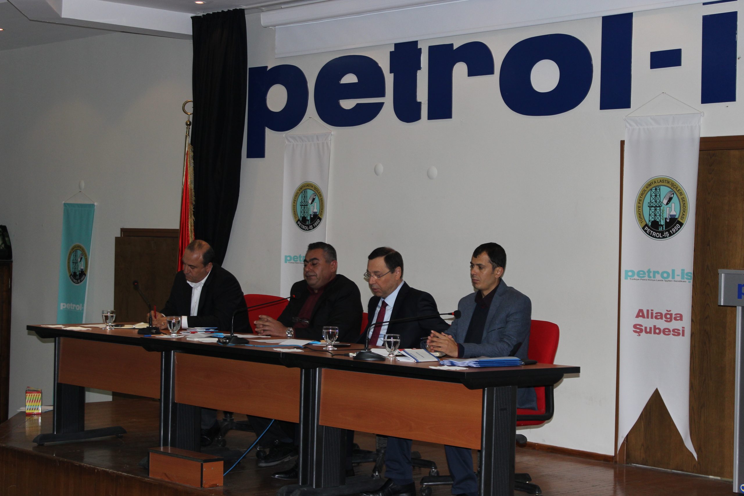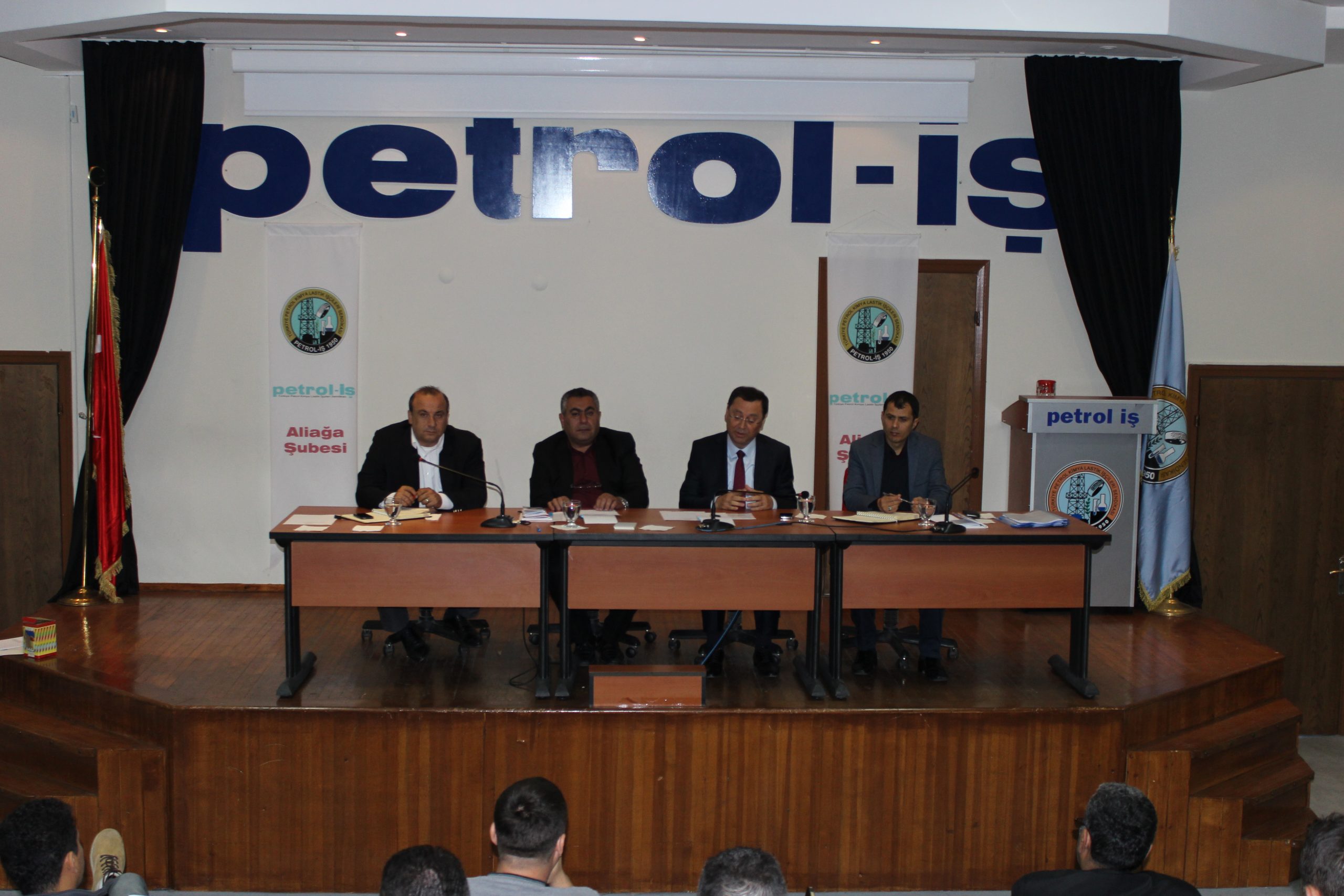 Petrol-İş Sendikası Aliağa Şubesi’nin Temsilciler Kurulu toplantısı, 31 Ekim Cuma günü, Genel Başkan Mustafa Öztaşkın’ın katılımıyla Aliağa Şube’de yapıldı. Toplantıda Ermenek ve Soma’da yaşanan iş cinayetlerinin yanısıra Filistin, Lazkiye, Musul-Kerkük, Telefer, Rojava ve Kobani’de yaşanan insanlık dramı da konuşuldu.