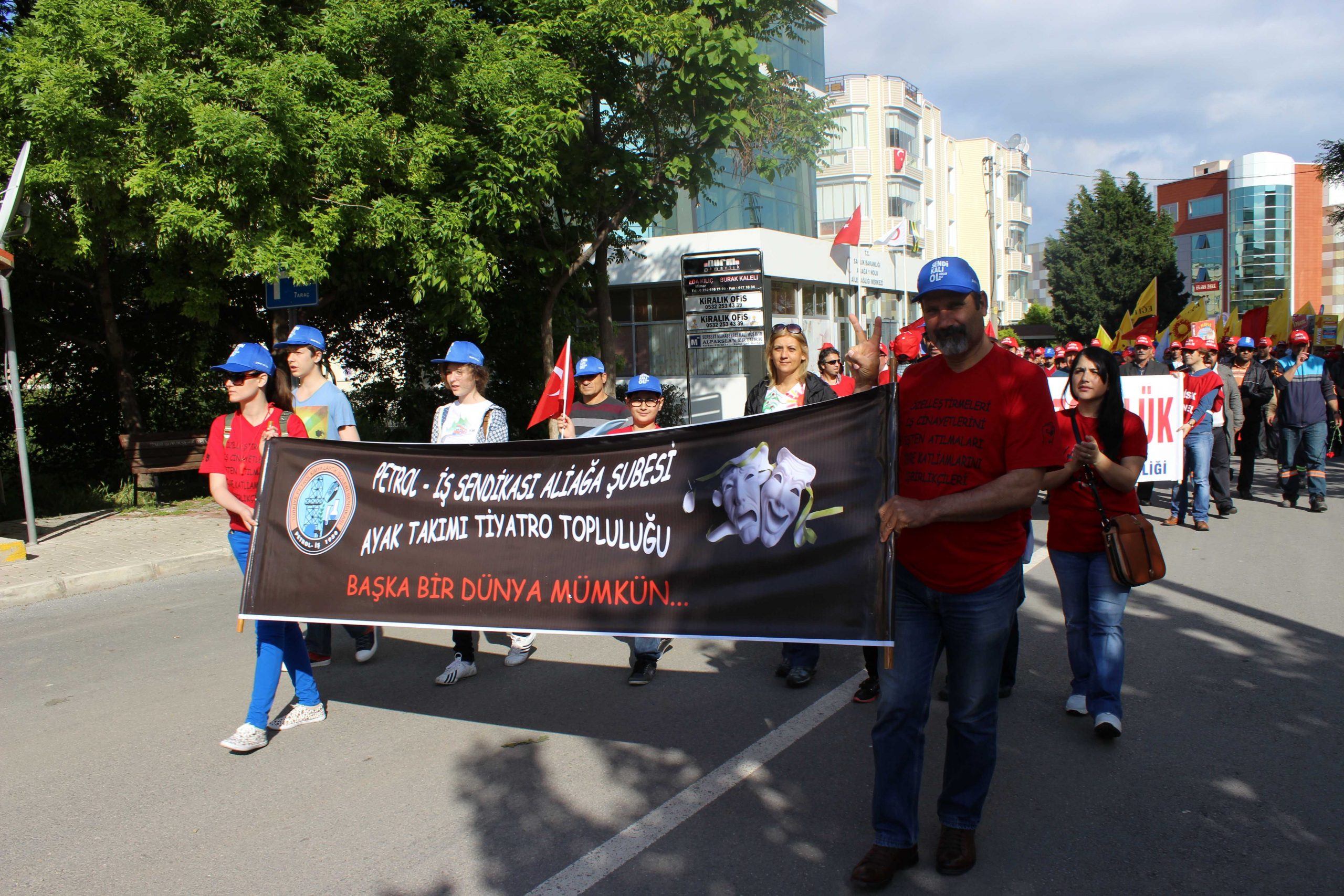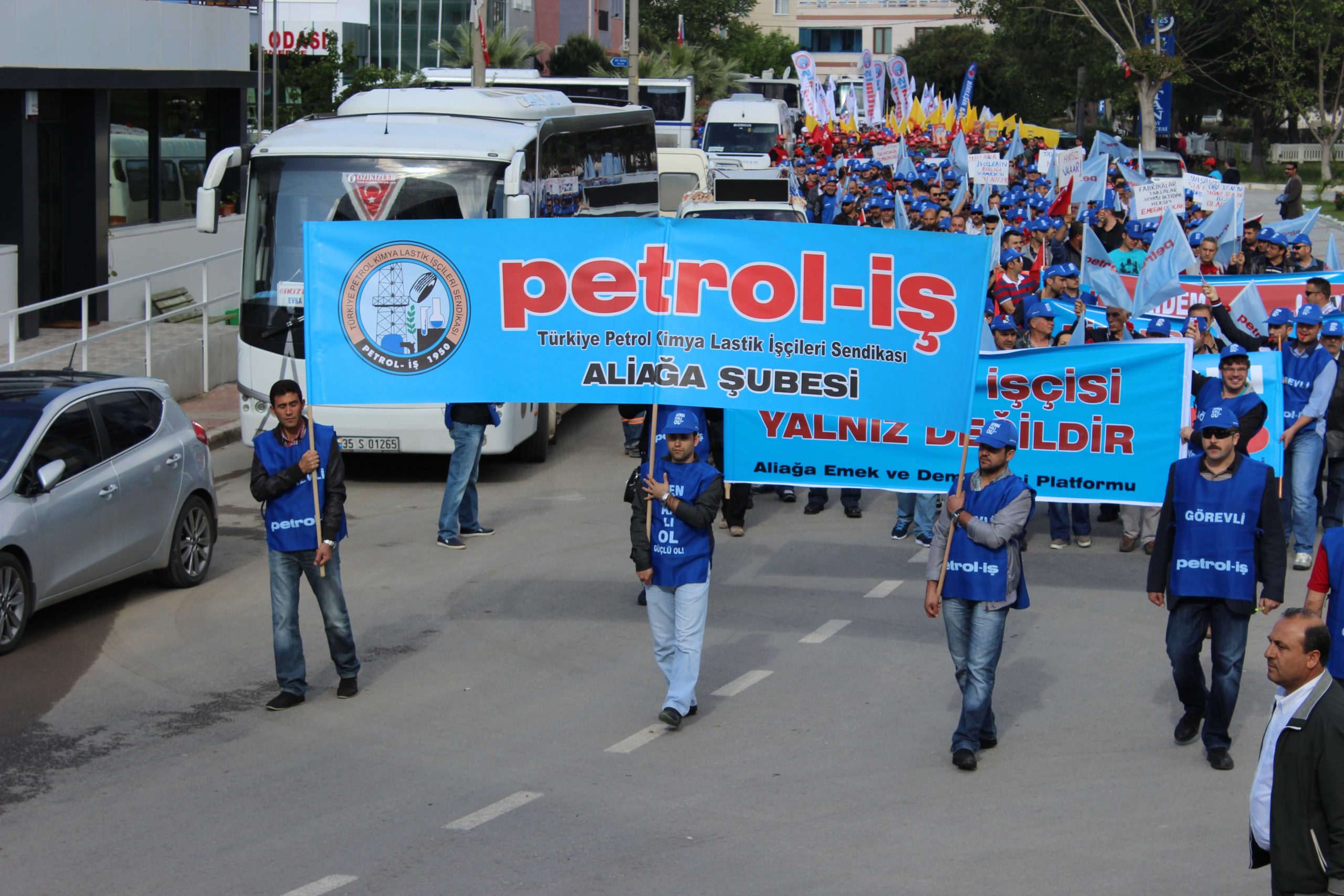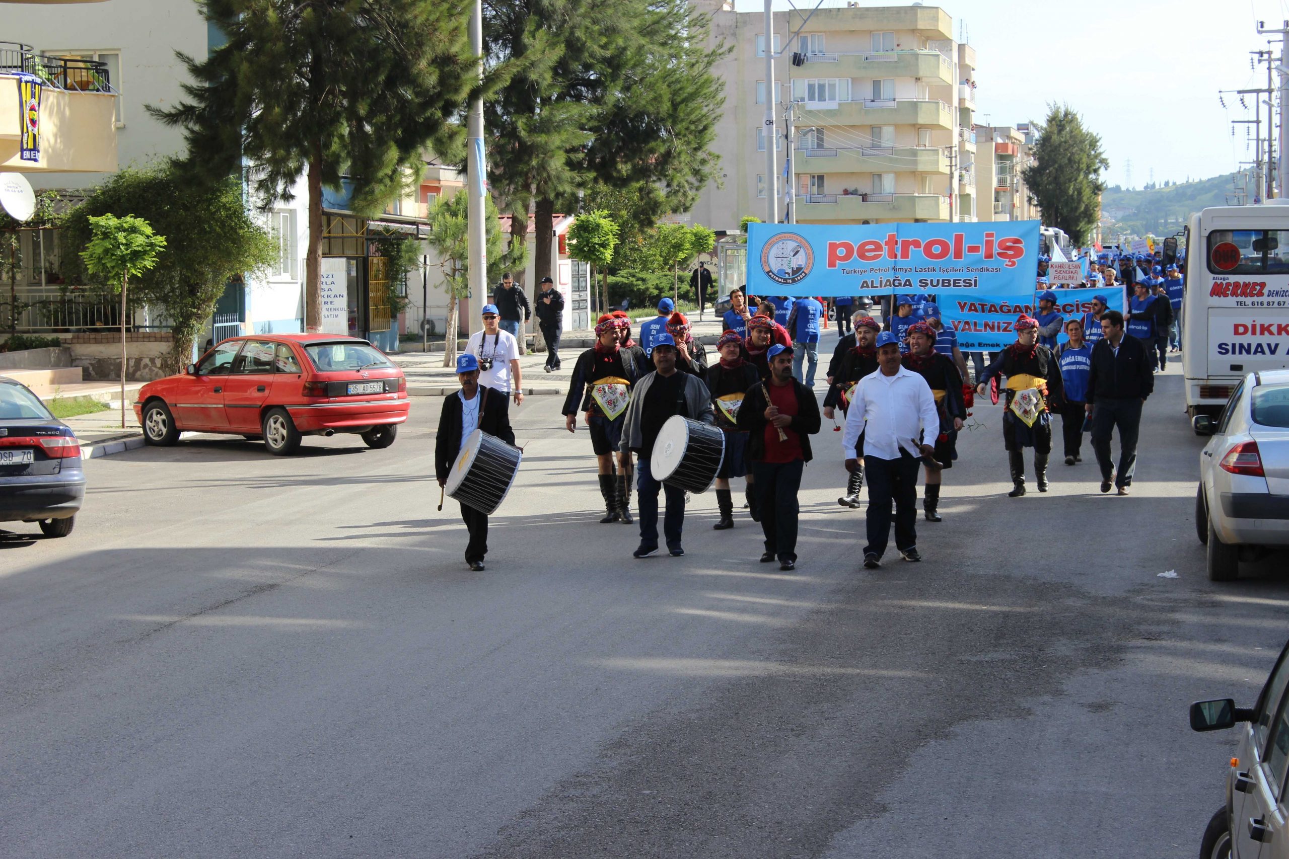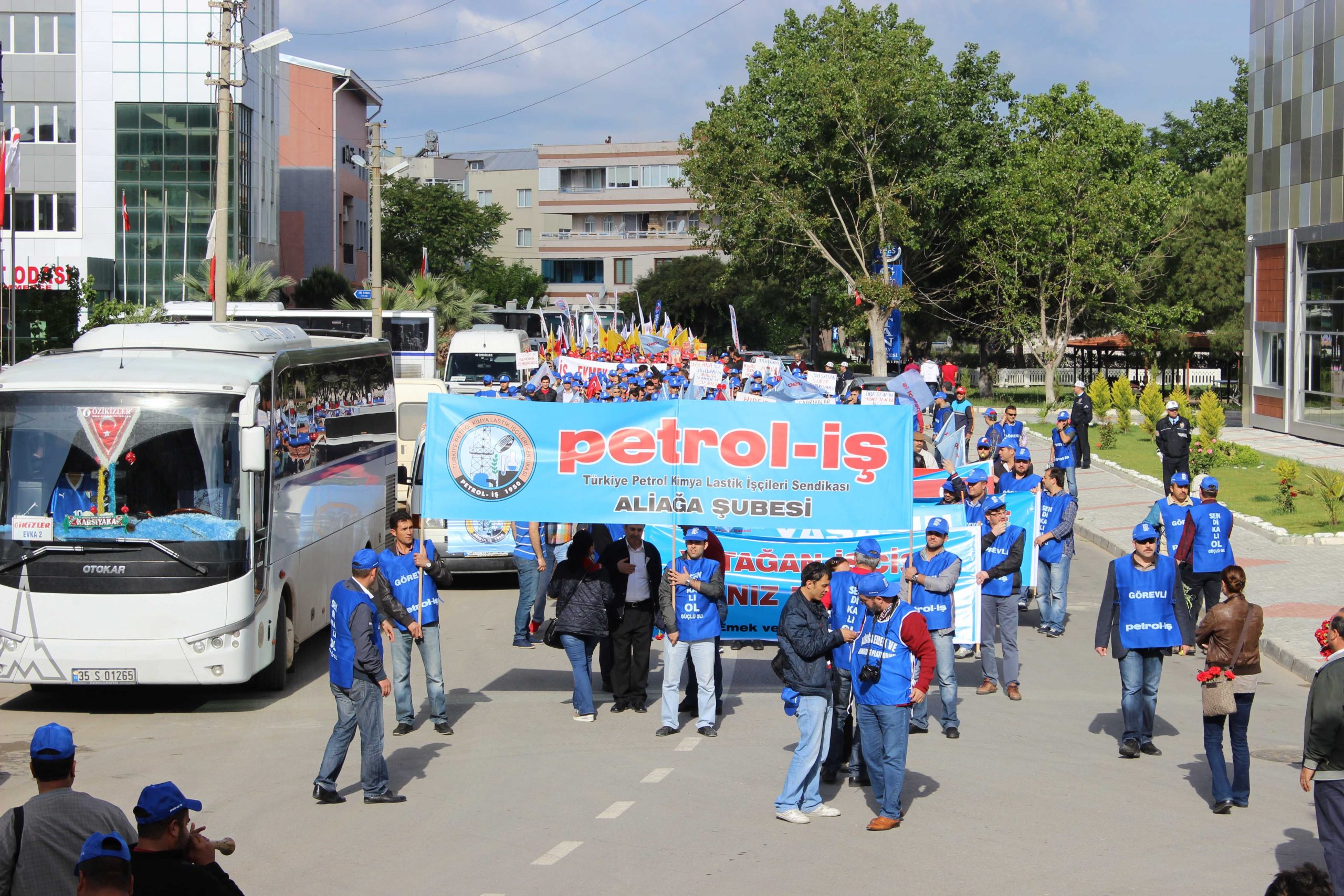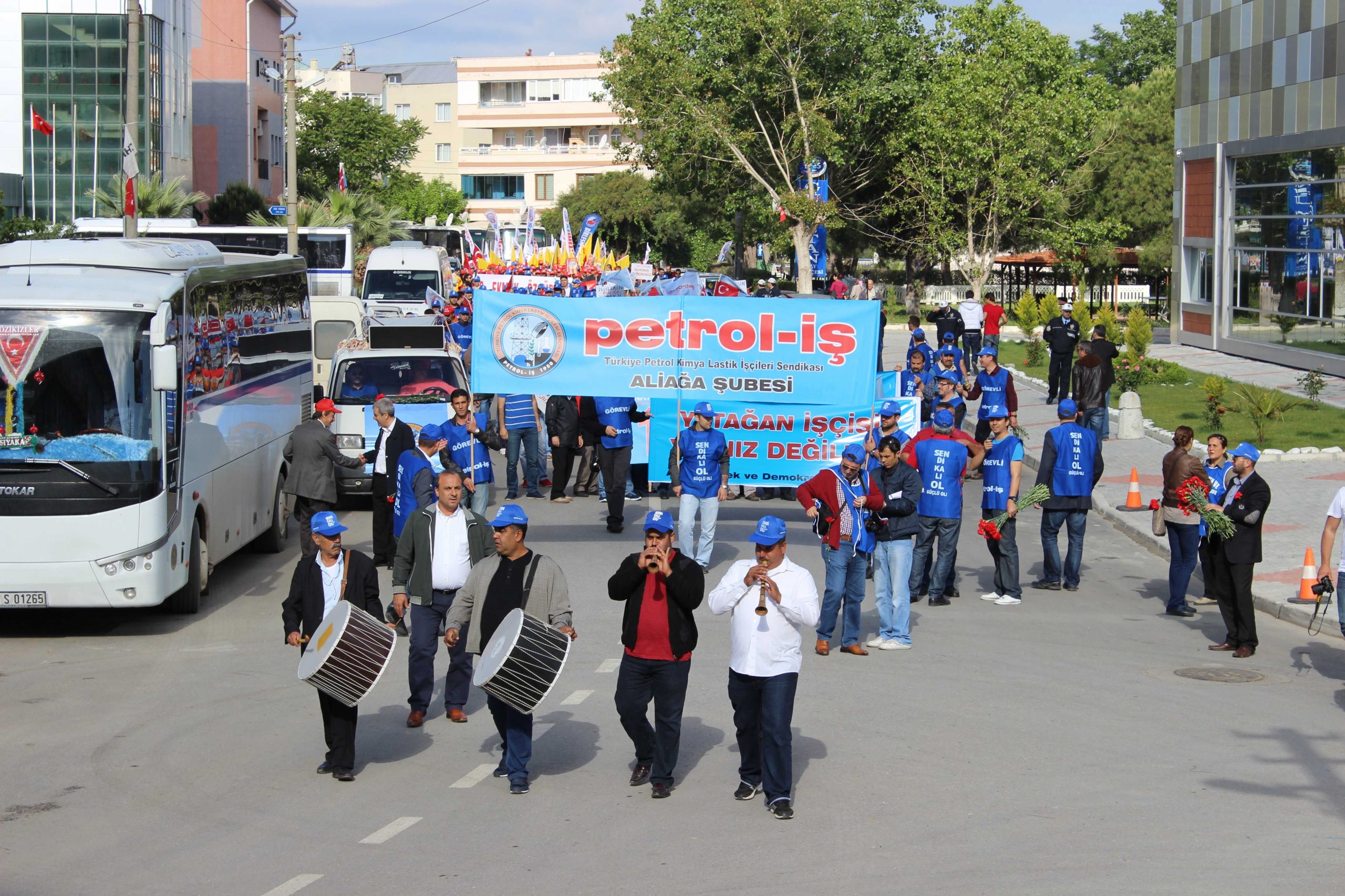 Daha sonra vardiyadan çıkan Petrol-İş üyeleri şube önünde Emek ve Demokrasi Platformu bileşenleriyle buluşarak, “Yaşasın İş-Emek-Özgürlük Mücadelemiz, İşte 1 Mayıs Alanlardayız, Taşeronlaşmaya Hayır” sloganları eşliğinde Atatürk Caddesi önünden Aliağa Demokrasi Meydanı’na doğru yürüyüşe geçti.
