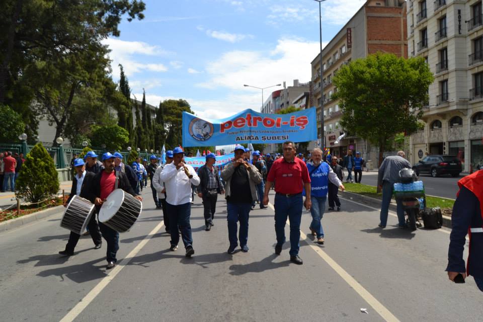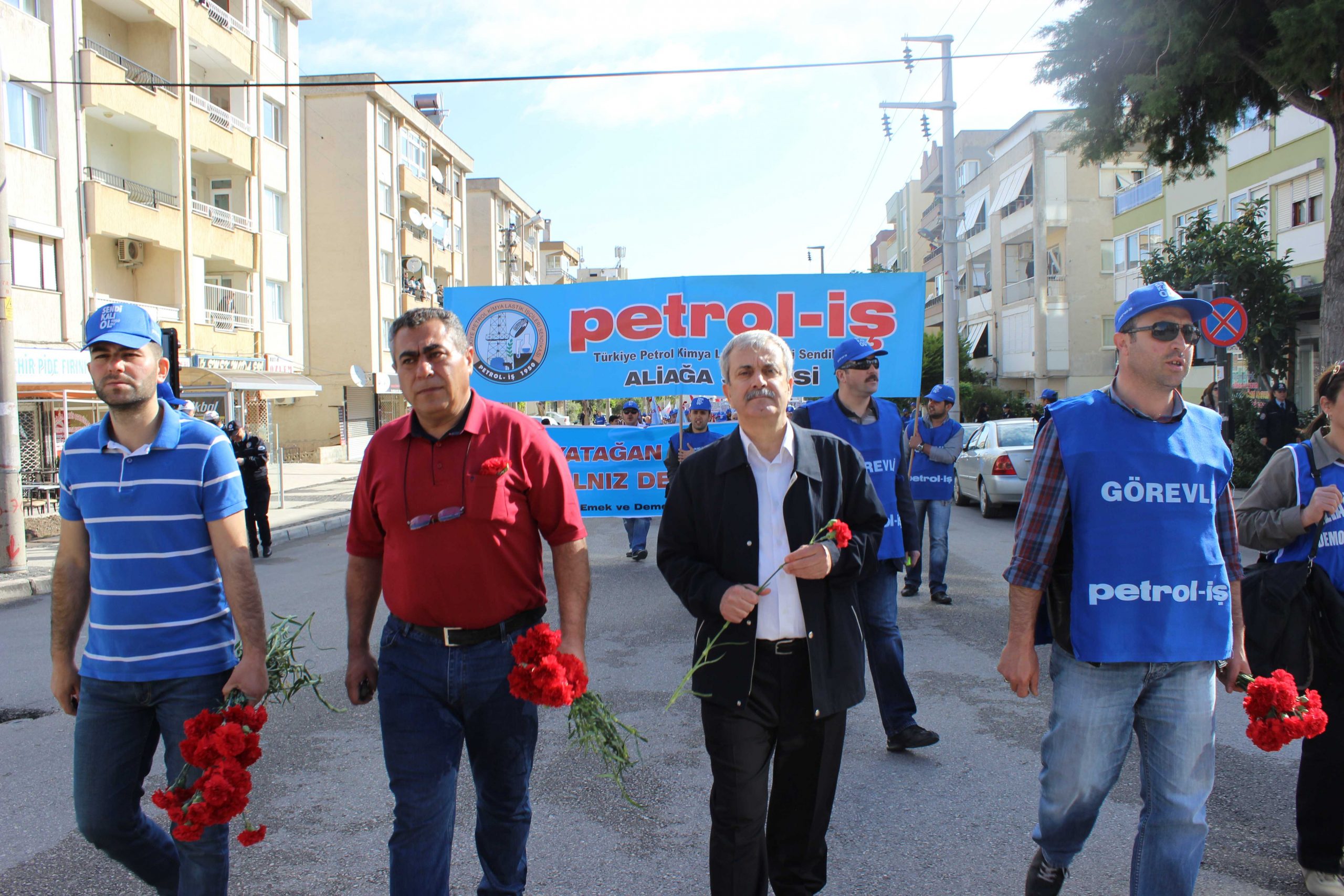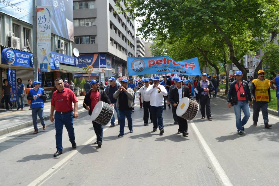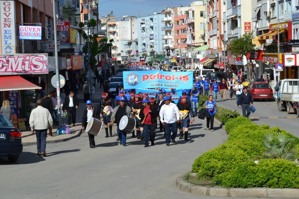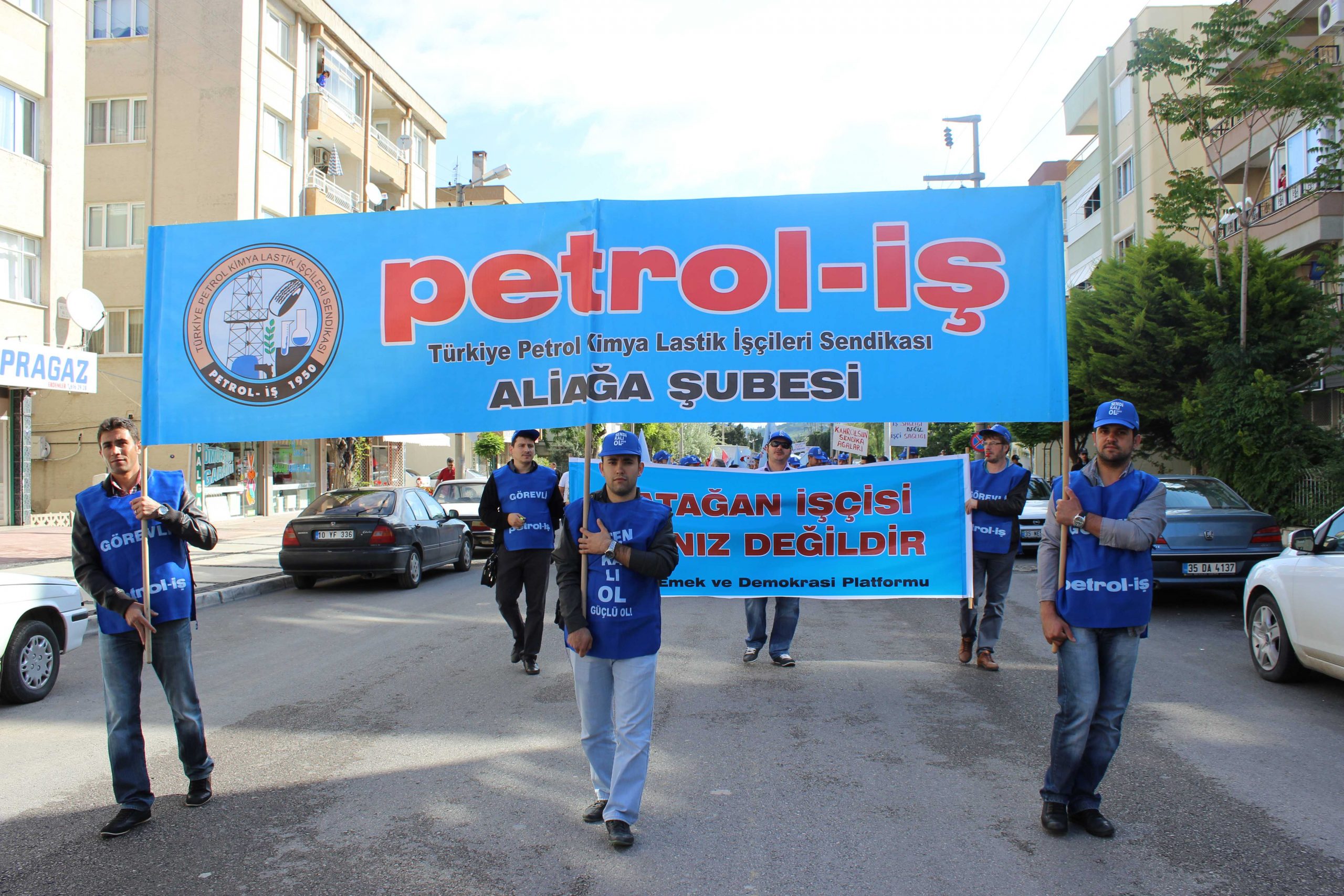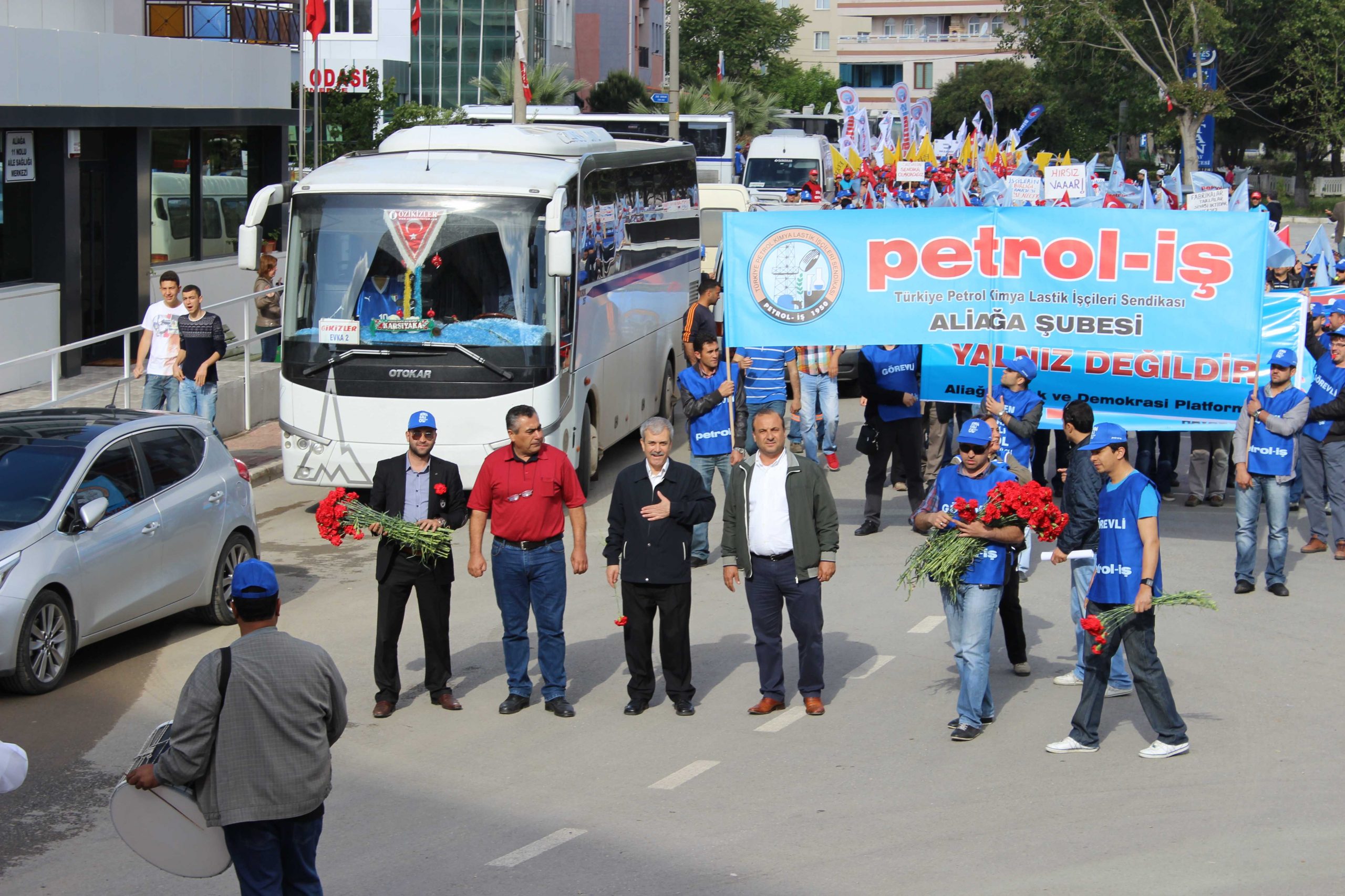 Daha sonra vardiyadan çıkan Petrol-İş üyeleri şube önünde Emek ve Demokrasi Platformu bileşenleriyle buluşarak, “Yaşasın İş-Emek-Özgürlük Mücadelemiz, İşte 1 Mayıs Alanlardayız, Taşeronlaşmaya Hayır” sloganları eşliğinde Atatürk Caddesi önünden Aliağa Demokrasi Meydanı’na doğru yürüyüşe geçti.