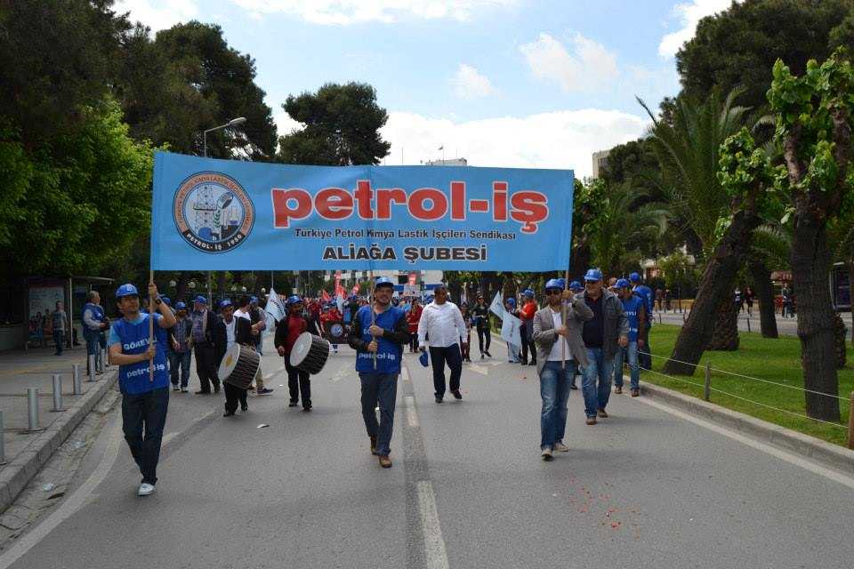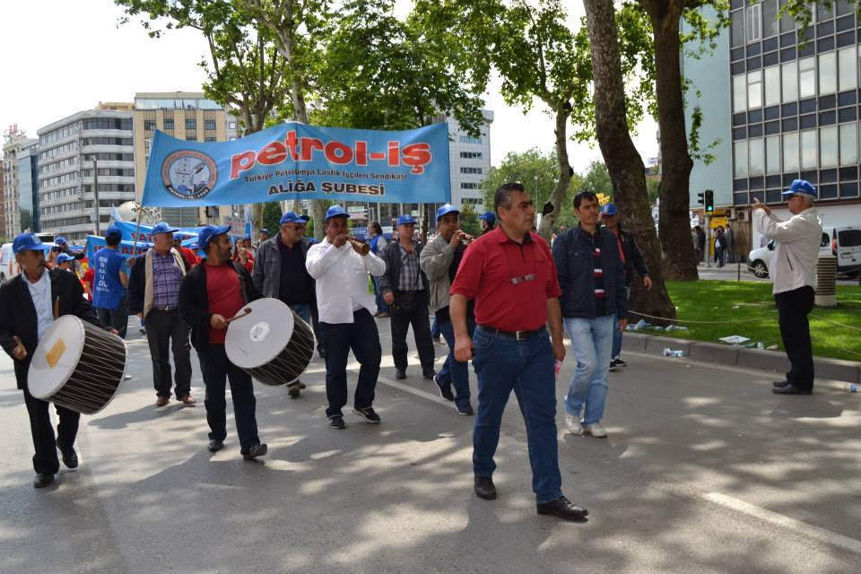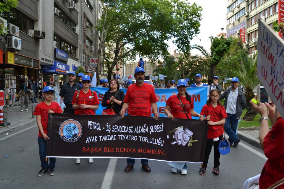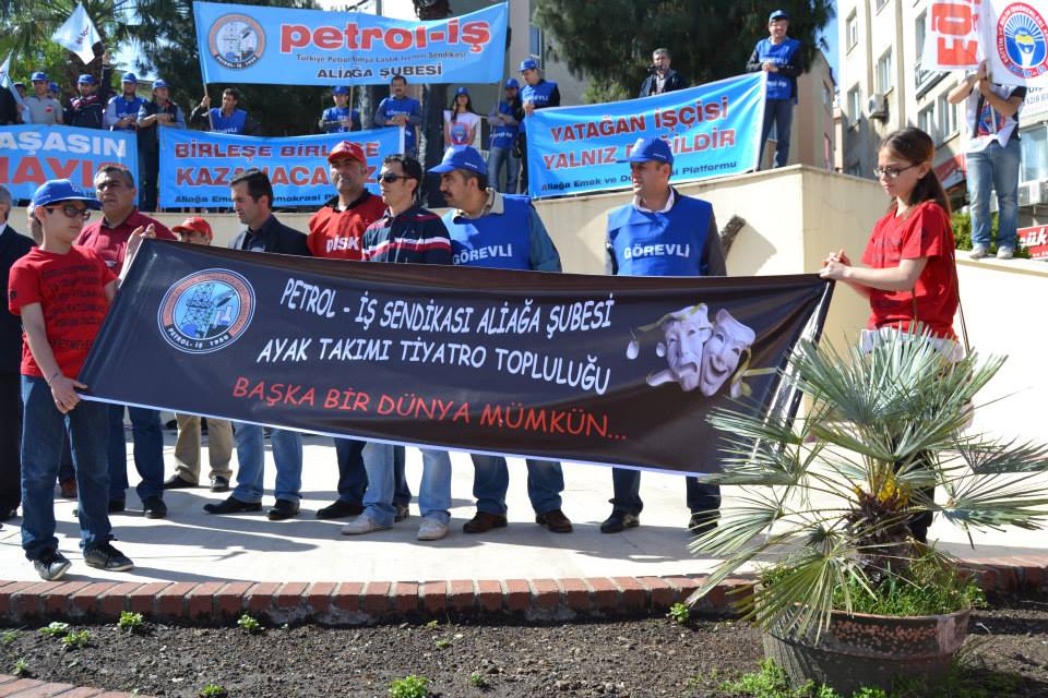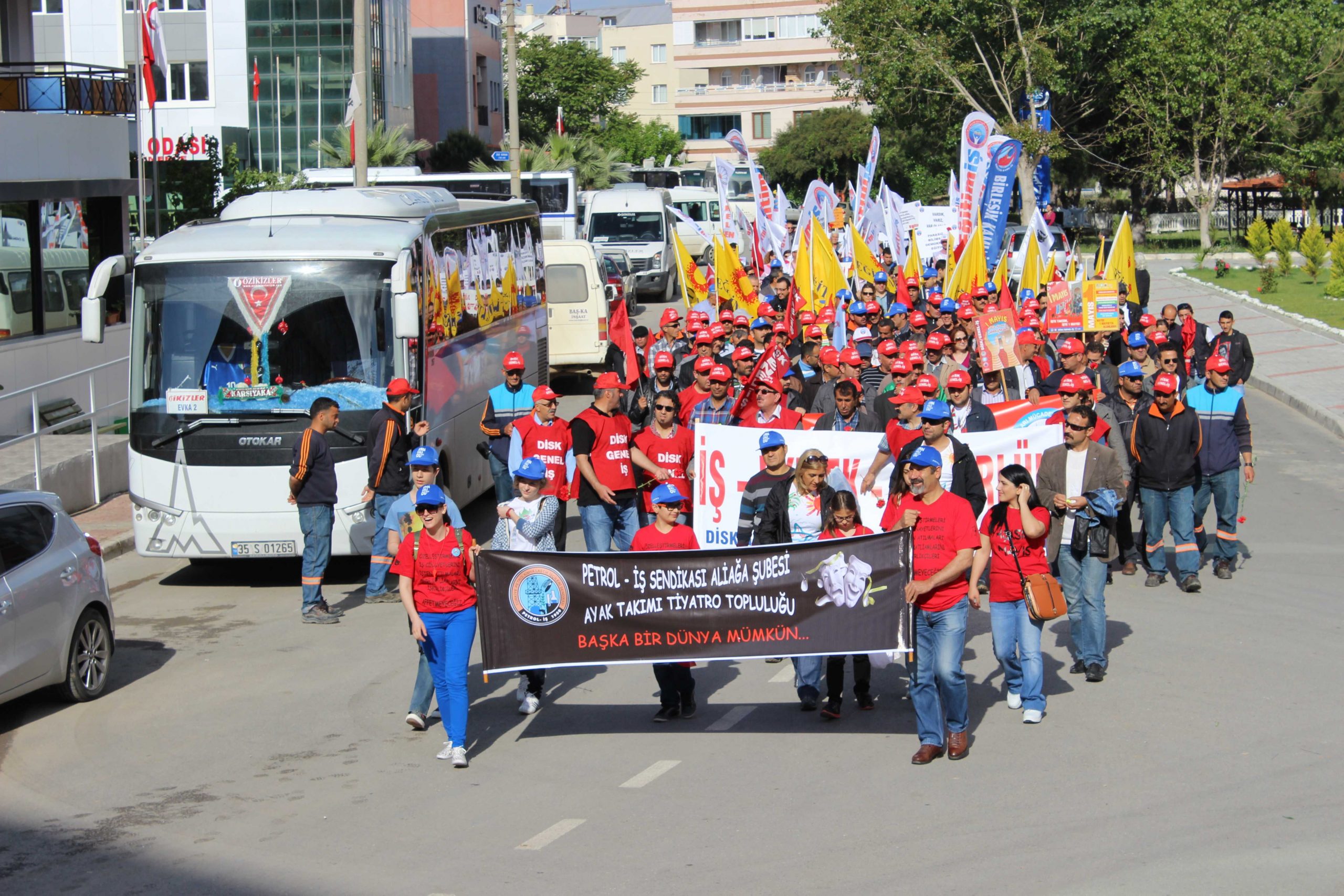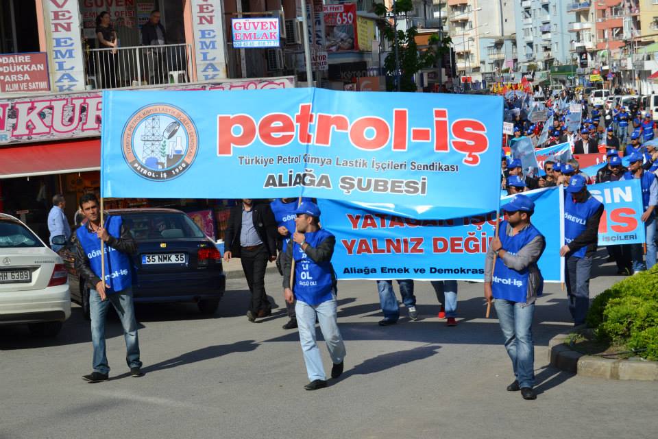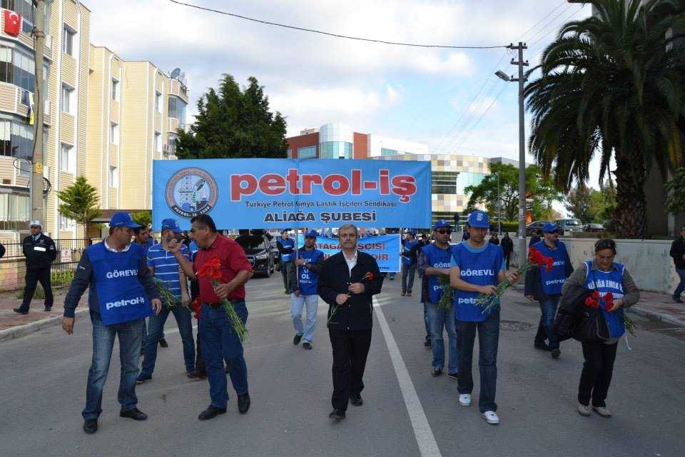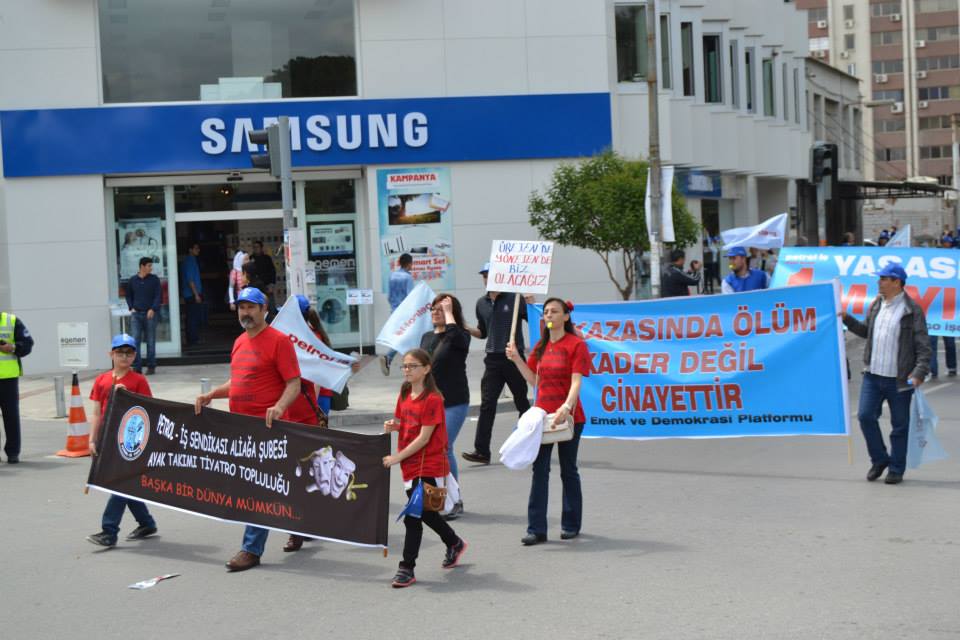 Daha sonra vardiyadan çıkan Petrol-İş üyeleri şube önünde Emek ve Demokrasi Platformu bileşenleriyle buluşarak, “Yaşasın İş-Emek-Özgürlük Mücadelemiz, İşte 1 Mayıs Alanlardayız, Taşeronlaşmaya Hayır” sloganları eşliğinde Atatürk Caddesi önünden Aliağa Demokrasi Meydanı’na doğru yürüyüşe geçti.