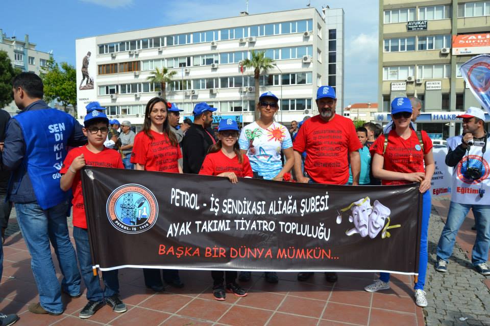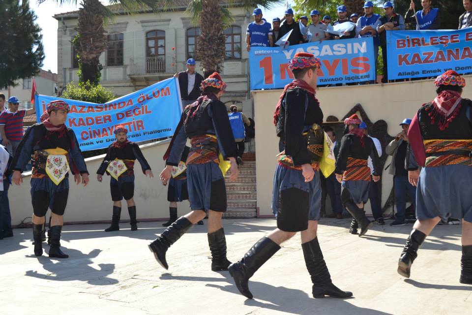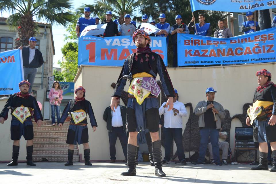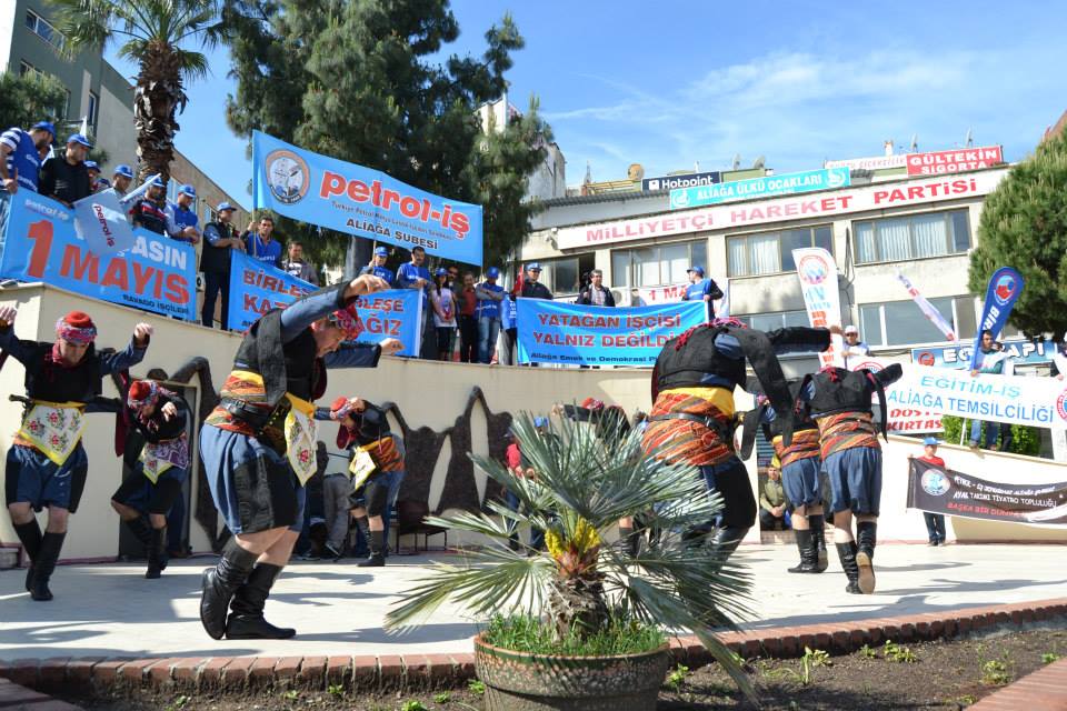 Aliağa Demokrasi Meydanı’nda yapılan 1 Mayıs kutlaması davul zurna eşliğinde, halaylarla sona erdi. Kutlamanın ardından Aliağa Şubesi’nde örgütlü Petrol-İş üyeleri, İzmir Gündoğdu Meydanı’nda mitingine katılmak üzere yola çıktı.