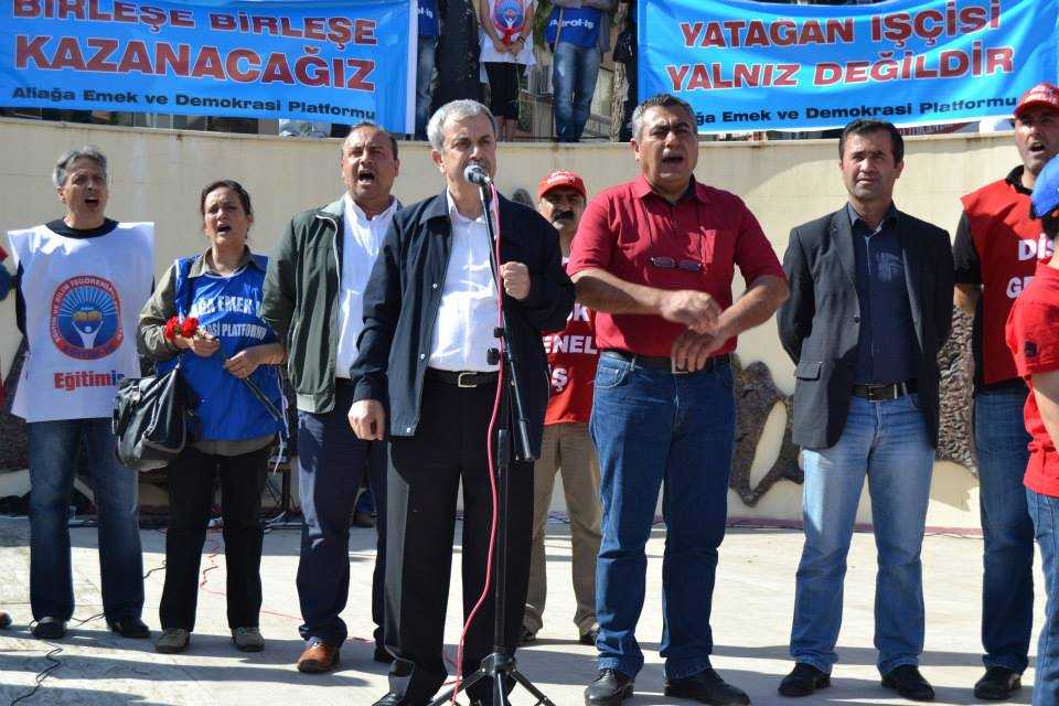 Ahmet Oktay’ın ardından 1 Mayıs kutlamaları için Aliağa’da bulunan Petrol-İş Sendikası Genel Mali Sekreteri İbrahim Doğangül de bir konuşma yaptı. Konuşmasına 1 Mayıs’ın uluslar arası niteliğine ve geçmişte verilen mücadelelerin önemine değinerek başlayan Doğangül, “1 Mayıs’ın kökü dünyanın her yerindedir. Bugün dünyanın her yanında işçiler taleplerini haykırıyor. Baskıcı hükümetlere karşı direniyorlar ve daha iyi bir yaşam için meydandalar. Başbakan, “Taksim’i biz açmıştık, biz kapatırız ve 1 Mayıs’ı biz tatil yapmıştık” dedi. Kusura bakmasın, Taksimi biz açtık ve 1 Mayıs Bayramını bizler tatil yaptık. Bu işçi sınıfının mücadelesiyle olmuştur”. dedi