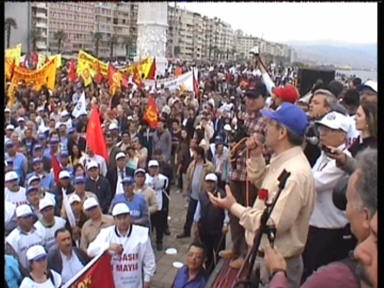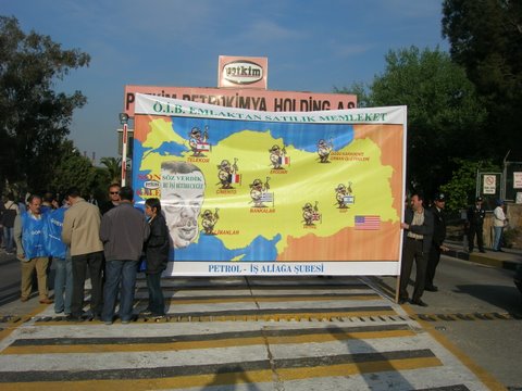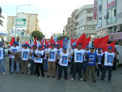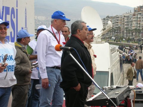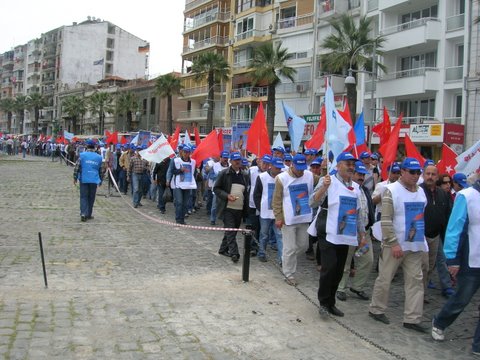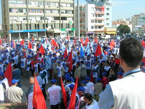 Aliağa’da Coşkulu 1 Mayıs!Aliağa’da 1 Mayıs her yıl olduğu gibi bu yıl da işyerlerinde yapılan kutlamalarla başladı. Tüpraş İzmir Rafinerisi işçileri, iç kapıda toplandı, burada sendikanın 1 Mayıs bildirisi okundu, davul zurna eşliğinde halaylar çekildi. Daha sonra işten çıkan vardiyaya da bildiri okundu, Aliağa ve İzmir’de yapılacak etkinliklere katılım çağrısında bulunuldu.Petkim’de de sabah işe gelen işçiler “A” Kapı girişinde toplandı. İşçilere hitaben Şube Başkanı İbrahim Doğangül bir konuşma yaptı.