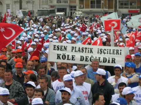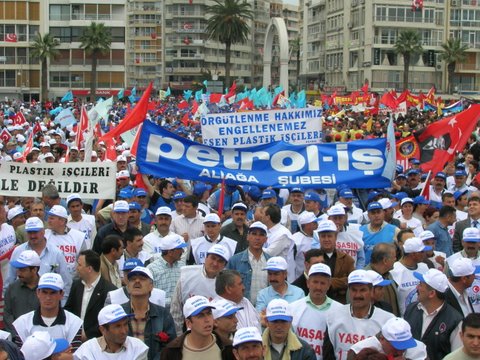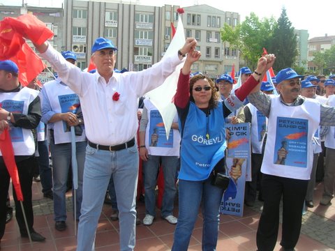 Aliağa’da Coşkulu 1 Mayıs!Aliağa’da 1 Mayıs her yıl olduğu gibi bu yıl da işyerlerinde yapılan kutlamalarla başladı. Tüpraş İzmir Rafinerisi işçileri, iç kapıda toplandı, burada sendikanın 1 Mayıs bildirisi okundu, davul zurna eşliğinde halaylar çekildi. Daha sonra işten çıkan vardiyaya da bildiri okundu, Aliağa ve İzmir’de yapılacak etkinliklere katılım çağrısında bulunuldu.Petkim’de de sabah işe gelen işçiler “A” Kapı girişinde toplandı. İşçilere hitaben Şube Başkanı İbrahim Doğangül bir konuşma yaptı. Davul zurna eşliğinde çekilen halaylar, oynanan zeybekler sonrasında işçiler topluca Aliağa Şube binasının önüne otobüslerle gittiler. Buradan yürüyerek Demokrasi Meydanı’na giden Petrol-İş üyesi işçiler, Aliağa Demokrasi Platformu bileşeni örgütlerin üye ve temsilcileri ile birlikte Meydanda toplandı.Burada yapılan etkinliğin ardından otobüslerle İzmir’e doğru yola çıkıldı.Bir grup (beş otobüs) Petrol-İş üyesi işçi ile birlikte, yeni örgütlenilen ve bu nedenle işten çıkarmaların yaşandığı “Esen Plastik A.Ş.” işyeri önünde basın açıklaması yapıldı. İşveren yetkilileri protesto edildi. Son olarak İzmir Alsancak Limanı önünde bir araya gelen 1500 (bin beş yüz) üyemiz ve yakınları önceden hazırlanan döviz, pankart ve afişler taşıyarak, sendikamızın flamaları ile sloganlar atarak Gündoğdu Meydanı’na girdi.Mitingde Türk-İş adına konuşan Aliağa Şube Başkanı İbrahim Doğangül, yaşadığımız sorunların sebepleri, yapmamız gerekenler ve bundan sonra yapacaklarımız konusuna kısaca değindikten sonra, “Petkim işçisi, Sendikası ve Aliağa halkıyla birlikte direnecek ve Türkiye’nin tek petrokimya üreticisi Petkim’e sahip çıkmaya, üretimin meşalesini yakmaya devam edecek” dedi. En yığınsal ve coşkulu katılımla 1 Mayıs Mitingine damgasını vuran tüm üyelerimizi, bizlere destek olan dostlarımızı kutluyoruz.