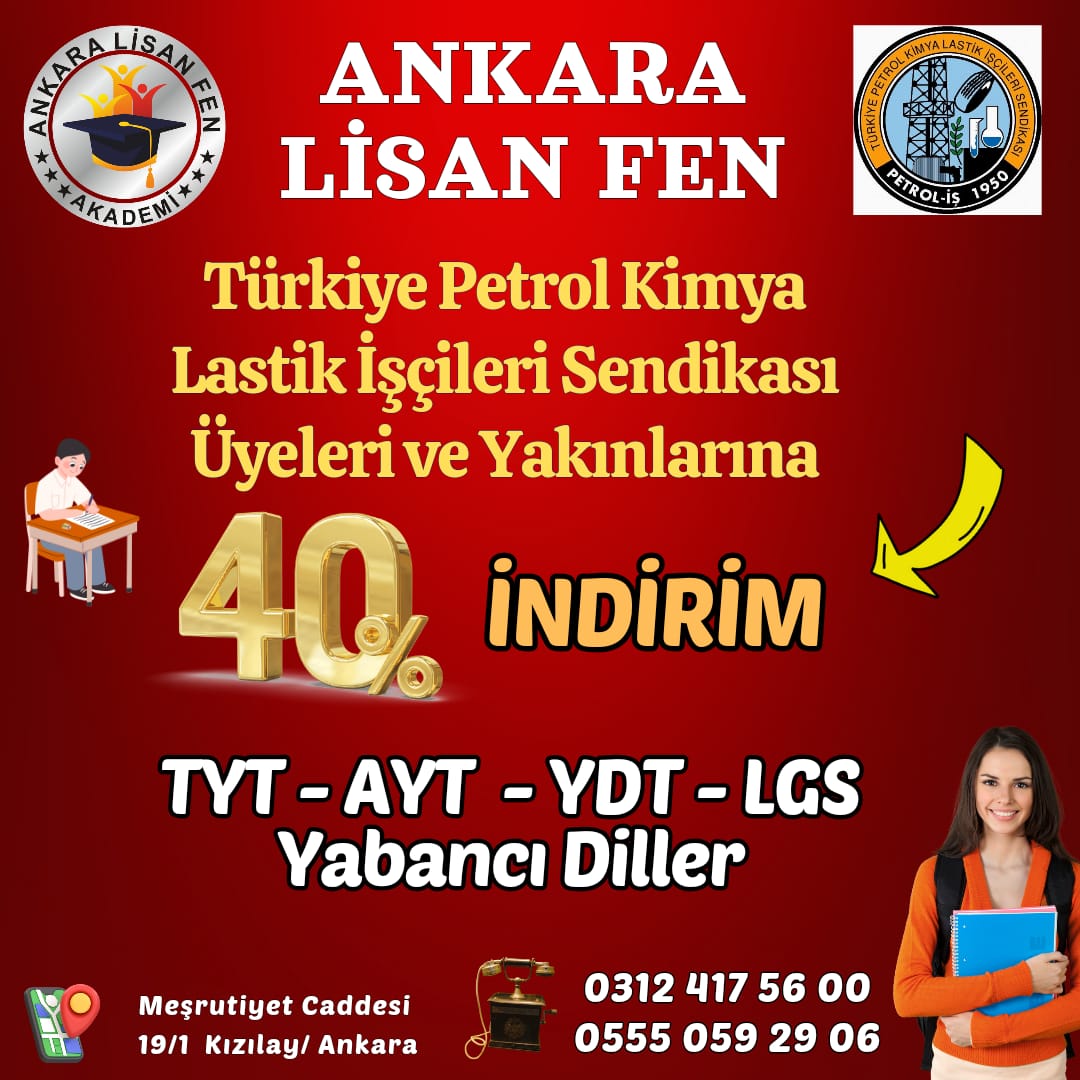 Petrol-İş Sendikası Ankara Şubemiz ile Ankara Lisan Fen Akademi arasında üye ve yakınlarının %40 indirimli eğitim ve öğretim hizmetlerinden faydalanabilmeleri için anlaşma yapılmıştır.