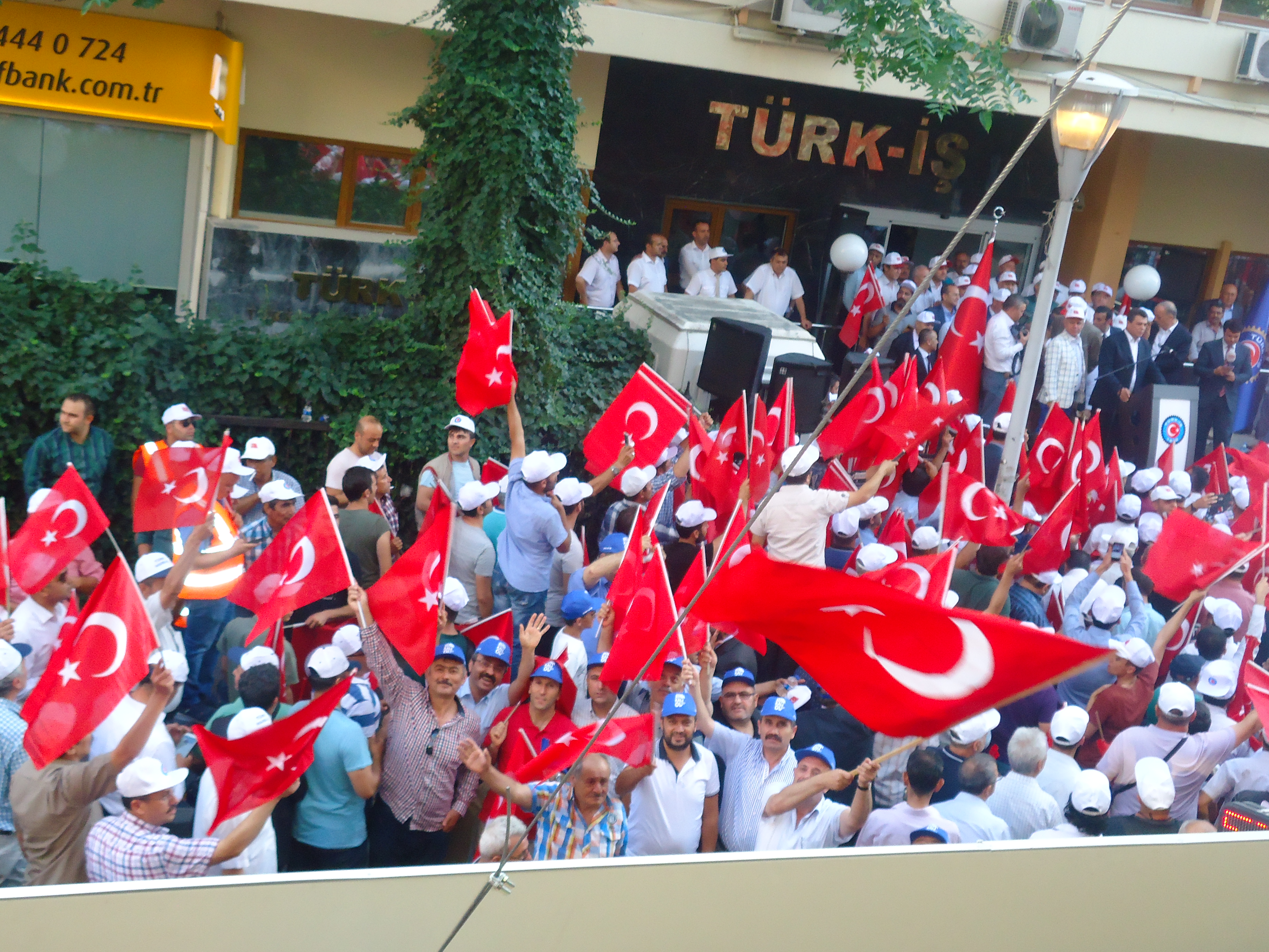 15 Temmuz Cuma gecesi yaşanılan, milletimizin ortak dayanışma iradesiyle akamete uğratılan darbe girişimini protesto etmek, anayasal sistem, milli irade ve demokrasiden yana tavrımızı bir kez daha göstermek amacıyla 19 Temmuz Salı günü saat 19.00’da Petrol-İş Sendikası Ankara Şube Başkanımız Şuayip Gül, Başkan Yardımcılarımız Sabri Polat, Baki Turhan, işyeri temsilcilerimiz ve üyelerimizle birlikte Türk-İş Genel Merkezi önünde toplanıp, sloganlar eşliğinde Güvenpark’a yürüdü.