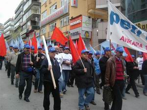 ANKARA’DA 1 MAYIS COŞKUSU01.05.2005 Ankara’da son yılların en kalabalık ve en coşkulu 1 Mayıs’ı kutlandı. Yaklaşık 15 bin emekçi Tandoğan Meydanını doldurdu. Sendikamızın Ankara ve Kırıkkale şubelerinin kitlesel olarak katıldığı 1 Mayıs kutlamaların da özelleştirmeler protesto edildi.