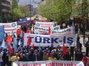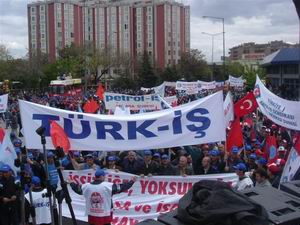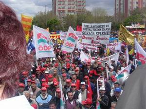 ANKARA’DA 1 MAYIS COŞKUSU01.05.2005 Ankara’da son yılların en kalabalık ve en coşkulu 1 Mayıs’ı kutlandı. Yaklaşık 15 bin emekçi Tandoğan Meydanını doldurdu. Sendikamızın Ankara ve Kırıkkale şubelerinin kitlesel olarak katıldığı 1 Mayıs kutlamaların da özelleştirmeler protesto edildi.