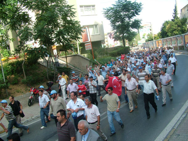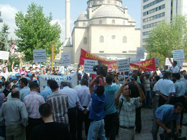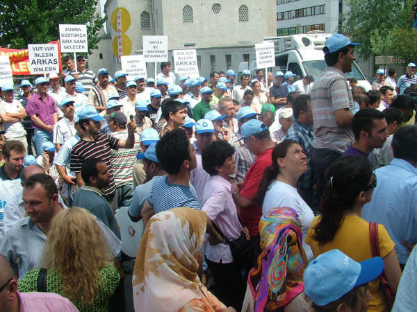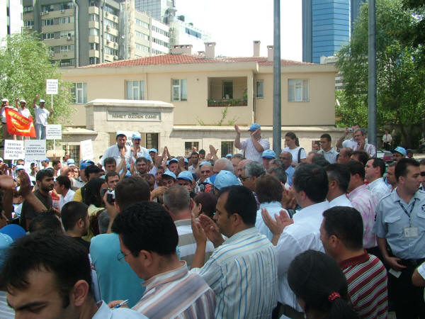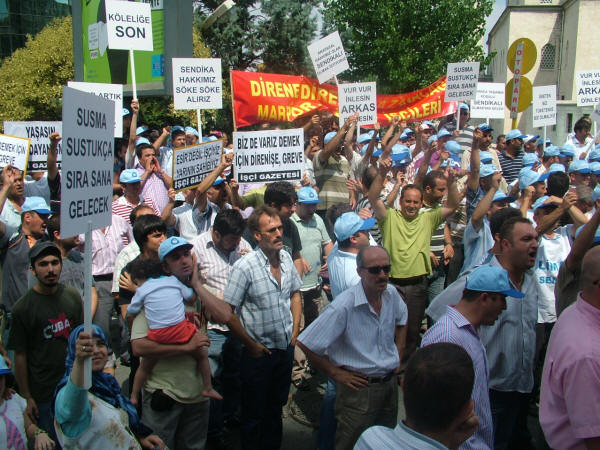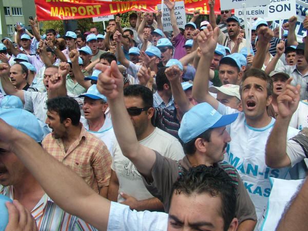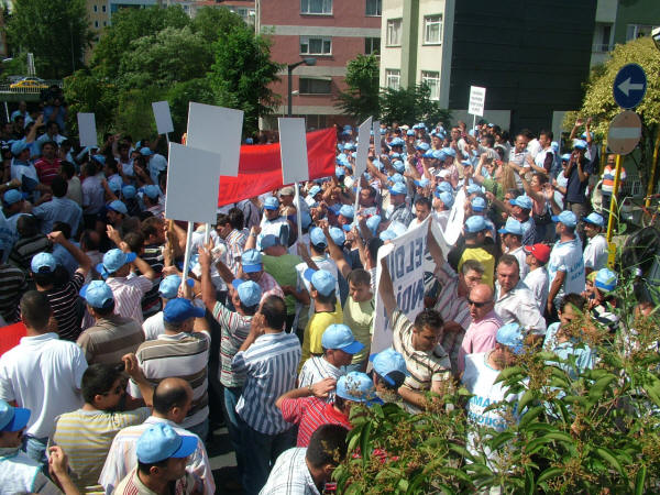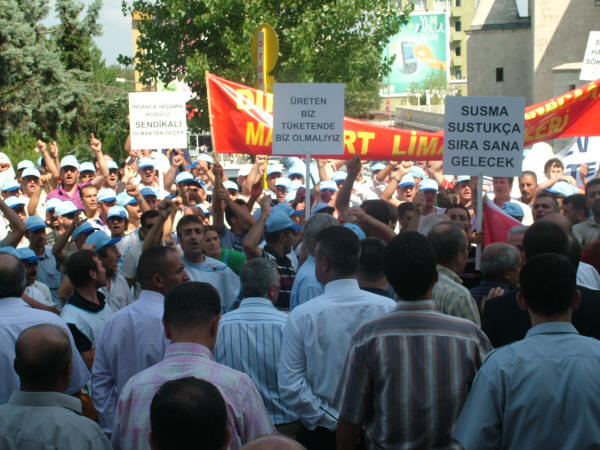 Liman-İş Sendikası’nın holding binası önünde bugün düzenlediği protesto eylemi ve kitlesel basın açıklamasına diğer sendika, siyasi parti ve demokratik kitle örgütlerinin yönetici ve temsilcileri de katıldı. Sendikamız Genel Sekreteri Mustafa Çavdar, Genel Mali Sekreteri İbrahim Doğangül ve Genel Örgütlenme ve Eğitim Sekreteri Nimetullah Sözen de protesto eylemi ve kitlesel basın açıklamasına katılarak liman işçilerinin haklı mücadelesine destek verdiler. Petrol-İş Sendikası olarak, anayasal ve yasal haklarını kullanarak Liman-İş Sendikası’nda örgütlendikleri için tazminatsız olarak işten çıkarılan işçilerle, işyerine alınmayan diğer sendika üyesi liman işçilerinin haklı mücadelesini sonuna kadar destekliyor, Arkas işverenini bu uygulamalarından dolayı kınıyor ve işten çıkarılan işçilerin derhal işe alınmasını talep ediyoruz. Arkas Holdin binası önünde ilk açıklamayı yapan Türk-İş İstanbul 1. Bölge Temsilcisi Faruk Büyükkucak, Türk-İş olarak Liman-İş’te örgütlendikleri için aşından, işinden olan liman işçilerinin yanında olduklarını, liman işçilerini yalnız bırakmayacaklarını söyledi. Büyükkucak, “Eğer Hükümet, Çalışma Bakanlığı tedbir almazsa Tuzla’da yaşananlar bu limanlarda da yaşanır. Arkas işvereni korsanvari bir şekilde, belinde silah, taşeron işçilerini burada çalıştıracağını sanıyorsa yanılıyor. Arkas işvereni demokrasiyi hazmedemedi. Buradan suç duyurusunda bulunuyorum. Türkiye bir hukuk devletidir” dedi. Liman-İş Genel Başkanı Muzaffer Akpunar da yaptığı açıklamada şunları söyledi: “Sendikamız Liman-İş 20 Haziran 2008 tarihi itibariyle İstanbul Büyükçekmece Ambarlı’da bulunan Arkas Holding’in bir kuruluşu olan Arser’de örgütlenmeye başladı. İşyerinin çalışma koşulları ağır olup İş Sağlığı ve Güvenliği Yönetmeliğine ve İş Yasası’na aykırıdır, işyerinde iş kazaları sıkça olmaktadır. Yaşadıkları ölümcül iş ortamı, sosyal kimliklerine son veren çalışma saatleri gibi birçok olumsuz koşul Arkas işçilerinin sendikalaşma sürecini kaçınılmaz kılmış ve büyük bir irade birliği ile 406 işçi Liman-İş’te örgütlenmiştir. Anayasal ve yasal teminat altında olan sendikal örgütlülüğe karşı duran işveren ise sendikalaşma hareketini öğrendikten sonra işçi üyelerimize yasalara aykırı biçimde baskılar uygulamaya başladı. Üyelerimize sendikadan istifa etmemeleri durumunda iş akitlerinin feshedileceğine dair bir çok tehdit savurdu. Bununla yetinmeyip 24 Haziran’da 5 öncü üyemizin iş aktini yasalara aykırı olarak feshetti. Yaşanan olumsuzluklar üzerine sendikamız 26 Haziran’da Çalışma ve Sosyal Güvenlik Bakanlığına şikayet dilekçesi verdi.” İşverenin tüm olumsuz çabalarına karşın Liman-İş’in Arser işyerinde 406 işçi ile sağlanan yasal çoğunlukla 11 Temmuz 2008 tarihinde Bakanlığa yetki tesbiti talebinde bulunduğunu belirten Akpunar, işverenin işçileri yıldırma çabasından vazgeçmediğini, saldırıların artarak devam ettiğini ve 15 Temmuz’da da sendika üyesi 52 işçinin tazminatsız olarak iş akitlerinin feshedildiğini, işverenin bunu işçileri cep telefonlarından arayarak çirkin bir şekilde yaptığını söyledi. Akpunar şöyle devam etti: “Sebepsiz olarak işten çıkarılan, bunu kabul etmeyen işçiler ve diğer sendikalı işçiler ise işyerine gittiklerinde ana kapıdan içeri elektronik kart şifreleri değiştirildiği için giremediler. İşçileri ucuz oyunlarla korkutmaya çalışan işveren yine durmadı, noter getirmek suretiyle iş akitleri devam eden işçilerin iş bıraktıklarını iddia etti ve yalanlarını tutanak altına aldırdı. Ancak sendikamız İstanbul Bölge Çalışma Müdürlüğü’ne başvurarak işverenin bu hile yolunu kestirdi.” Arkas işvereninin limanlarda her türlü güvencesiz, parayı insan faktörüne değişen ve kanunsuz çalışma koşullarını devam ettirdiğini belirten Akpunar, işverenin dışarıdan vinç operatörü olarak getirdiği ehliyetsiz işçilerin ya da yaşı itibariyle refleksleri yetersiz işçilerin yapacağı işin sonucunun ölümle sonuçlanabilecek iş kazalarına varmasından endişe duyduklarını ve böyle bir iş kazası olursa bunun iş cinayeti olacağını bildirdi. Akpunar sözlerini şöyle sürdürdü: “Arkas Holding’e bağlı Marport limanı Türk-Lim (Türkiye Liman İşletmeleri Derneği) üyesidir. Türk-Lim işverenlerin örgütlülüğünü savunan, patronların sermayelerini artırabilmek, siyasi iktidarlara baskı oluşturabilmek ve limancılık sektörünü geliştirmek için var olan bir dernektir. Milyar dolarlık cirolar elde eden liman işletmecileri kendi işletmelerinin gelişmesi için örgütlü olmanın gücünden faydalanmaktadır. Ancak bünyesinde çalıştırdıkları şirketlerin her geçen gün bir önceki günden daha büyük olmasını sağlayan işçilerin daha insani koşullarda, ölüm korkusu olmadan yaşamak için kullanmak istedikleri yasal ve anayasal hakları, sendikal örgütlülüğe karşı durmaktadırlar. Bununla da yetinmeyip toplu halde işlerine son vermektedir. Arkas yüzlerce avukatından sadece birine sorarsa sendikalı olmanın işçinin anayasal hakkı olduğunu öğrenecektir. Haksız bir şekilde işlerine son verilen işçi üyelerimizin derhal işe alınmalarını talep ediyoruz. Arser işvereni suç işlemektedir! Sendikalaşma hakkımız engellenemez! Mücadelemiz sonuna kadar devam edecek. Yaşasın işçilerin birliği.” Arkas işverenini protesto eylemi ve kitlesel basın açıklaması sırasında işçiler, Bizleri soydunuz, sendikadan korktunuz, Yeter artık insanca yaşamak istiyoruz, Anayasal hakkımız olan sendikalı olmak istiyoruz, Limanda taşeron istemiyoruz, Sendika hakkımız söke söke alırız, Lim