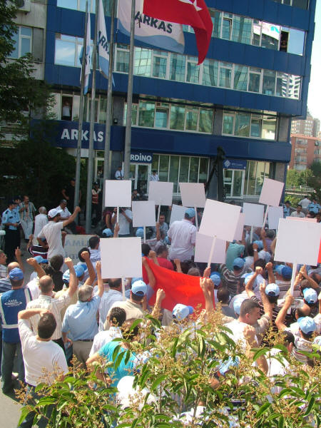 Liman-İş üyesi işçilerin haklı mücadelesini destekliyoruz! İstanbul – Büyükçekmece-Ambarlı’da bulunan, Arkas Holding A. Ş. kuruluşu Arser İş Makinaları Servis ve Ticaret A.Ş. işyerine bağlı Kumport ve Marport limanlarında çalışan işçiler, Liman-İş Sendikası’nda örgütlendikleri için tazminatsız olarak işten çıkarılmaları, sendika üyesi diğer işçilerin de işyerine alınmamaları nedeniyle Arkas Holding A.Ş.’nin Mecidiyeköy-Esentepe’deki holding binası önünde işvereni protesto ettiler.