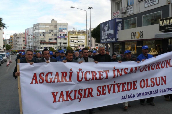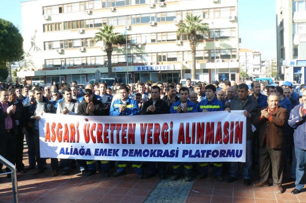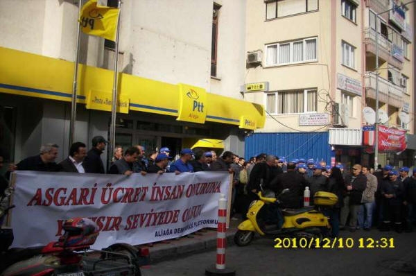 Asgari ücretin yükseltilmesi için toplanan imzalar Çalışma Bakanlığına gönderildi Aliağa şubemizin de aralarında yer aldığı Aliağa Emek ve Demokrasi Platformu Bileşenleri, asgari ücretin açlık sınırının üzerine ve en düşük devlet memuru seviyesine çıkarılması doğrultusunda Aliağa Demokrasi Meydanı’nda 6 Aralık 2010 Pazartesi gününden 9 Aralık 2010 Perşembe gününe kadar saat 17.00’de bir araya gelerek basın açıklaması yaptı ve taleplerini dile getirdi.