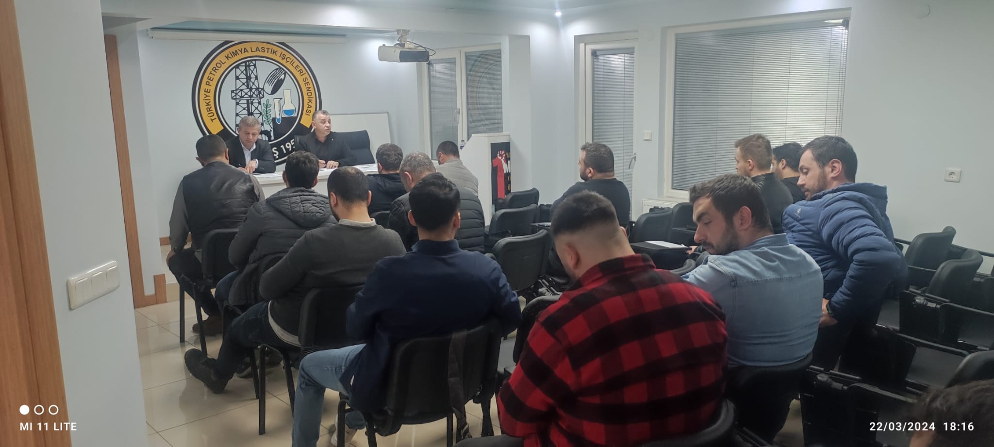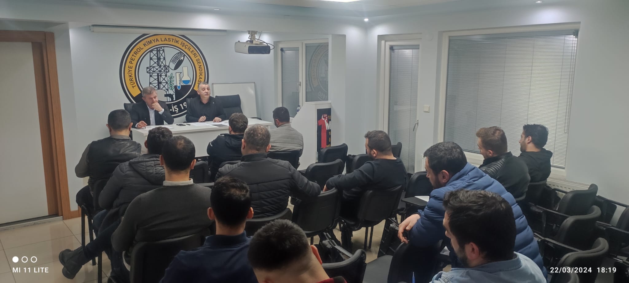 Bandırma Petrol-İş Sendikası Şube Temsilciler Kurulu Toplantısı 22 Mart 2024 Cuma günü Bandırma Şubemizde yapıldı. Toplantıya Şube Başkanımız Tuncay Topuz, Şube Başkan Yardımcımız Ahmet Kınay, Şube Yönetim Kurulumuz, Denetim ve Disiplin Kurullarımız, Eti Maden ve Sülfürikasit Fabrikaları işyerleri Baştemsilci ve Temsilcilerimiz, Hidrojen Peroksit Baştemsilcimiz ve Bagfaş Gübre Fabrikaları Baştemsilci ve Temsilcimiz’in katılımı ile Şube Temsilciler Kurulu Toplantımızı gerçekleştirdik. Şube Başkanımız Tuncay Topuz’un temsilciler kurulumuzu açılış konuşmasının ardından Hidrojen Peroksit İşyeri yeni imzalanan toplu iş sözleşmesinin bilgilendirmesi, örgütlü olduğumuz diğer işyerlerinde yaşanan gelişmeleri değerlendirdikleri konuşmalar gerçekleştirildi. Daha sonra Şube Başkan Yardımcımız Ahmet Kınay, Ülke gündemi ve çalışma hayatı ile ilgili açıklamalar yapmasının ardından şube temsilciler kurulu toplantısı sona erdi.