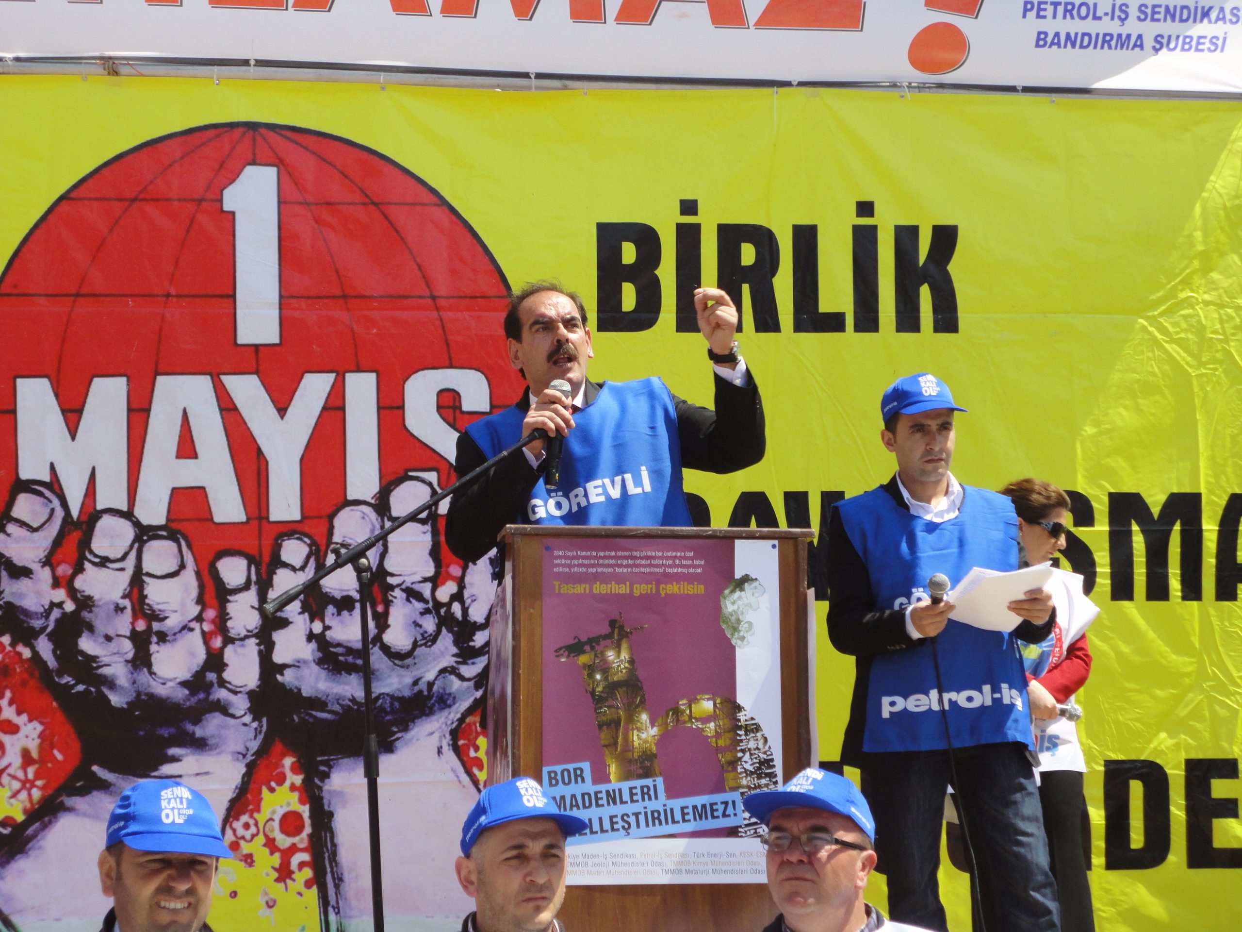 Gültekin Mutlu’nun ardından konuşan Bandırma Petrol-İş Şube Başkanı İsmail Kayan oldu. İsmail Kayan siyasi iktidara çağrıda bulunarak, borların özelleştirilmesine ilişkin yasa tasarısının geri çekilmesini istedi. Kayan, ülkemizdeki konfederasyonları bu konuda birlikte hareket etmeye ve 20 gün içinde alınacak bir kararla toplu grev yapmaya çağırdı. Konuşmaların ardından her yıl olduğu gibi İşçi Bayramı çekilen halaylar eşliğinde sonlandırıldı. 1 Mayıs kutlamaları verilen müzik konseriyle sona erdi.