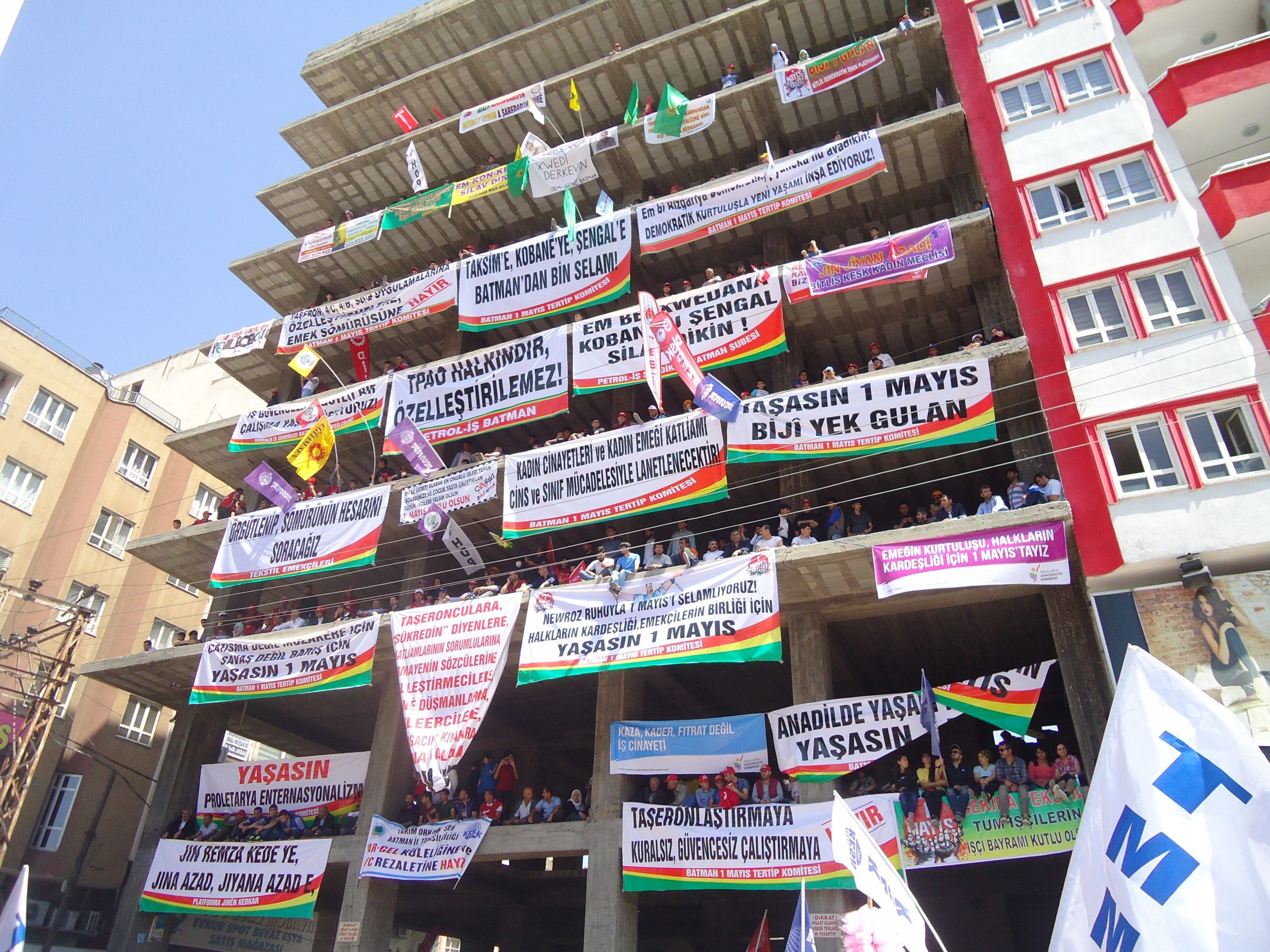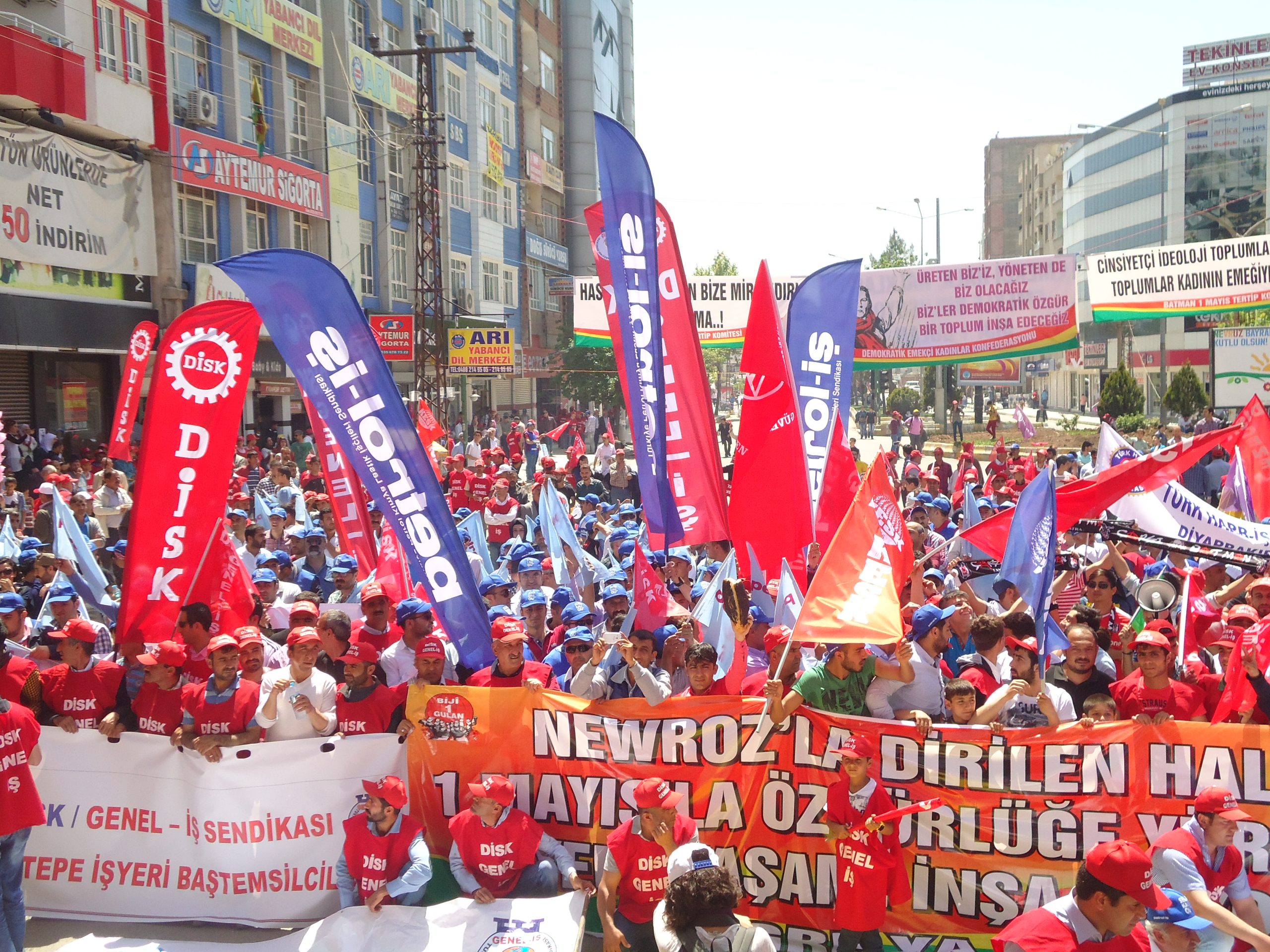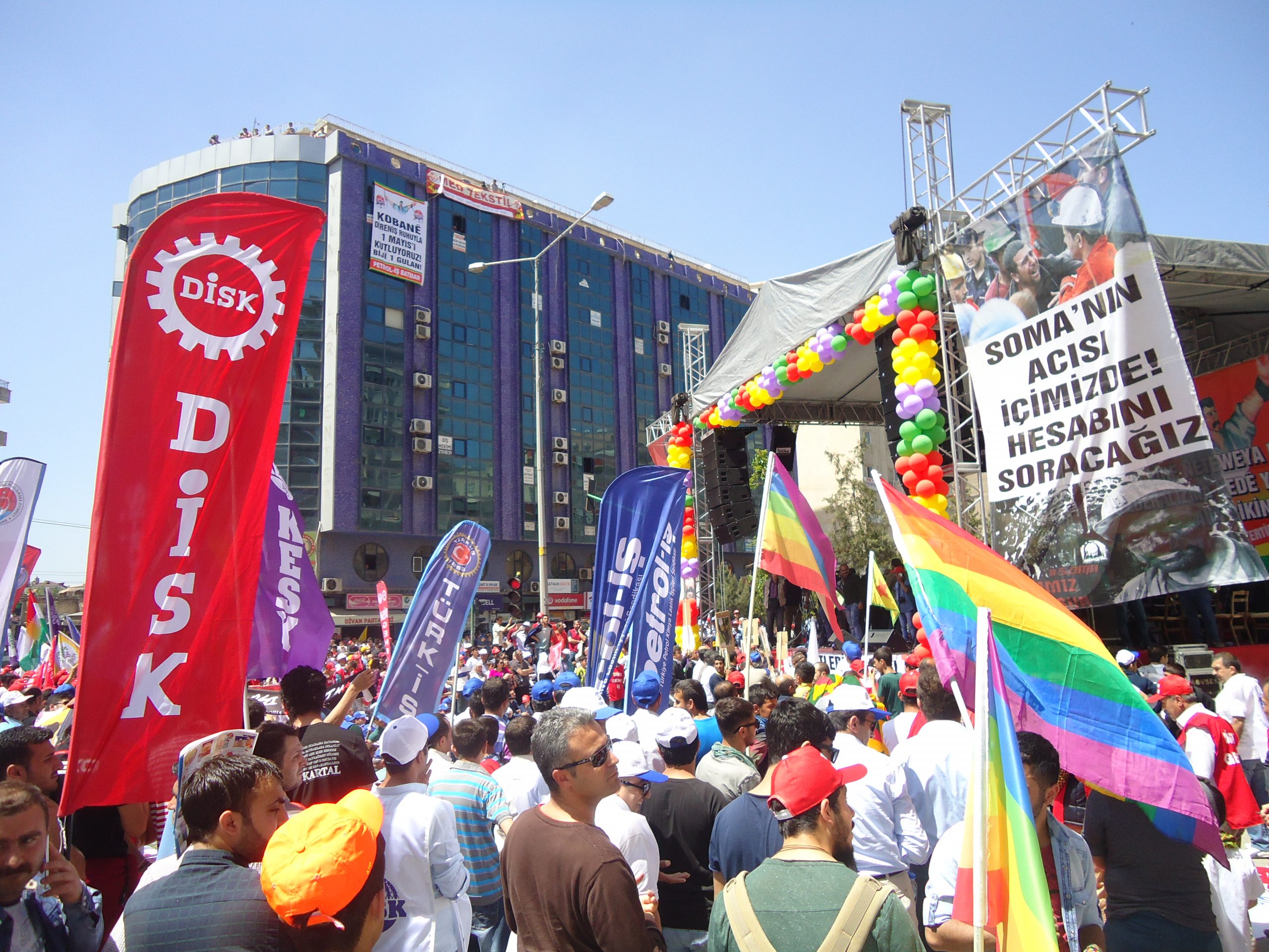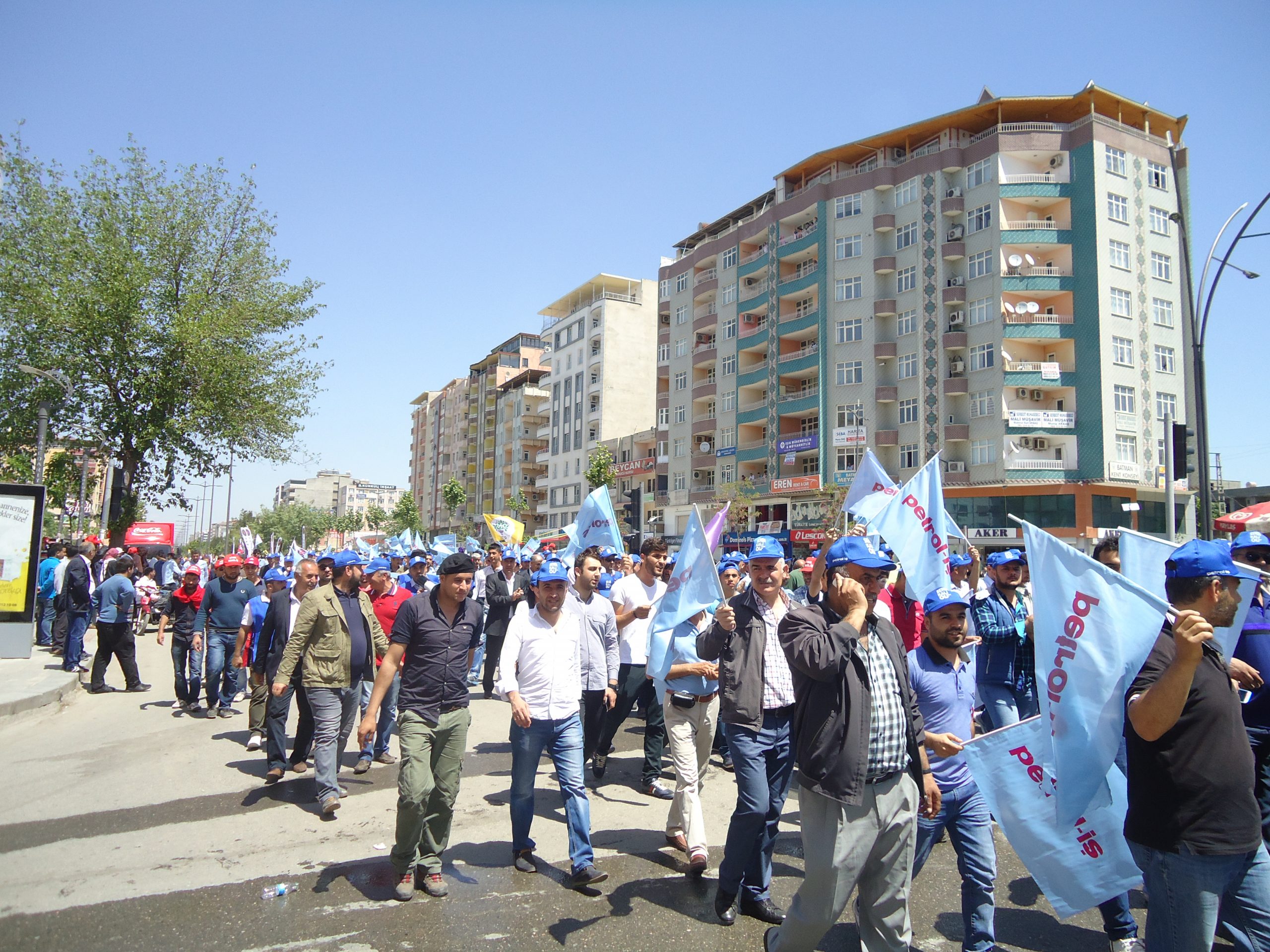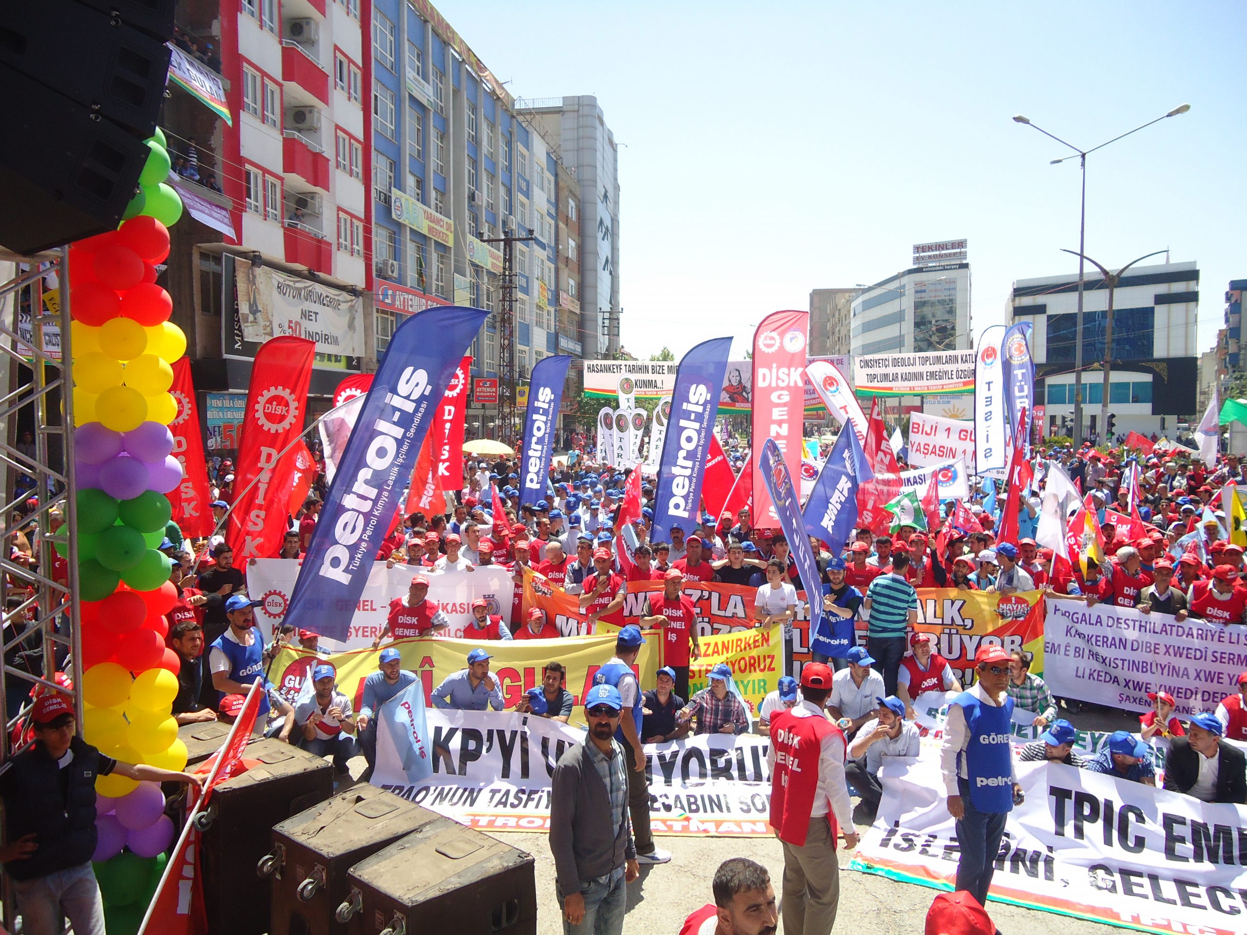 Batman’da Petrol-İş Sendikası, KESK, DİSK, TMMOB şubeleri ile Tabip Odası öncülüğünde kutlanan bölgesel 1 Mayıs mitingine, Diyarbakır, Muş, Mardin, Ağrı, Siirt, Bitlis, Van, Şanlıurfa ve Şırnak’tan gelen işçiler yoğun katılım gösterdi.