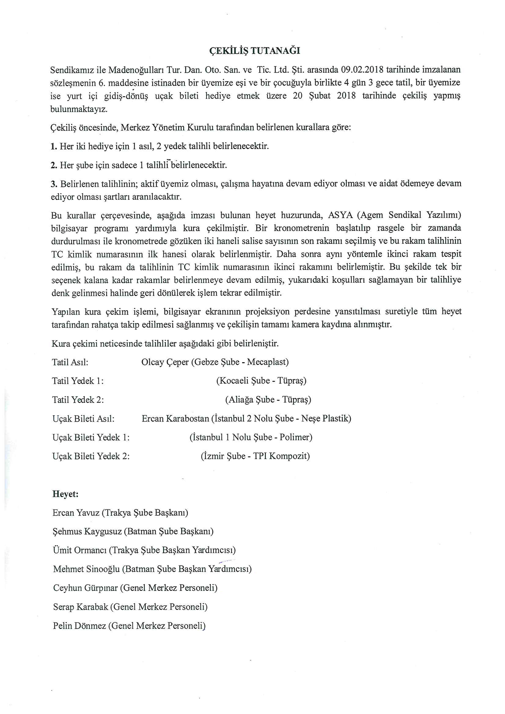 Yapılan çekiliş neticesinde; tatil hediyesini Gebze Şubemize bağlı Mecaplast işyerinde çalışan üyemiz Olcay Çeper, uçak bileti hediyesini ise İstanbul 2 Nolu şubemize bağlı Neşe Plastik işyerinde çalışan üyemiz Ercan Karabostan kazanmıştır.