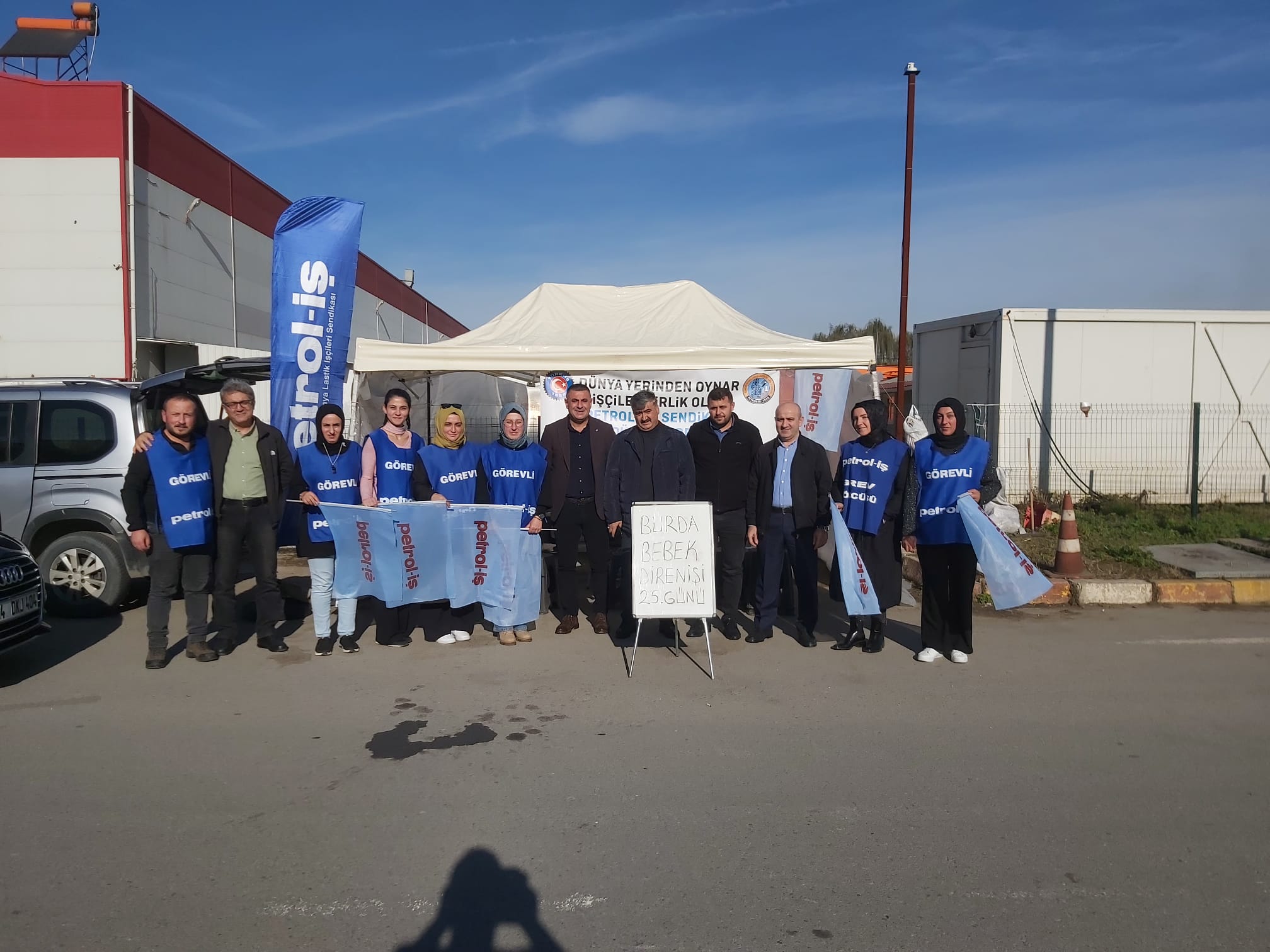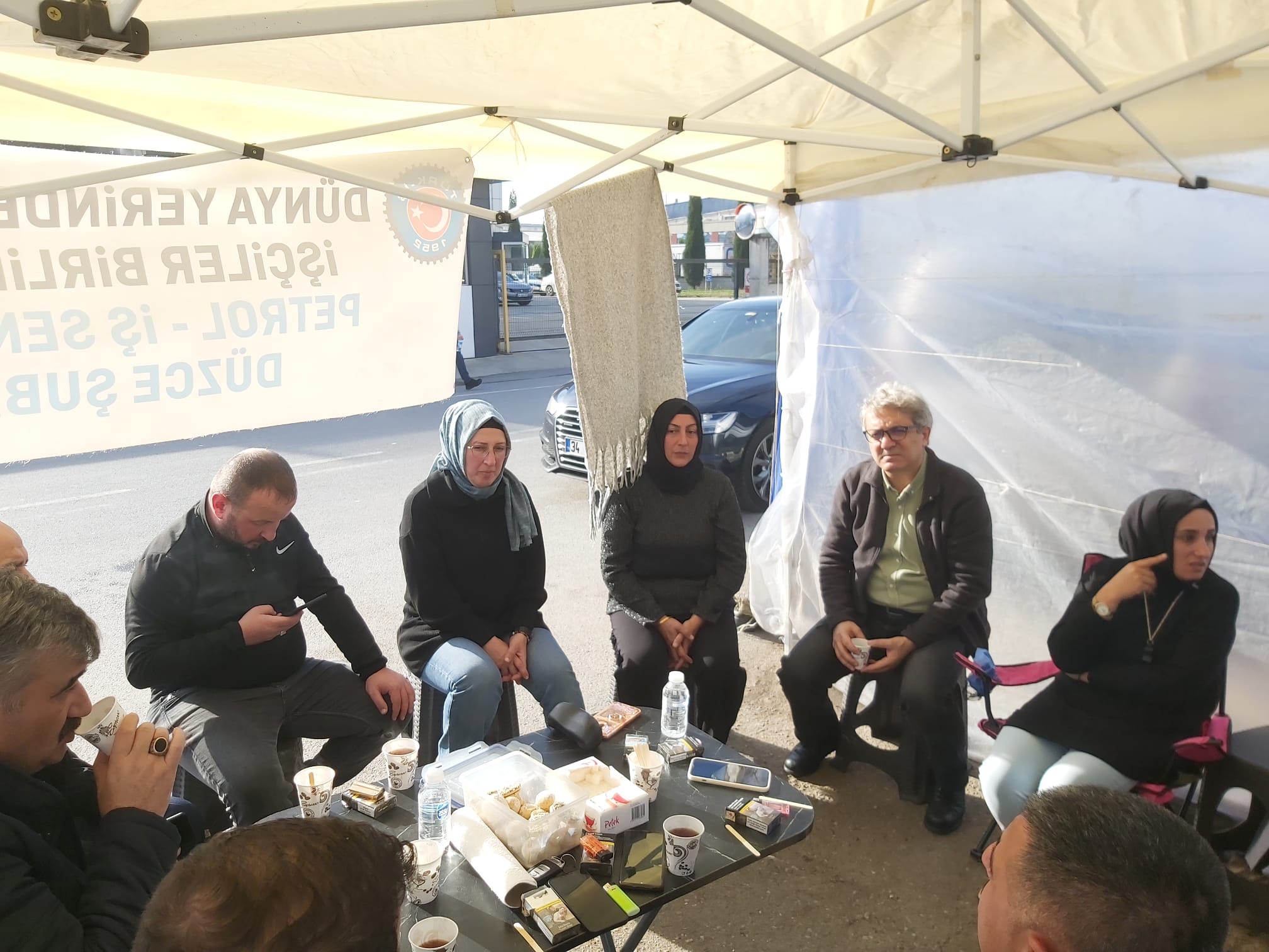 Sendikamız Düzce Şubesi öncülüğünde sürdürülen Burda Bebek Direnişi bugün 25. gününde kararlılıkla devam ediyor. 14 Aralık Perşembe günü sendikamız Genel Sekreteri Ahmet Baranlı ile Genel Örgütlenme ve Eğitim Sekreteri Niyazi Recepkethüda direniş alanında üyelerimizle biraraya geldi. Direniş alanında kararlılık vurgusu öne çıkarken, işverenin bir an önce kanunlara uygun davranması ve toplu sözleşme masasına oturma çağrısı yinelendi. İstanbul 1 Nolu Şube Yönetim Kurulu Üyesi Aziz Aydın ile sendikamız Eğitim Servisi Uzmanı Erhan Kaplan da ziyarette yer aldı.