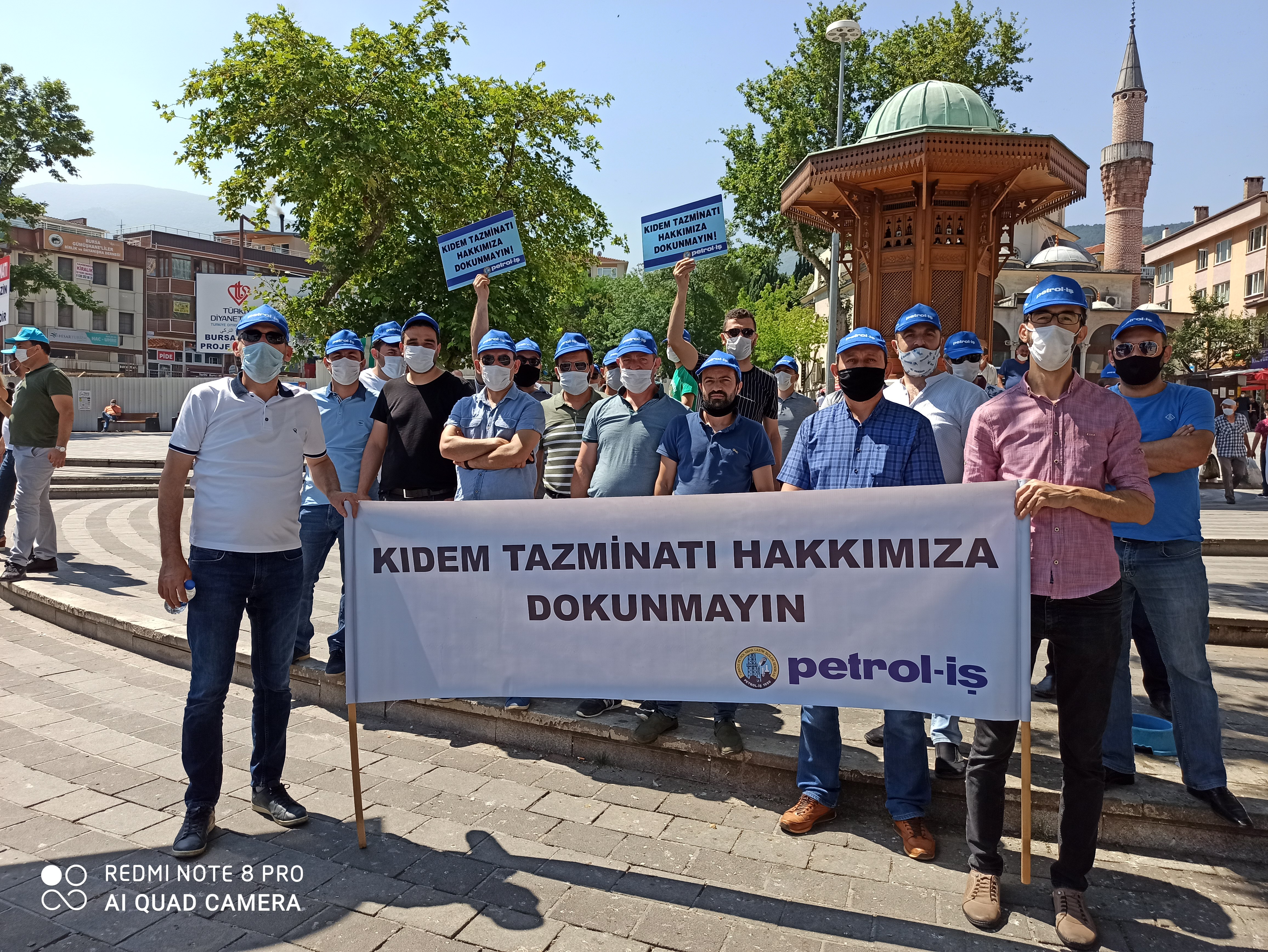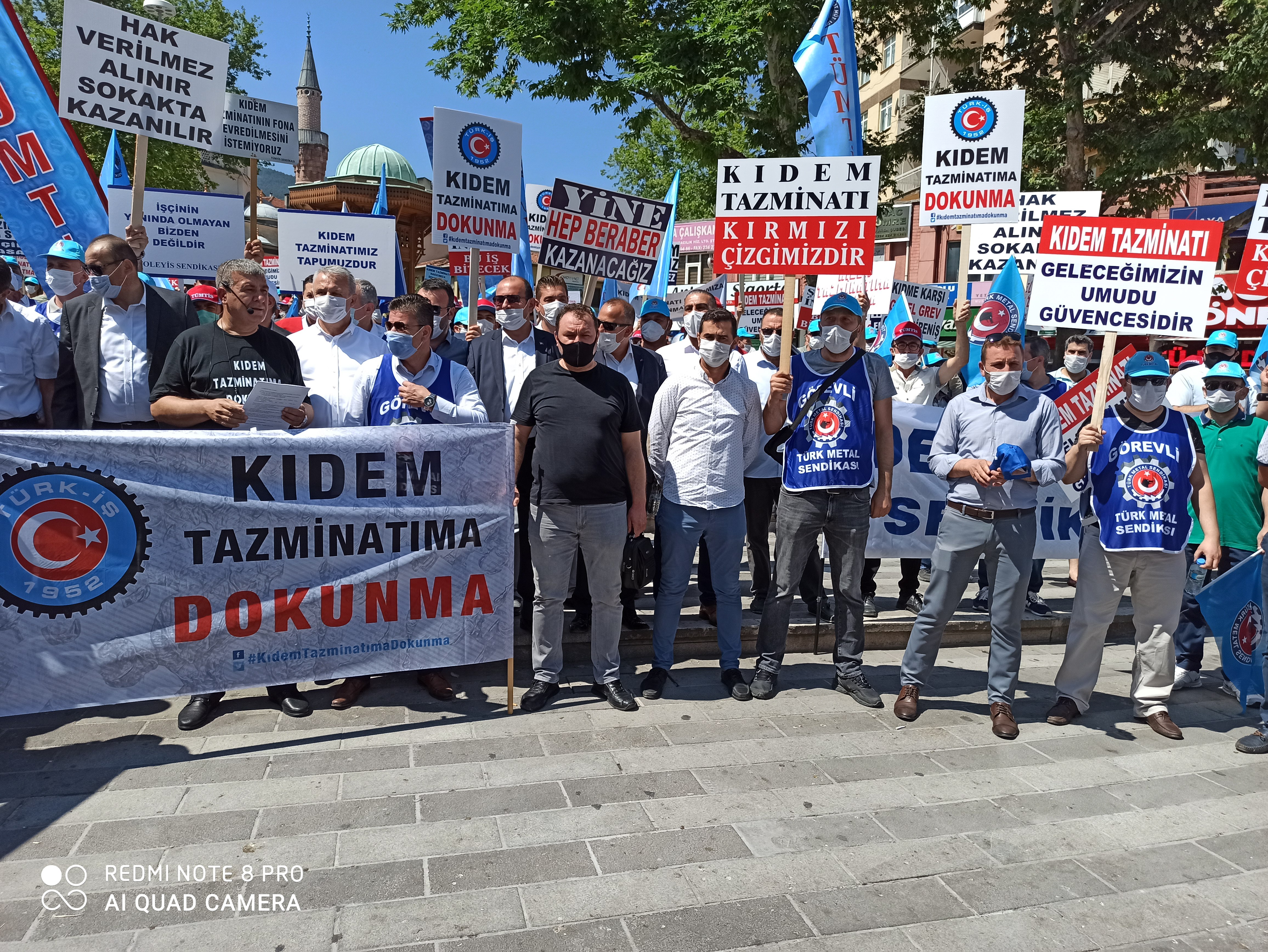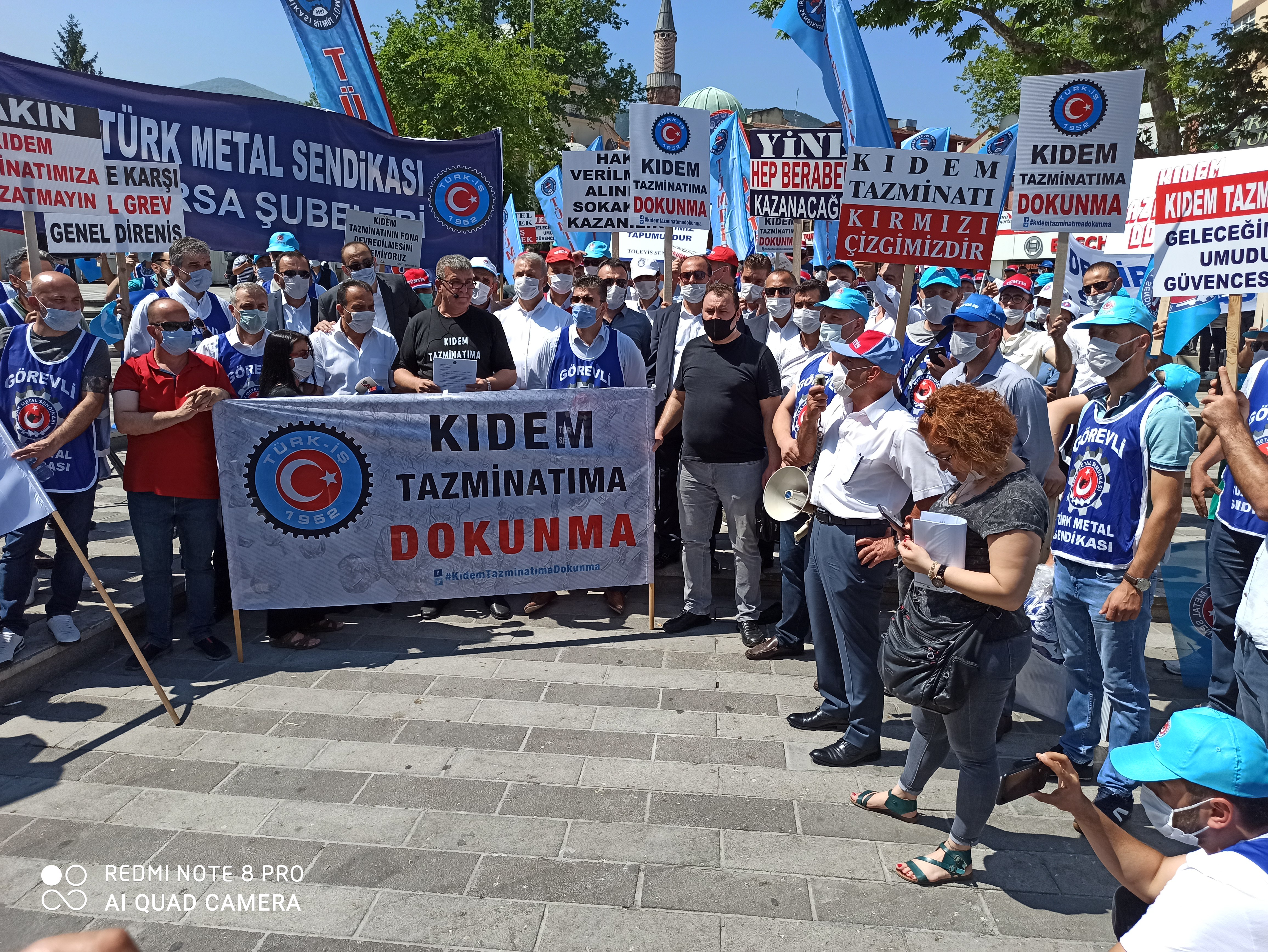 Bursa Şubemiz de, bugün saat 11.00’de, Bursa-Fomara Meydanı’nda yapılan kitlesel basın açıklamasına katıldı. Şube Başkanımız Ersin Birgül, Başkan Yard. Hüseyin Gürkaş ve Kamil Bayrak (Mali), yönetim, denetim, disiplin kurulu ve işyeri temsilcilerimizin katılımı ile destek verdiğimiz eylemde kıdem tazminatı hakkını geriye götürecek her müdahalenin genel grev nedeni olduğu vurgulandı. Ayrıca, bu kararın Türk-İş’in 21’inci, 22’inci ve 23’üçüncü Genel Kurulunda oy birliğiyle alınmış olduğuna dikkat çekildi.