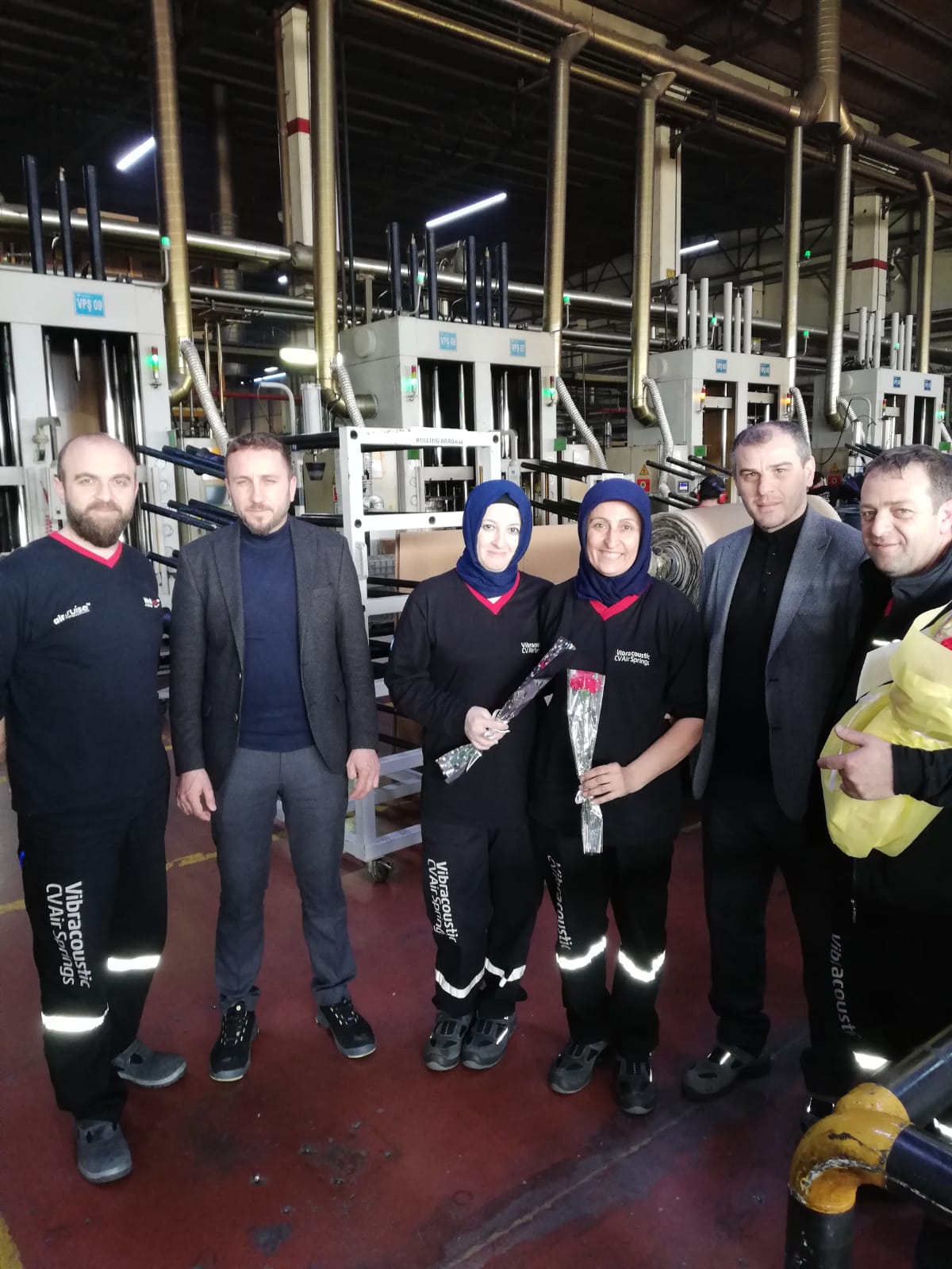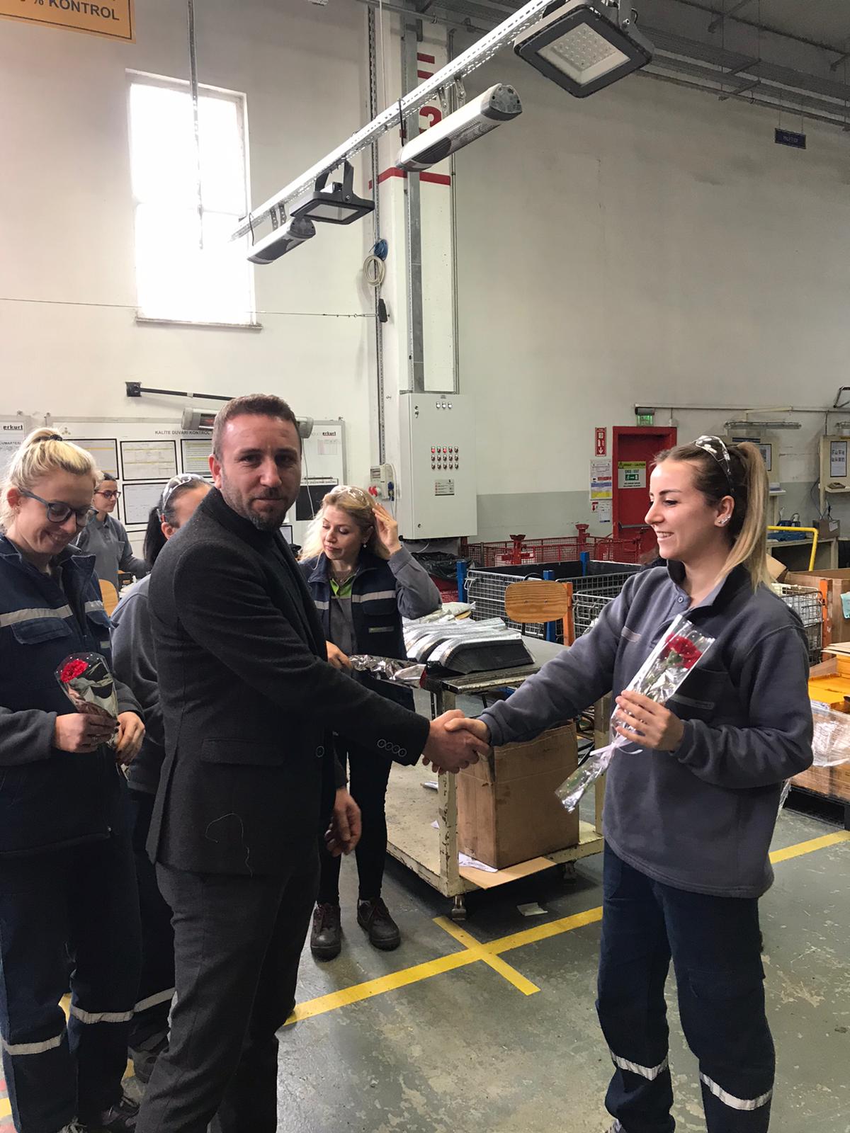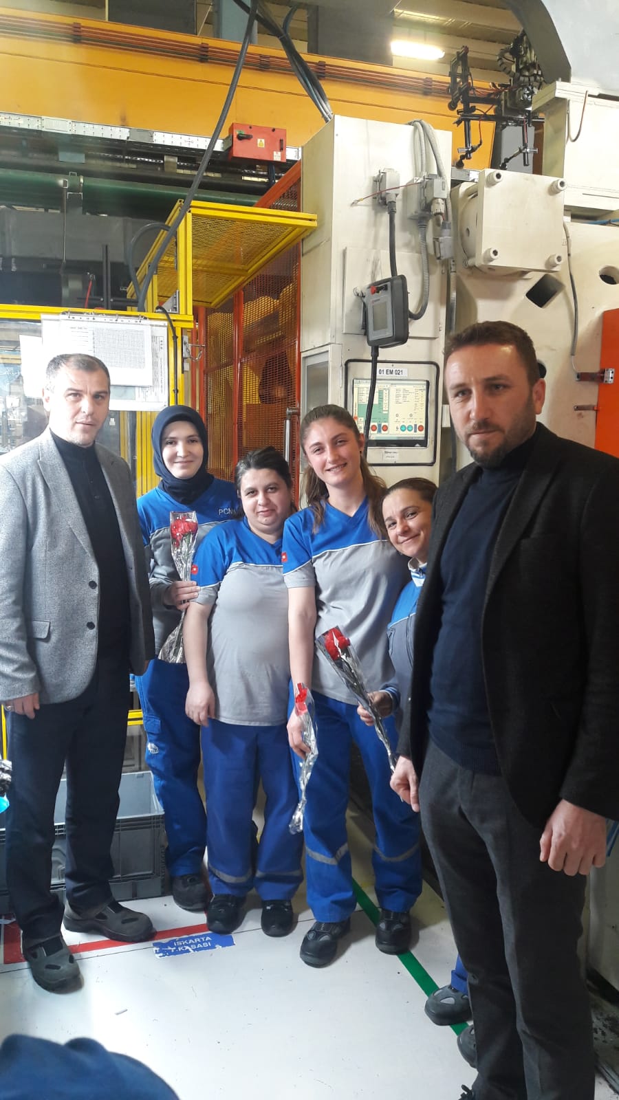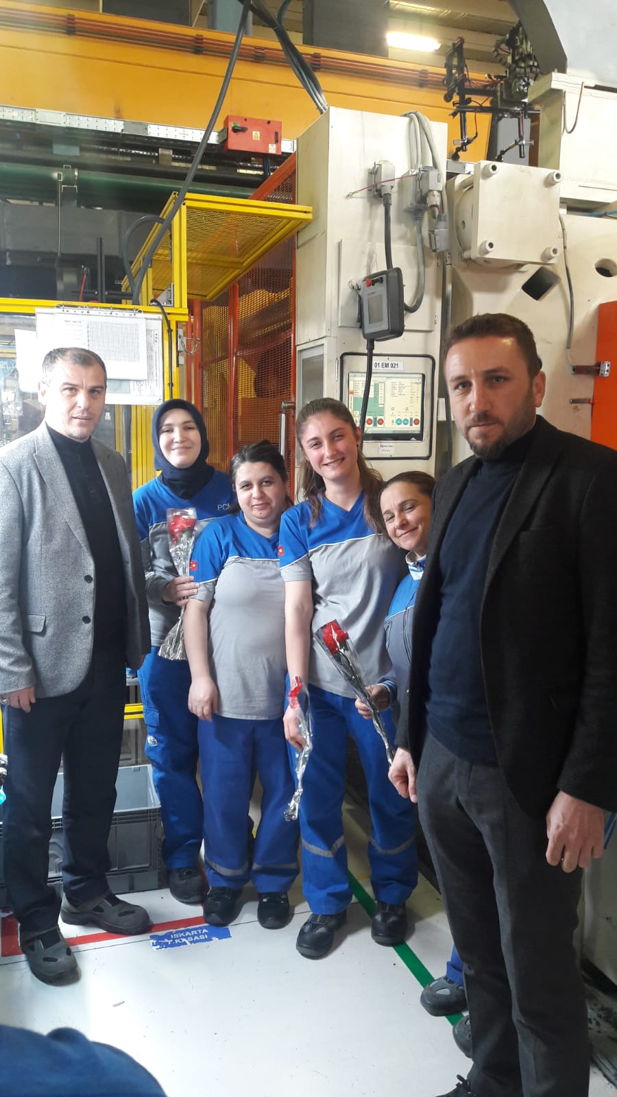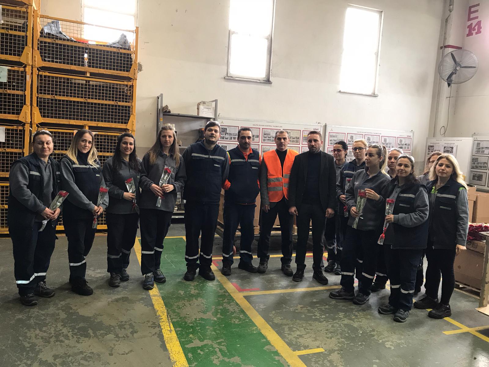 Bursa Şubemiz kapsamında örgütlü olduğumuz işyerlerinde 8 Mart kutlandı. Şube Başkanımız Ersin Birgül, Başkan Yardımcılarımız Hüseyin Gürkaş ve Kamil Bayrak(mali) ile işyeri temsilcilerimiz 8 Mart Pazar günü örgütlü olduğumuz Faurecia, Vibracoustic, Botaş, Autoneum, Aktaş, Contitech, Plastiform ve Solar Patlayıcı işyerlerimizi ziyaret ederek kadın üyelerimizin 8 Mart Dünya Emekçi Kadınlar gününü üyelerimize karanfil vererek, günün anlam ve önemini anlatarak kutladı.
