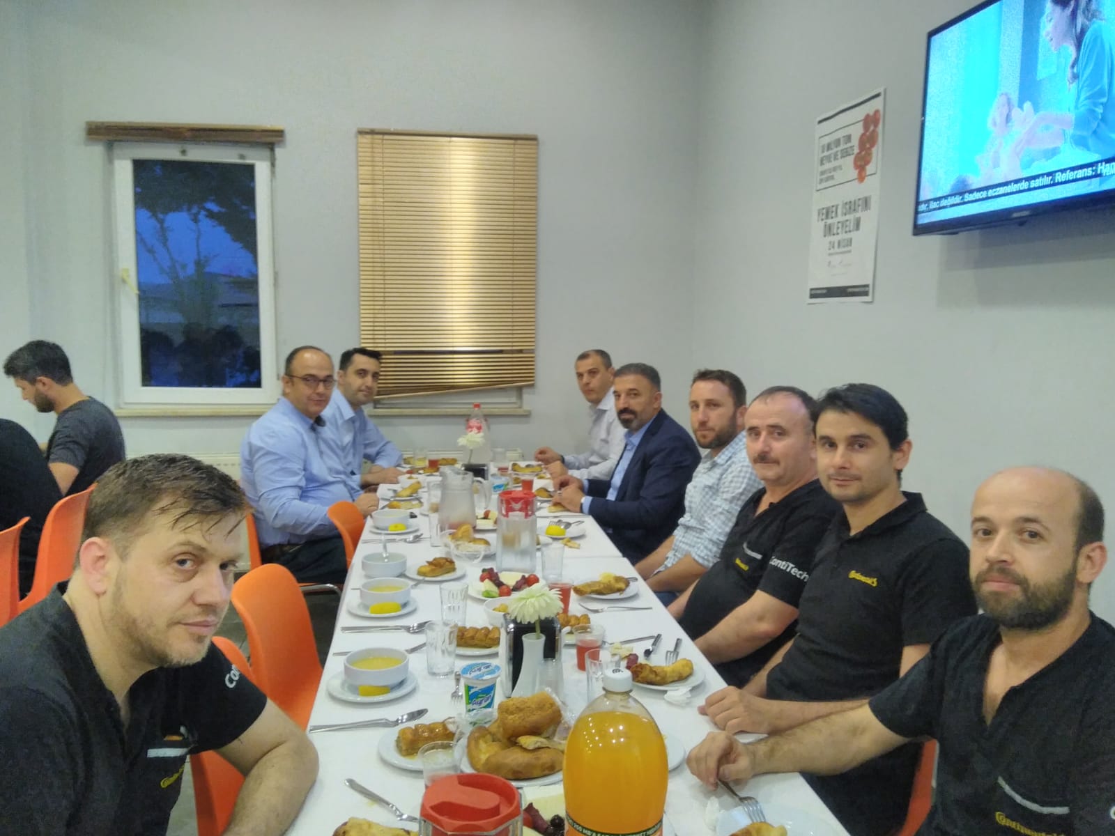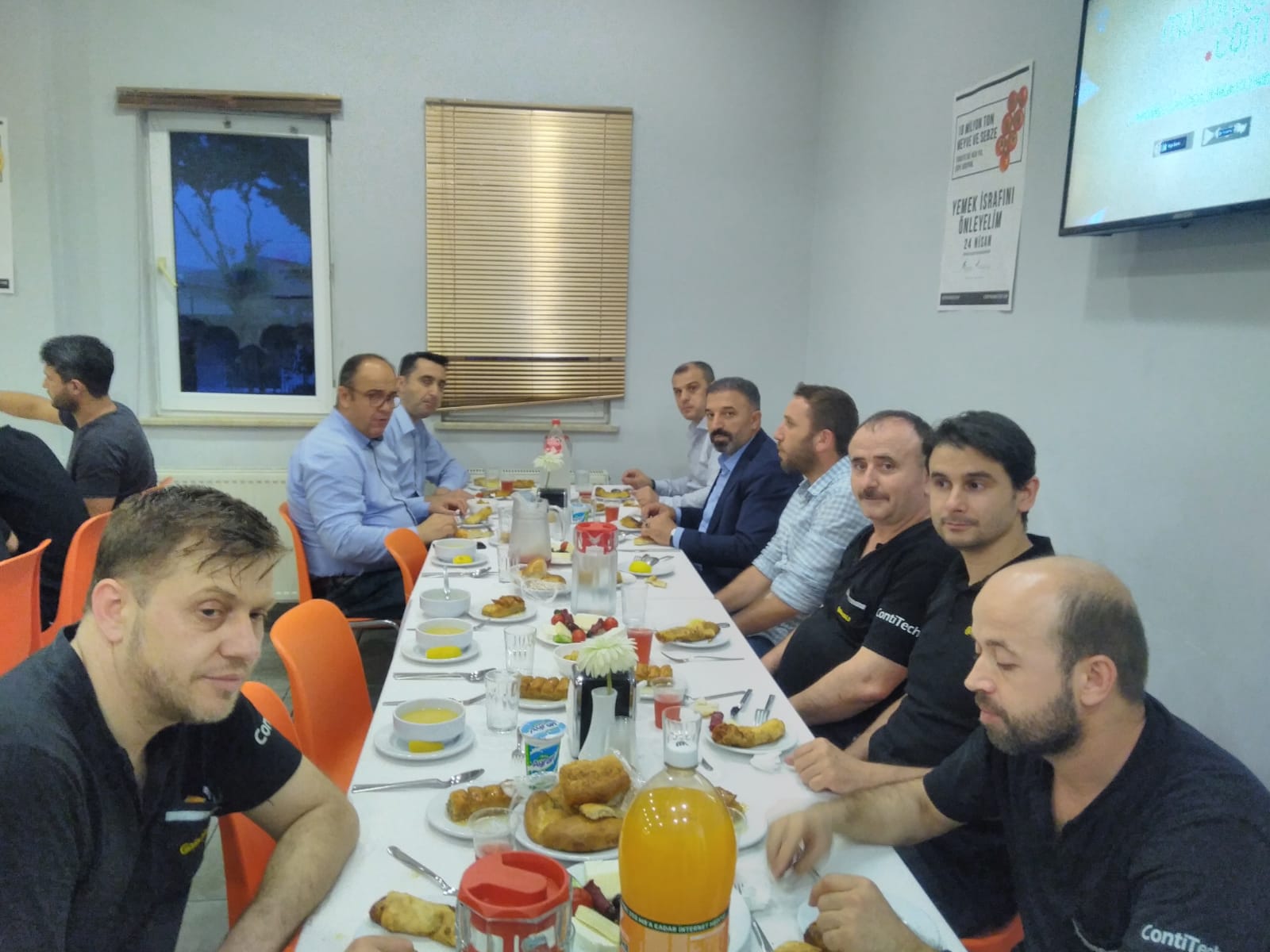 Bursa Şube Başkanımız Erhan Yakışan, Başkan Yrd. Hüseyin Gürkaş ve Başkan Yrd. Mali Ersin Birgül örgütlü olduğumuz işyerlerinden Contitech Lastik Sanayi A.Ş. de 22 Mayıs Çarşamba günü üyelerimiz ile bir araya gelerek birlikte iftar yaptılar. Şube Başkanımız Erhan Yakışan ve şube yöneticilerimizi işyerinde temsilcimiz Nurcan Işık karşıladı. İftar yemeğinde Başkan Erhan Yakışan ve başkan yardımcılarımıza Contitech Lastik San. A.Ş. Genel Müdürü Şirzat Karayel, Üretim Müdürü Burak Parlar ve İnsan Kaynakları Müdürü Cengiz Gündoğdu’da katılarak eşlik etti. Temsilcimiz Nurcan Işık bu iftar ziyaretinden dolayı Başkan Erhan Yakışan ve başkan yardımcılararımıza üyelerimiz adına teşekkür etti.