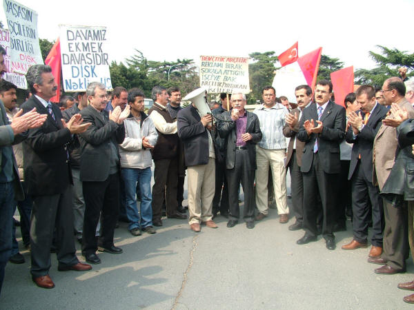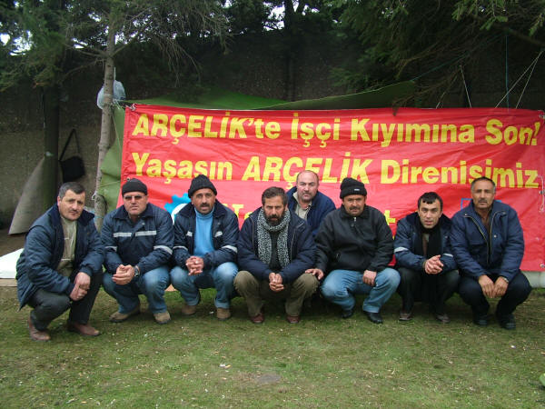 DİSK’e bağlı Nakliyat-İş Sendikası’nda örgütlendikleri için işten çıkarılan Arçelik-Yıldıran işçilerinin direnişi sürüyor. İstanbul-Nakkaştepe’deki Koç Holding binası önünde çadır kuran Arçelik / Yıldıran işçilerine 4 Nisan’da Alman Sendikalar Birliği (DGB) Genel Başkanı Michael Sommer destek ziyaretinde bulundu. ÖDP Genel Başkanı ve İstanbul Milletvekili Ufuk Uras, DİSK Genel Başkan Yardımcısı İsmail Yurtseven, Deri-İş Genel Başkanı Musa Servi, Birleşik Metal-İş Başkanı Adnan Serdaroğlu, Petrol-İş Genel Mali Sekreteri İbrahim Doğangül ve Genel Örgütlenme ve Eğitim Sekreteri Nimetullah Sözen’in de işçileri ziyareti sırasında konuşan Nakliyat-İş Genel Başkanı Ali Rıza Küçükosmanoğlu, Arçelik-Yıldıran işçilerinin Anayasa ve yasalardan doğan haklarını kullanarak örgütlenmeye çalıştıklarını söyledi. Küçükosmanoğlu ancak Koç Holding ve Arçelik işvereninin işçilerin örgütlenme özgürlüklerini engelleyerek Anayasal ve yasal suç işlediklerini belirtti. Küçükosmanoğlu,” Sermayenin en büyüğünün de diğerlerinin de sendikalarda örgütlenen işçilere gösterdikleri tavır aynı. Arçelik’in bu işyerindeki örgütlenmeye saygı göstermesi gerekir. Arçelik, işçileri Türk-Metal’e üye yaptı. Üyelerimize de hala, gelin çalışın diye dayatıyorlar. Bu kabul edilemez” dedi.