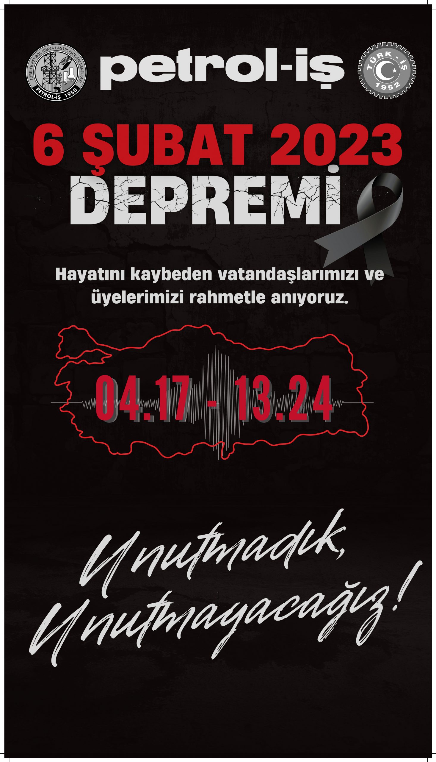 6 Şubat 2023’te Kahramanmaraş’ın Pazarcık ve Elbistan ilçelerinde 9 saat arayla yaşanan 7.7 ve 7.6 büyüklüklerindeki depremler ve sonrasındaki artçı depremler 15 milyona yakın nüfusun yaşadığı 11 ilimizde (Kahramanmaraş, Hatay, Gaziantep, Adıyaman, Malatya, Kilis, Şanlıurfa, Adana, Osmaniye, Diyarbakır, Elazığ) büyük bir yıkıma ve can kaybına yol açtı. Depremler neticesinde 50 binden fazla vatandaşımız hayatını kaybetti, yüzbinlerce insanımız da yaralandı. Sendikamız üyesi 24 arkadaşımızı da bu depremlerde yitirdik.