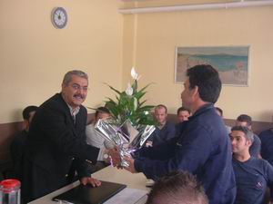 İŞÇİLERDEN BAŞKANA T.İ.S. ÇİÇEĞİ 20.05.2005 9 Şubat 2005 tarihinde görüşmelere başlanan DYO A.Ş. – DYOSAD A.Ş.- DYO Matbaa Mürekkepleri A.Ş. işyerlerini kapsayan TİS görüşmeleri 20 Mayıs 2005 tarihinde imzalanmıştır.Bornova Kampusünde bulunan DYOSAD ve Matbaa Mürekkepleri işçileri toplu iş sözleşmesinden doğan memnuniyetlerini Şube Başkanı A.Gani GÜNDOĞDU’ya alkışlarla çiçek vererek göstermişlerdir.