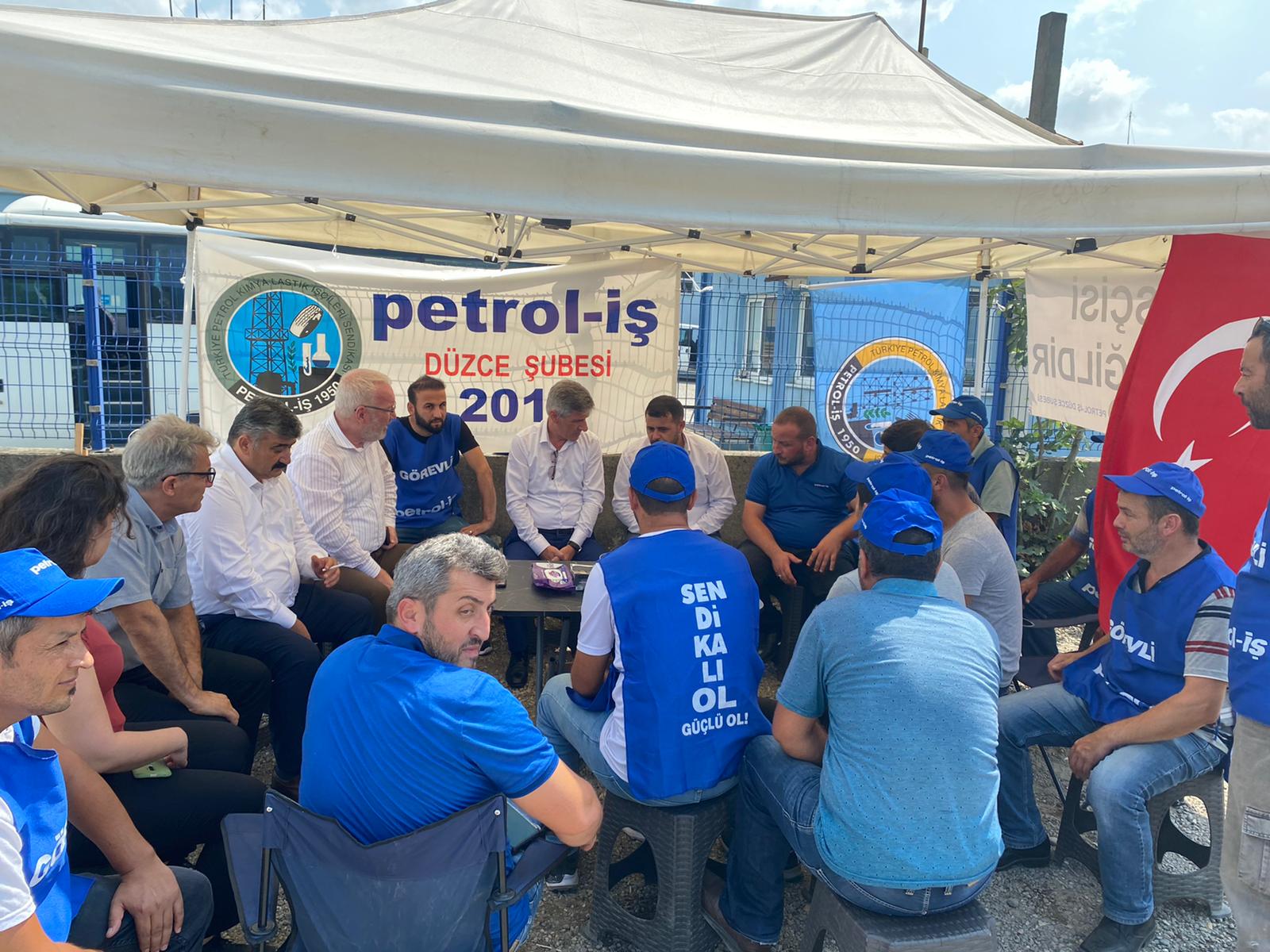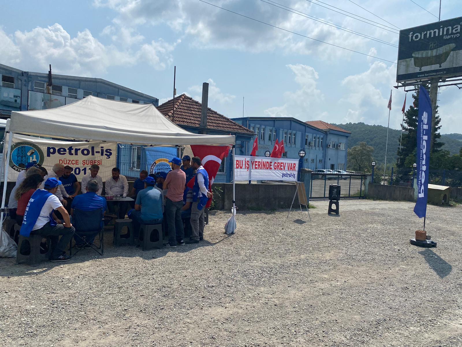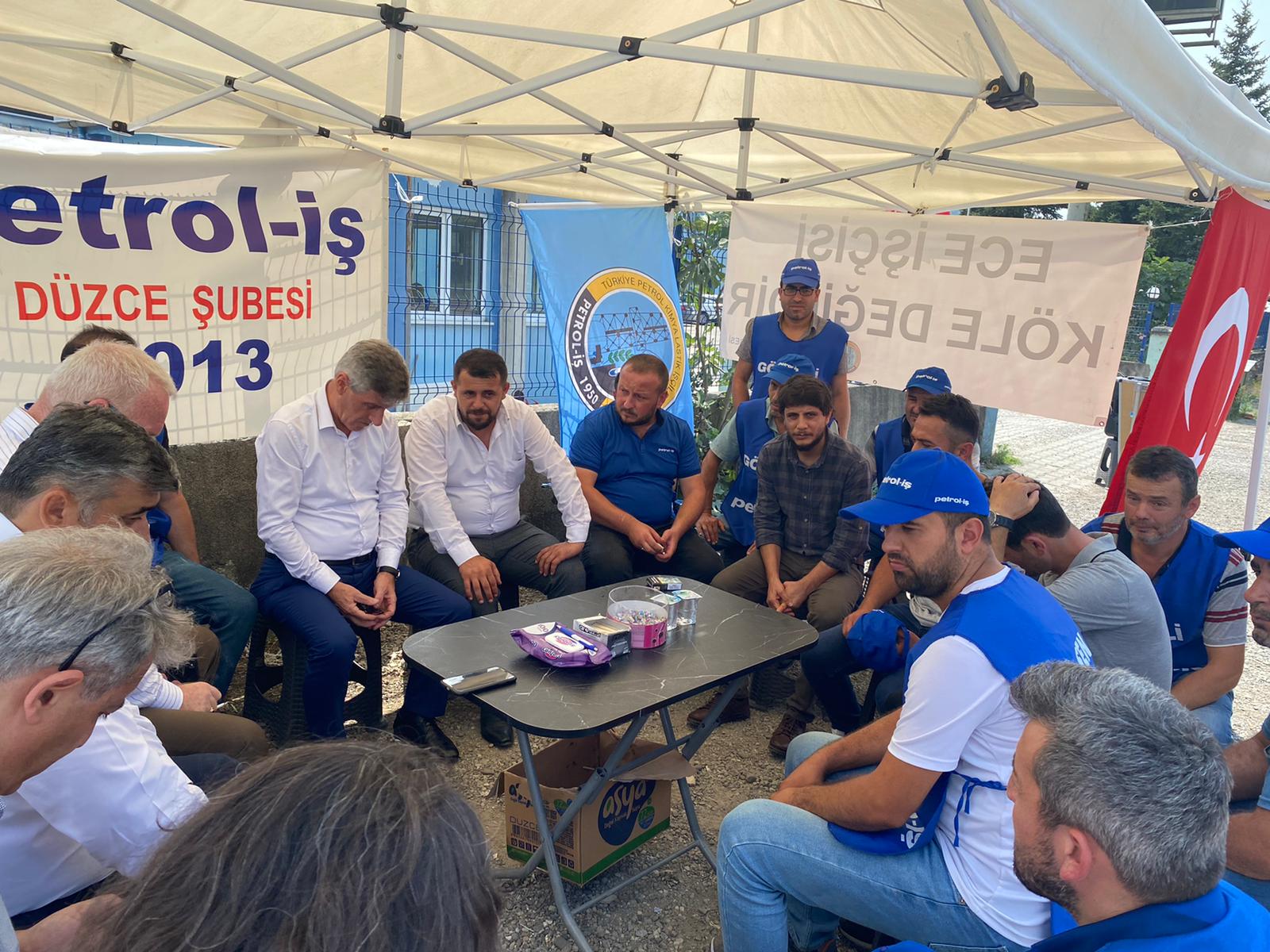 Düzce Şubemize bağlı Ece Seramik işyerinde başlayan grevin 30. gününde Şube Yönetimini temsilen Şube Başkanı Ali Işık, Başkan Yardımcısı Mustafa Emel ve Başkan Yardımcısı Fırat Ay da grev alanındaydılar.